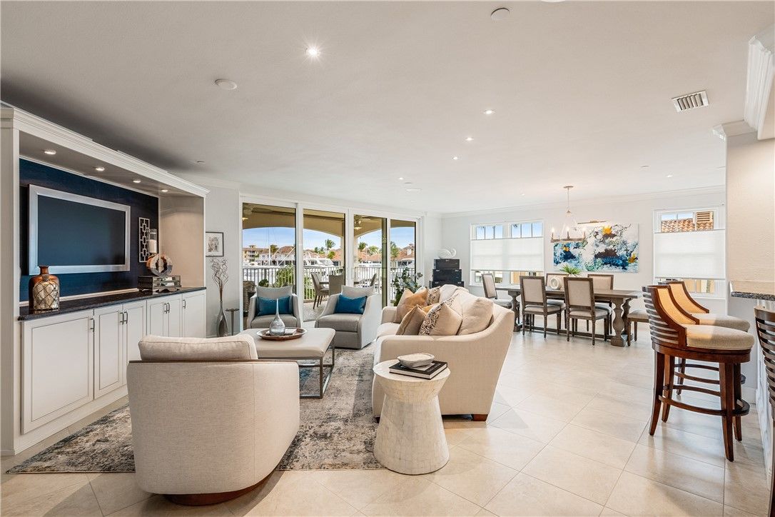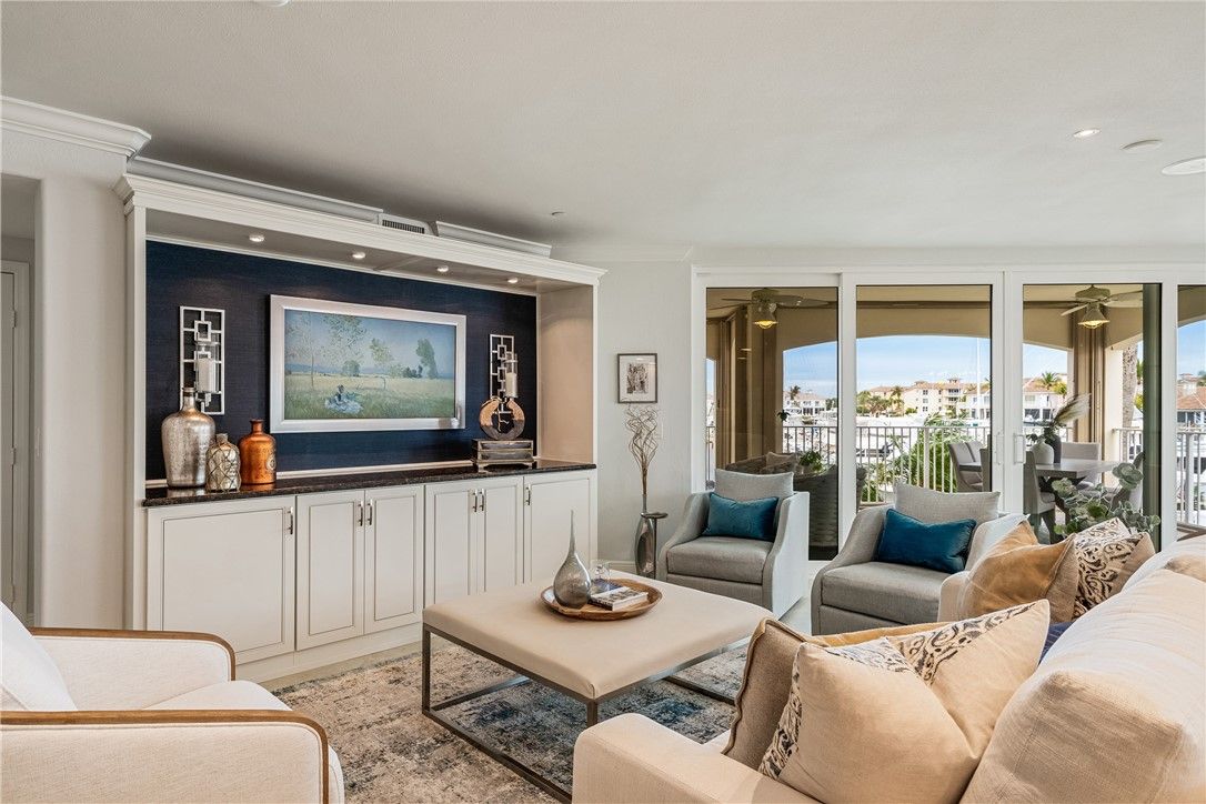 This stunning waterfront condo is a rare find with many upgrades and a modern open floor plan, private elevator, 2 car garage and air-conditioned storage room. The spacious primary bedroom suite and separate guest wing is a wonderful feature. The wraparound balcony is the ideal spot to enjoy sunrise and sunset views. Come and enjoy the wonderful Grand Harbor lifestyle.