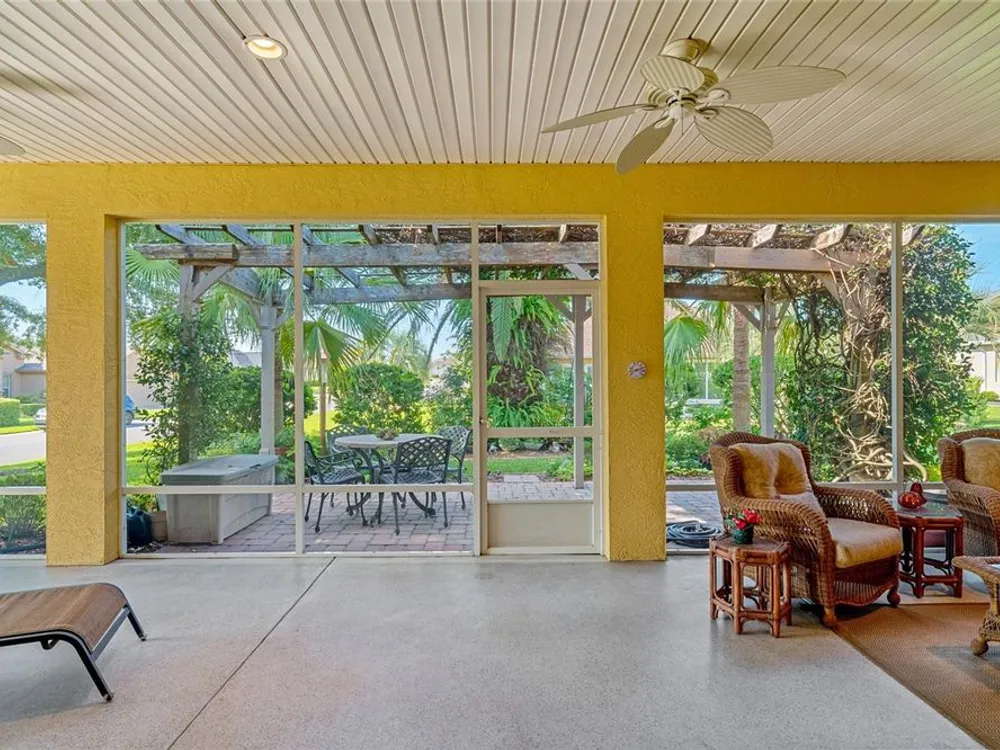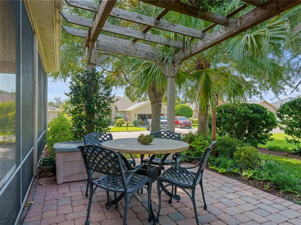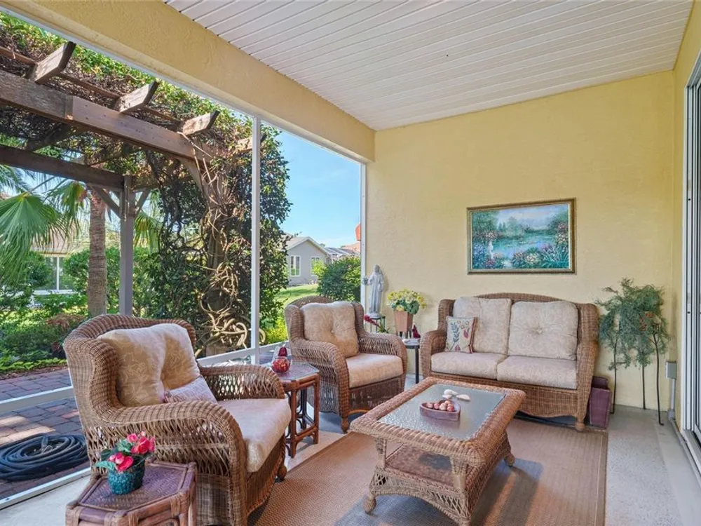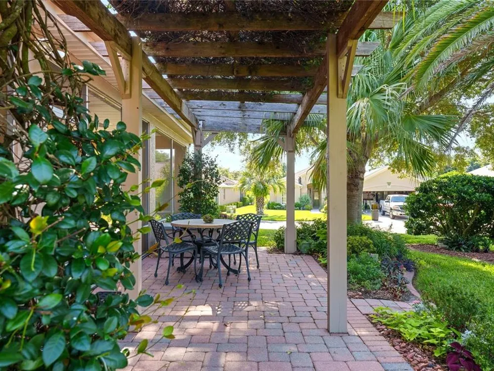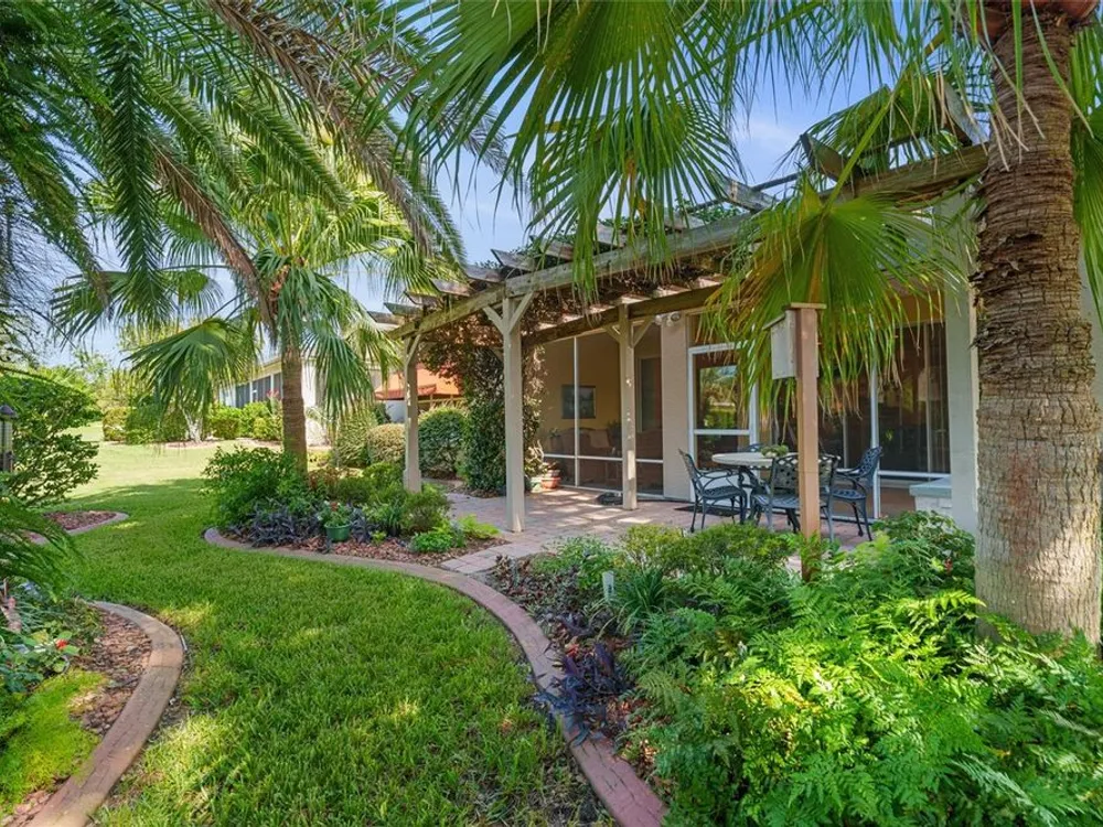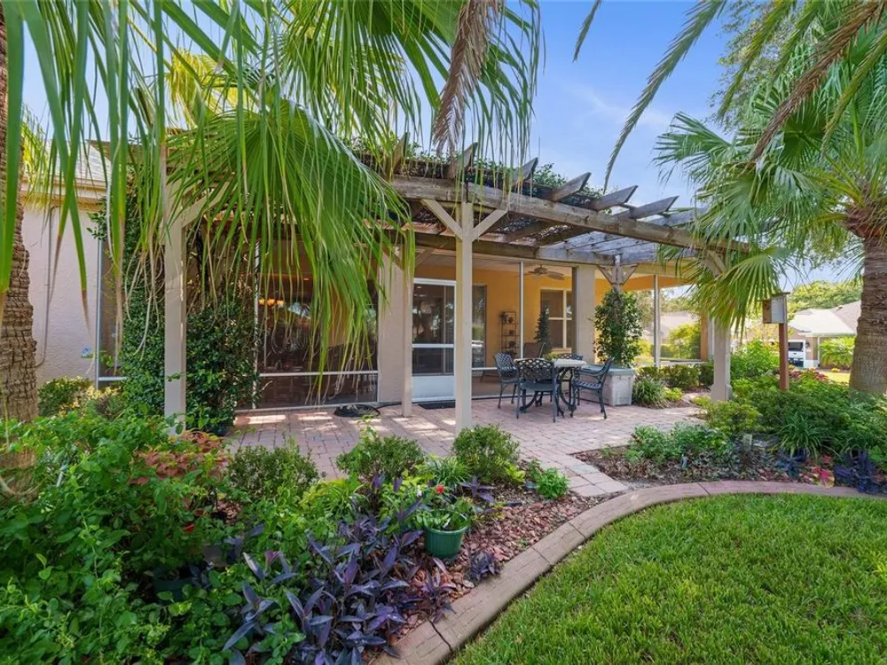 Brand New on the Market – Popular Granville Model with Den, Gourmet Kitchen & Private Backyard Oasis! This ever-popular 2 bedroom, 2 bath plus den Granville model is one you’ll want to see right away! From the beautifully landscaped front yard to the thoughtfully designed interior, this home blends comfort, function, and style.Step through the twin front doors into a spacious open floor plan featuring a gourmet kitchen with granite counters, tiled backsplash, stainless steel appliances, an island with hanging pot rack, and abundant cabinet space — all overlooking the great room, so you’re always part of the gathering while entertaining. The great room features solid wood flooring, recessed lighting, and a flexible area perfect for formal dining. Flooring includes tile in the kitchen, bathrooms, and den, with carpet in both bedrooms. The den with French doors makes an ideal office, hobby space, or extra guest room with added privacy. The utility room is currently set up as a large walk-in closet, with laundry relocated to the garage. Additional features include a whole-house water filtration system, new roof (2021), HVAC (2012), re-piped plumbing, and an assumable termite bond. Enjoy peaceful outdoor living in the screened lanai, which opens to a 10x20 patio covered by a pergola, surrounded by lush landscaping and a variety of plants and shrubs that create a private backyard retreat.Some furniture is available for purchase — inquire for details. This beautifully maintained home has it all. Don’t miss your chance to own it — schedule your private showing today!