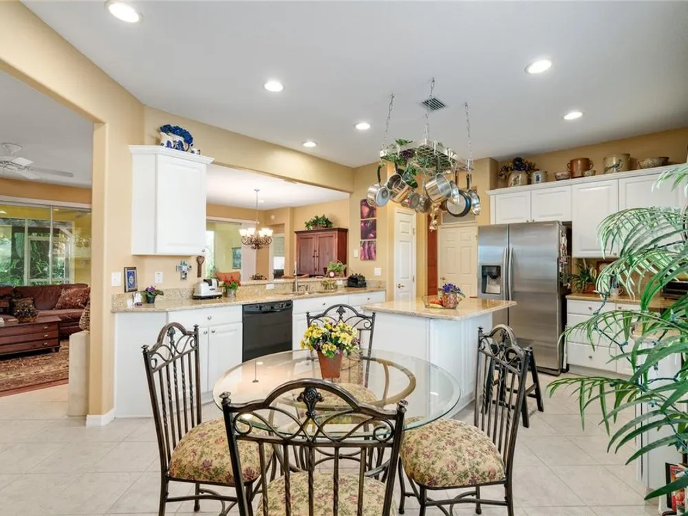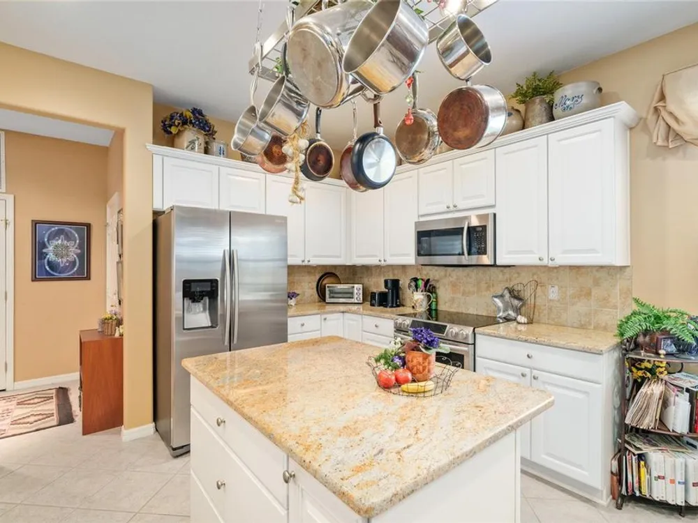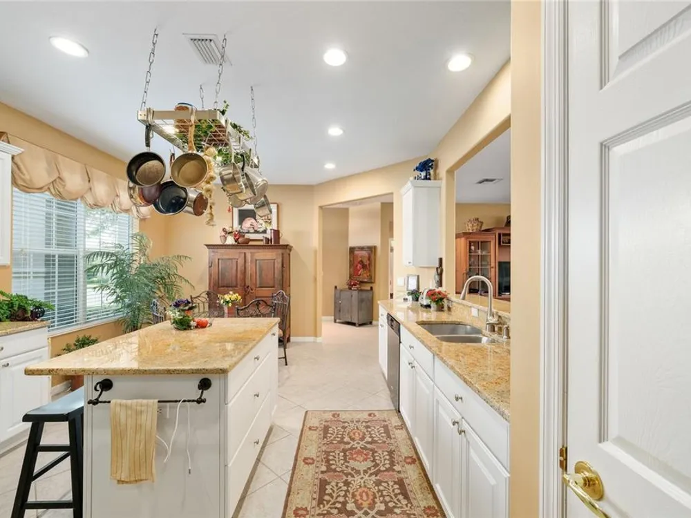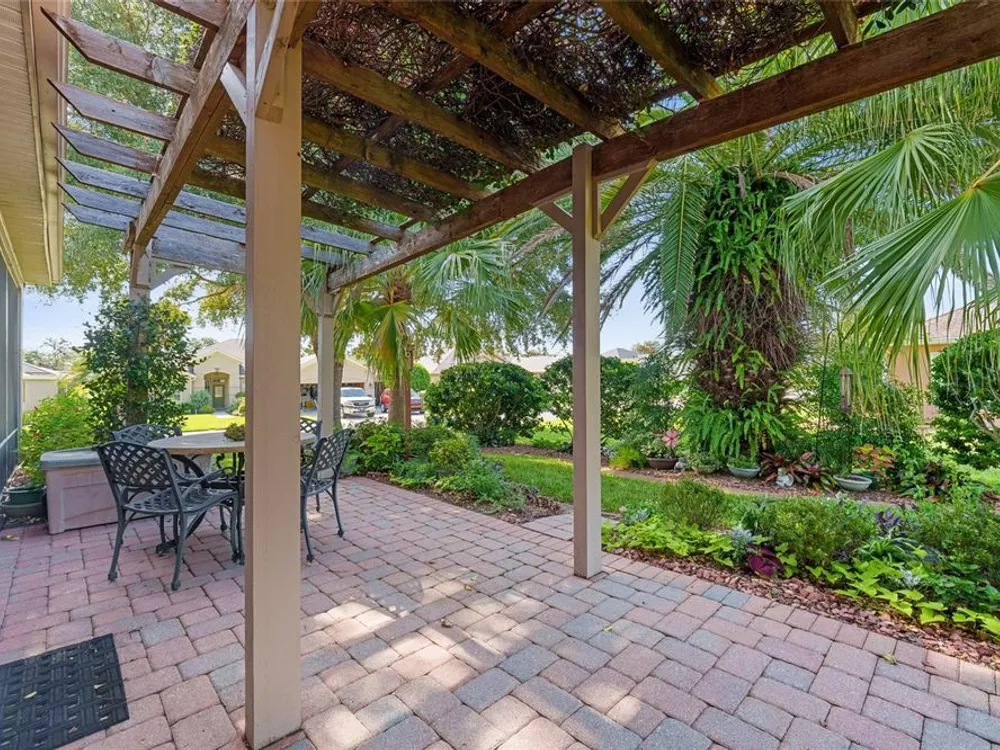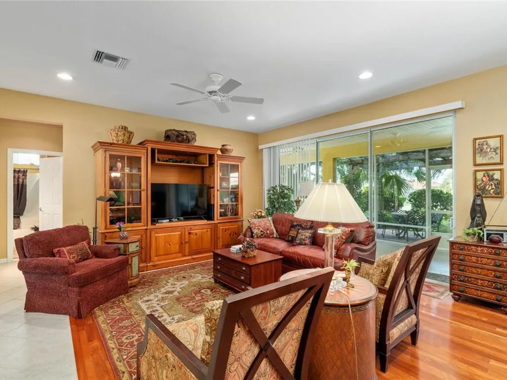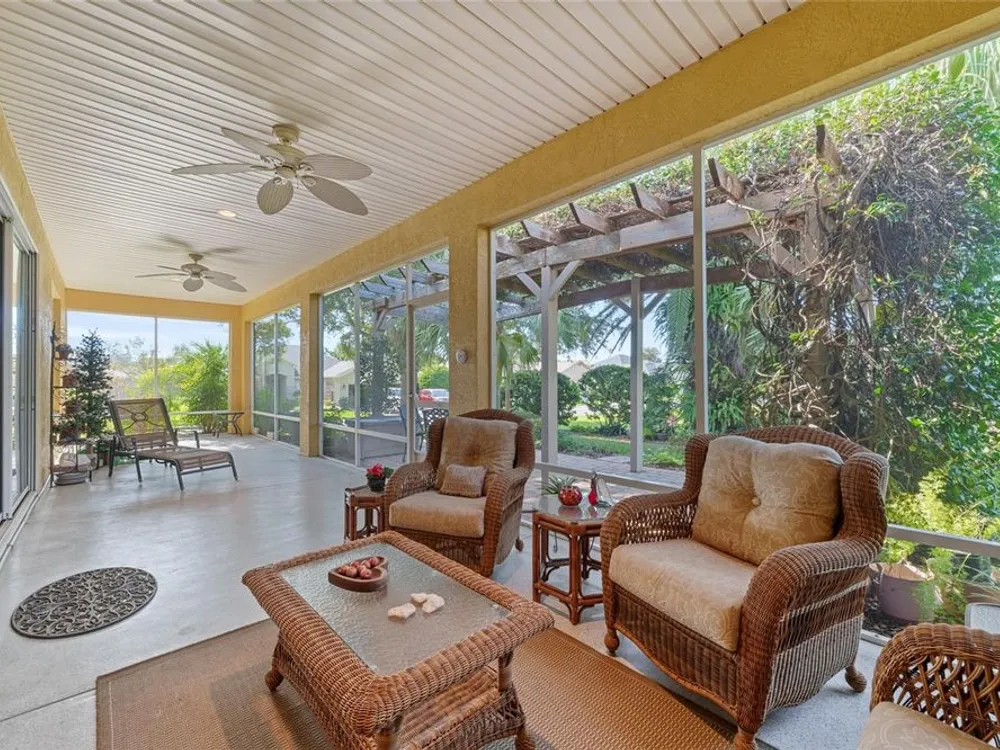 Brand New on the Market – Popular Granville Model with Den, Gourmet Kitchen & Private Backyard Oasis! This ever-popular 2 bedroom, 2 bath plus den Granville model is one you’ll want to see right away! From the beautifully landscaped front yard to the thoughtfully designed interior, this home blends comfort, function, and style.Step through the twin front doors into a spacious open floor plan featuring a gourmet kitchen with granite counters, tiled backsplash, stainless steel appliances, an island with hanging pot rack, and abundant cabinet space — all overlooking the great room, so you’re always part of the gathering while entertaining. The great room features solid wood flooring, recessed lighting, and a flexible area perfect for formal dining. Flooring includes tile in the kitchen, bathrooms, and den, with carpet in both bedrooms. The den with French doors makes an ideal office, hobby space, or extra guest room with added privacy. The utility room is currently set up as a large walk-in closet, with laundry relocated to the garage. Additional features include a whole-house water filtration system, new roof (2021), HVAC (2012), re-piped plumbing, and an assumable termite bond. Enjoy peaceful outdoor living in the screened lanai, which opens to a 10x20 patio covered by a pergola, surrounded by lush landscaping and a variety of plants and shrubs that create a private backyard retreat.Some furniture is available for purchase — inquire for details. This beautifully maintained home has it all. Don’t miss your chance to own it — schedule your private showing today!