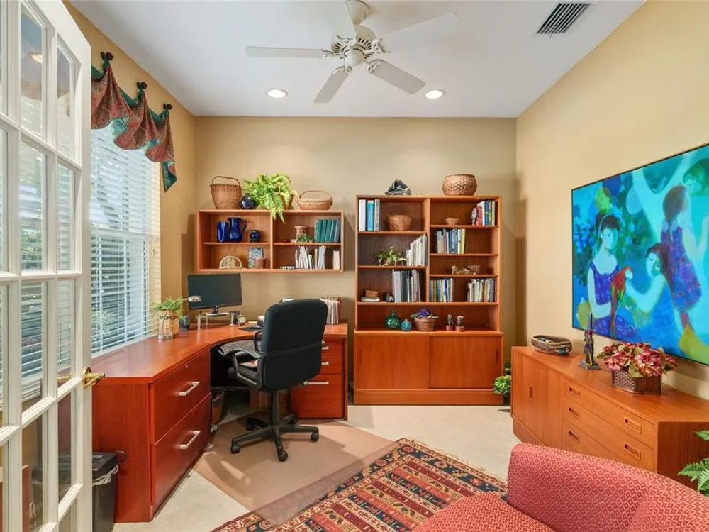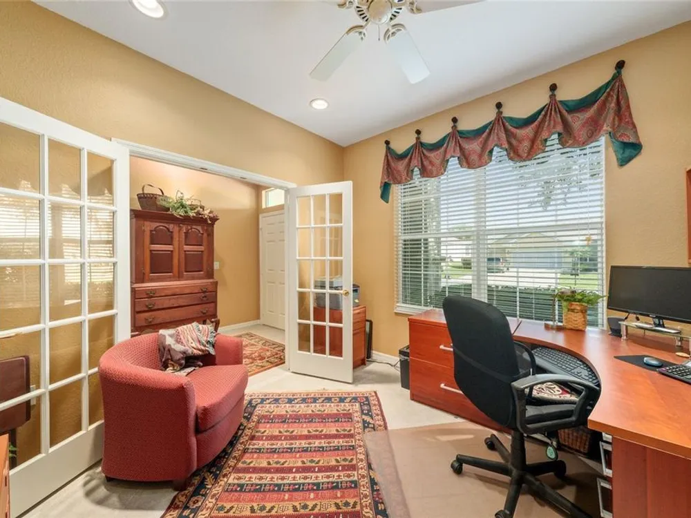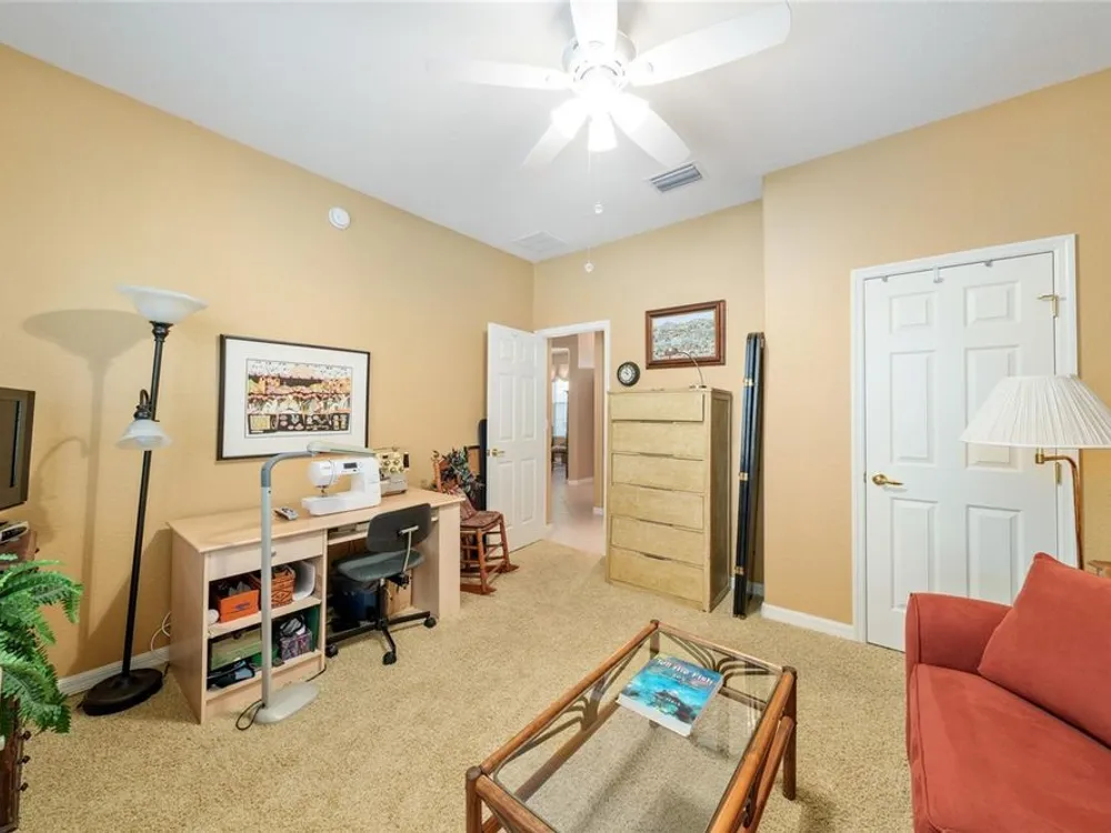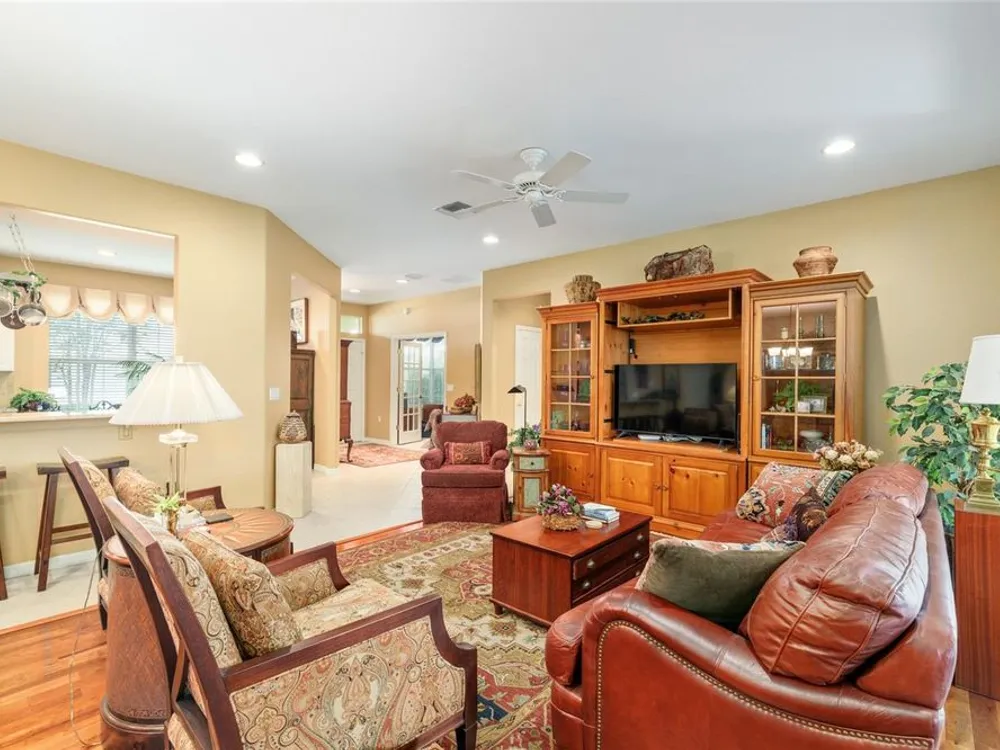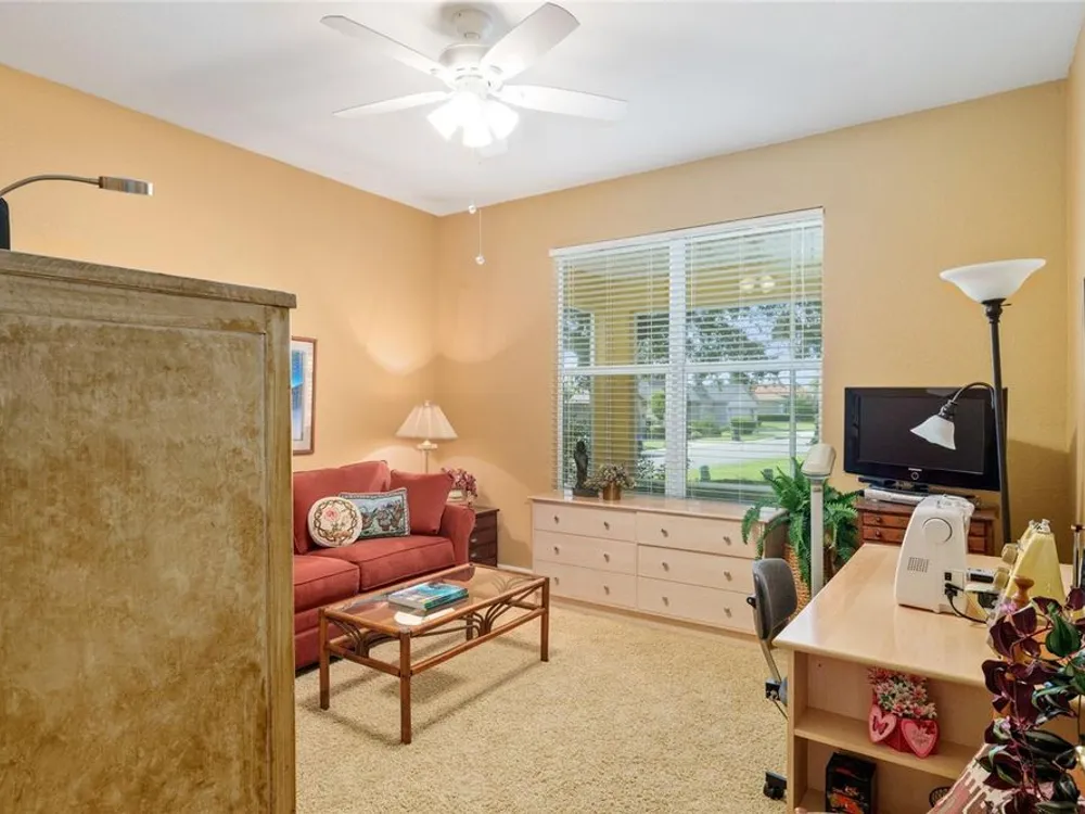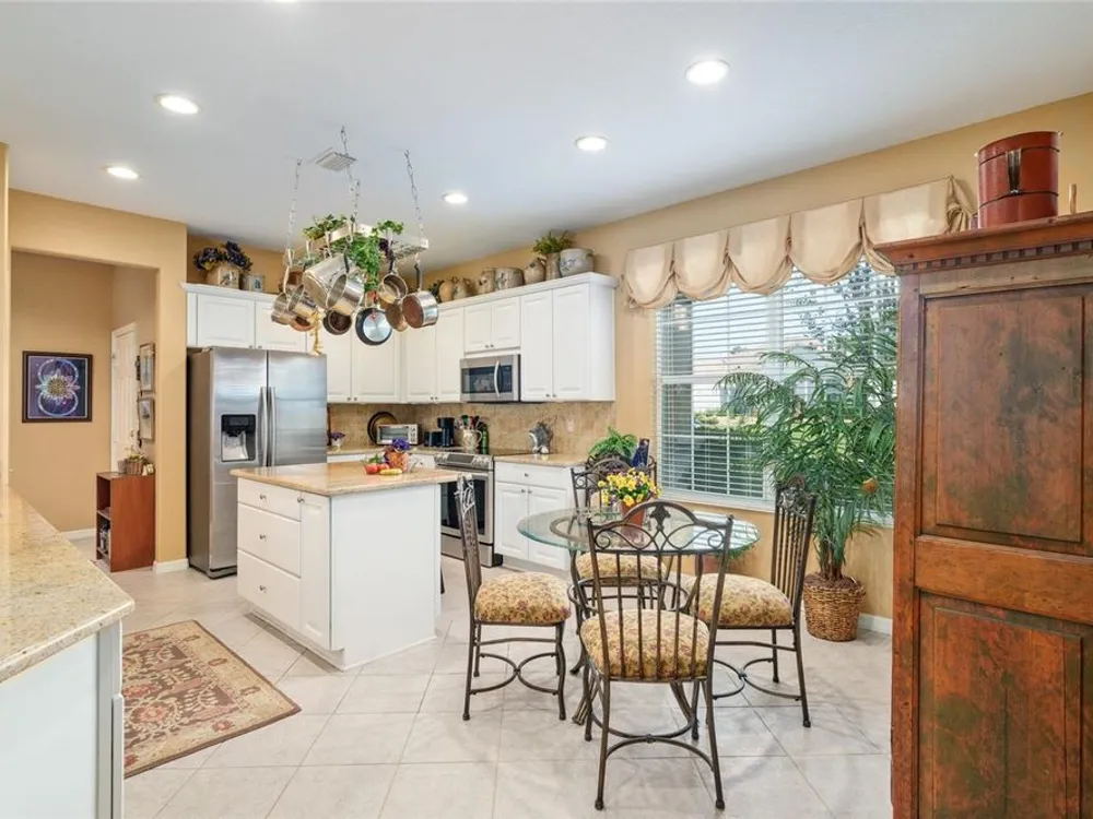 Brand New on the Market – Popular Granville Model with Den, Gourmet Kitchen & Private Backyard Oasis! This ever-popular 2 bedroom, 2 bath plus den Granville model is one you’ll want to see right away! From the beautifully landscaped front yard to the thoughtfully designed interior, this home blends comfort, function, and style.Step through the twin front doors into a spacious open floor plan featuring a gourmet kitchen with granite counters, tiled backsplash, stainless steel appliances, an island with hanging pot rack, and abundant cabinet space — all overlooking the great room, so you’re always part of the gathering while entertaining. The great room features solid wood flooring, recessed lighting, and a flexible area perfect for formal dining. Flooring includes tile in the kitchen, bathrooms, and den, with carpet in both bedrooms. The den with French doors makes an ideal office, hobby space, or extra guest room with added privacy. The utility room is currently set up as a large walk-in closet, with laundry relocated to the garage. Additional features include a whole-house water filtration system, new roof (2021), HVAC (2012), re-piped plumbing, and an assumable termite bond. Enjoy peaceful outdoor living in the screened lanai, which opens to a 10x20 patio covered by a pergola, surrounded by lush landscaping and a variety of plants and shrubs that create a private backyard retreat.Some furniture is available for purchase — inquire for details. This beautifully maintained home has it all. Don’t miss your chance to own it — schedule your private showing today!