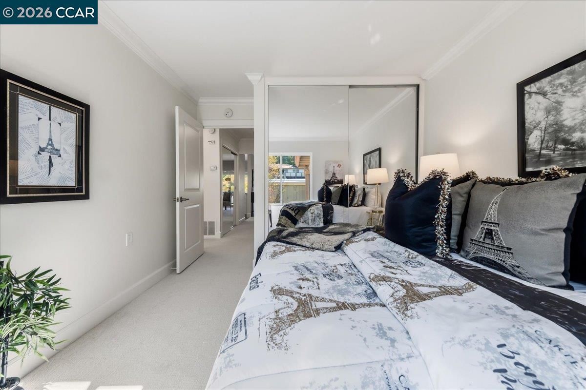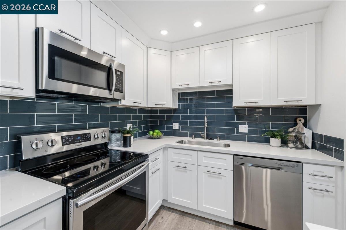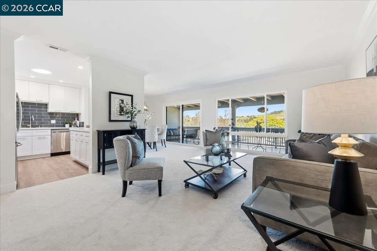 Experience refined living in this beautifully updated Sequoia co-op, where sophisticated style meets serene natural surroundings. Enjoy sweeping tree-lined and hillside views from your private open balcony, the perfect place to unwind. Inside, the home shines with fresh paint and plush new carpeting, complemented by a thoughtfully redesigned custom kitchen featuring crisp white cabinetry, quartz counters, striking blue subway tile backsplash, and sleek stainless-steel appliances. The elegant, white-tiled bathroom offers a modern stall shower, skylight for abundant natural light, and the convenience of an in-unit stacked washer and dryer. Dual pane windows, solid core doors, closet organizers with mirrored doors , crown and base moldings, and smooth ceilings add to the luxurious feel! Ideally situated for both relaxation and recreation, this home is just moments from Rossmoor dining, social venues, and amenities, including the nearby Event Center, Stanley Dollar clubhouse and swimming pool, fitness and sports facilities, scenic hiking trails, and so much more. Welcome to your new Rossmoor lifestyle!