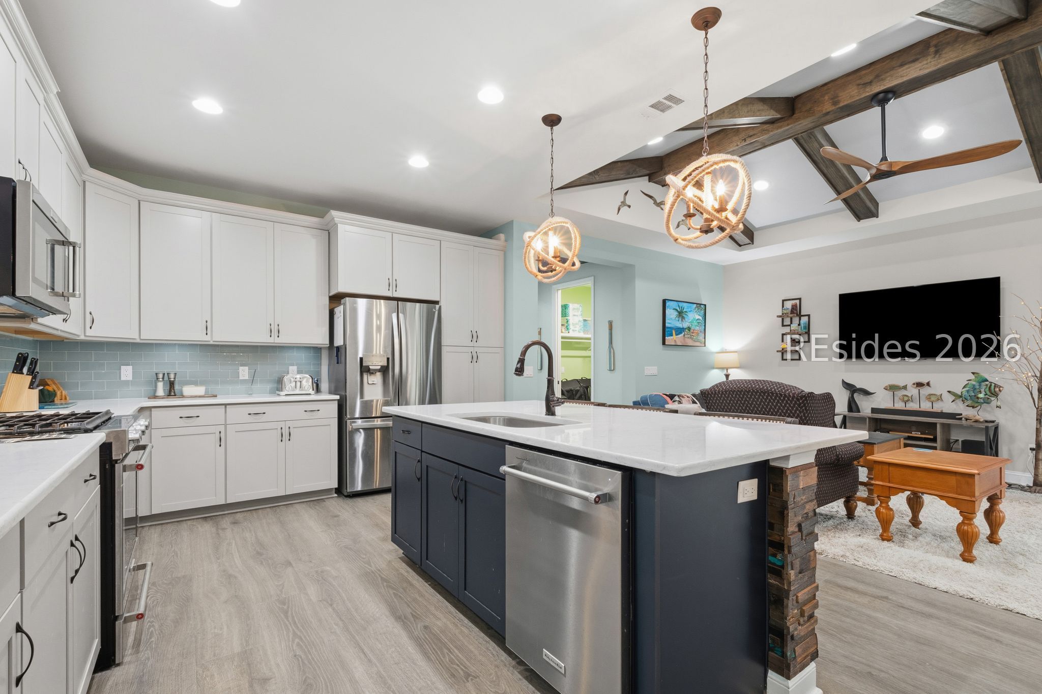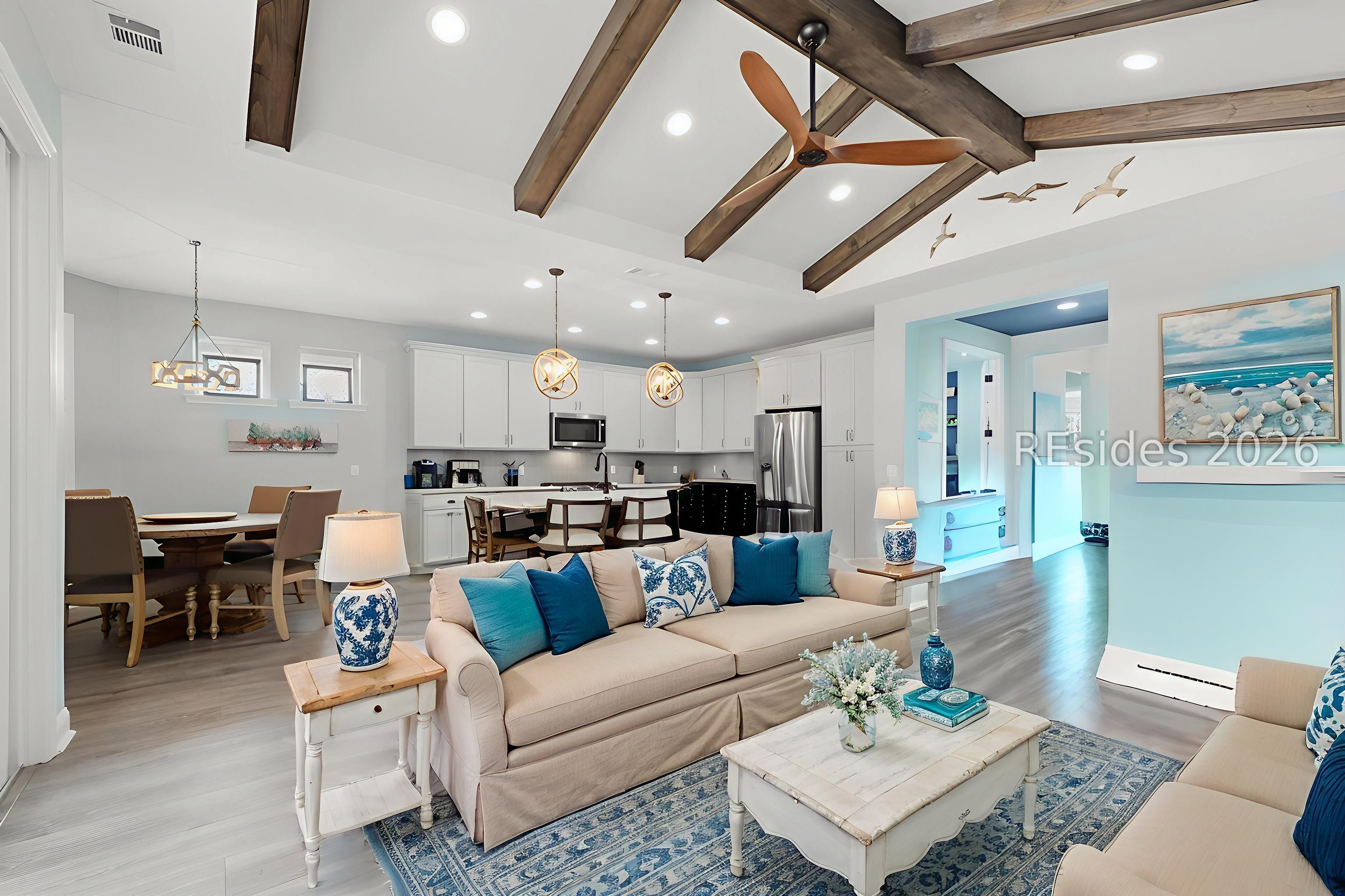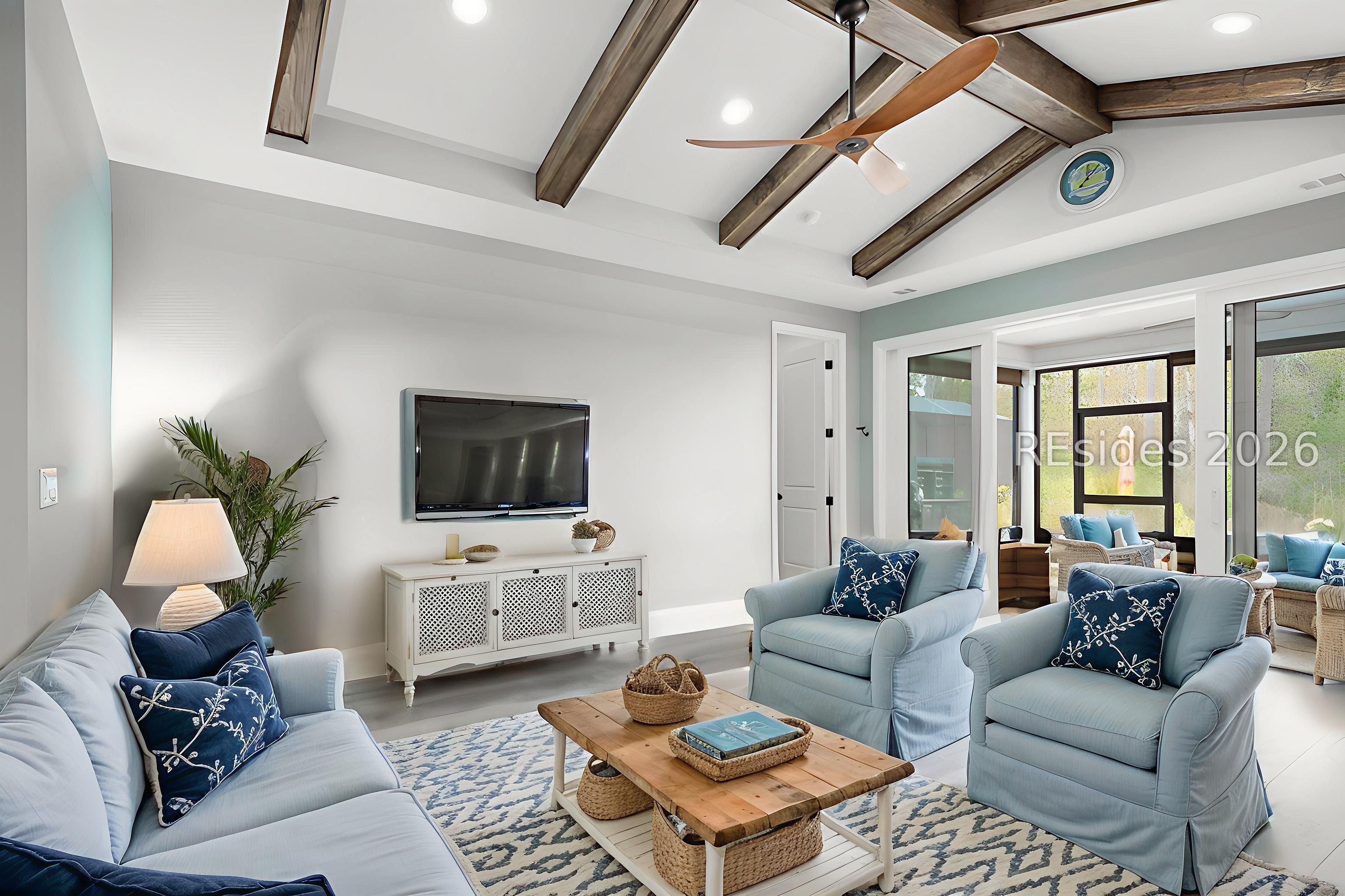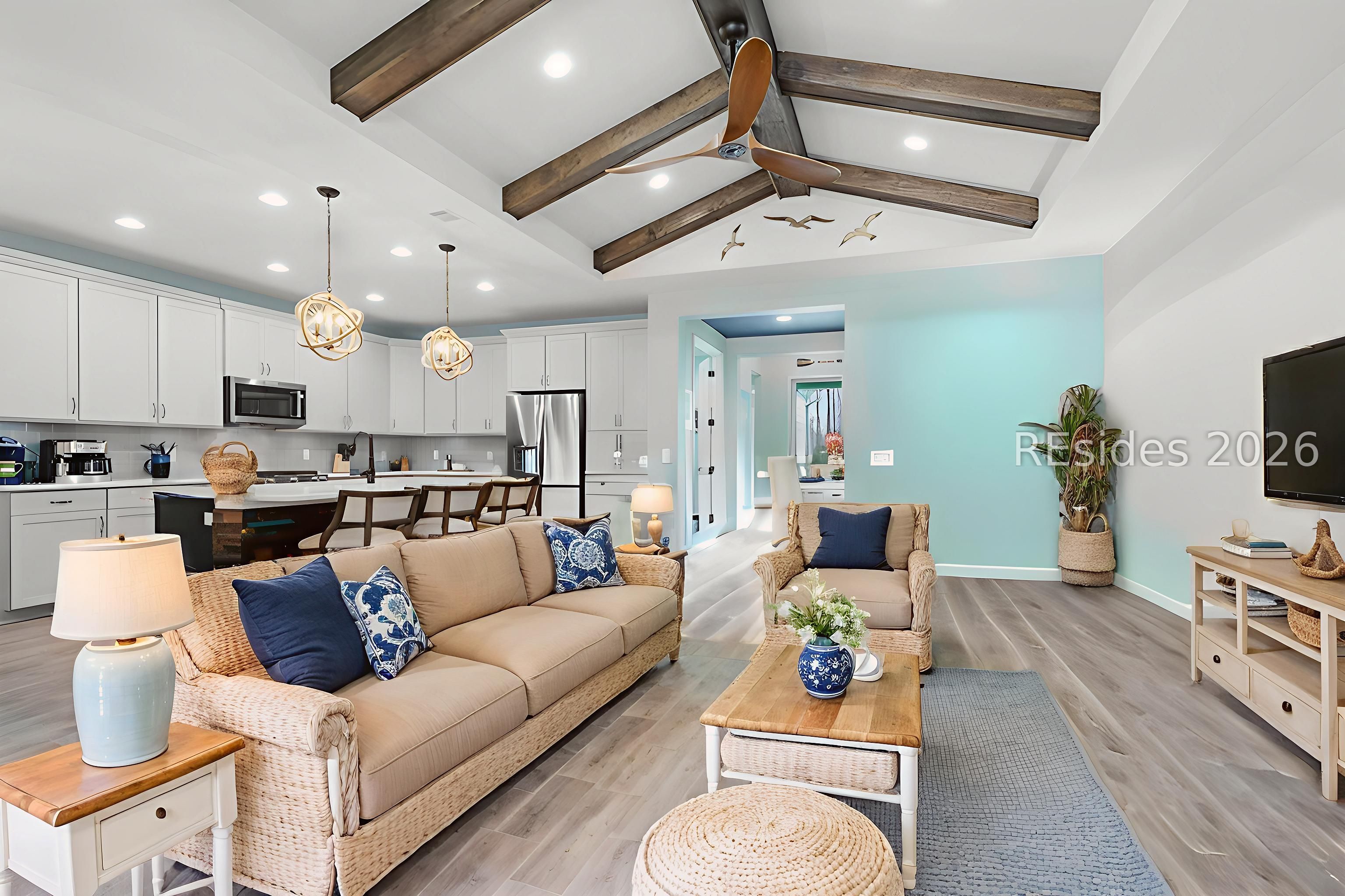 Rarely does the right home on the right lot become available in Latitude Margaritaville Hilton Head-and this one truly has it all. Perfectly positioned on a premium lagoon-to-woods homesite, this beautifully upgraded Coconut model offers exceptional privacy, tranquil views, and an expansive outdoor living space highlighted by a huge paver patio ideal for entertaining.Inside, the home features 1,684 sq ft of thoughtfully designed living space with 2 bedrooms, 2 full baths, plus a den/office. Upgraded laminate flooring runs throughout the home with tile baths and absolutely no carpet anywhere. The chef's kitchen showcases top-of-the-line KitchenAid appliances, gas range, upgraded cabinetry, stainless steel appliances, and quartz countertops. Custom upgrades continue with elegant moldings, exposed wood beams in the great room, and a coffered ceiling in the primary bedroom.The spa-inspired primary bath includes an oversized tiled shower with rain head. Outdoor living shines with a large screened lanai and expansive paver patio-both overlooking the peaceful lagoon and private forest backdrop. A spacious two-car garage completes this exceptional home, designed for comfort, style, and effortless entertaining.