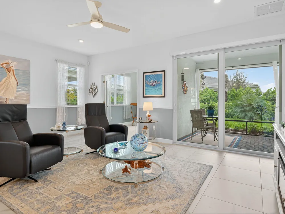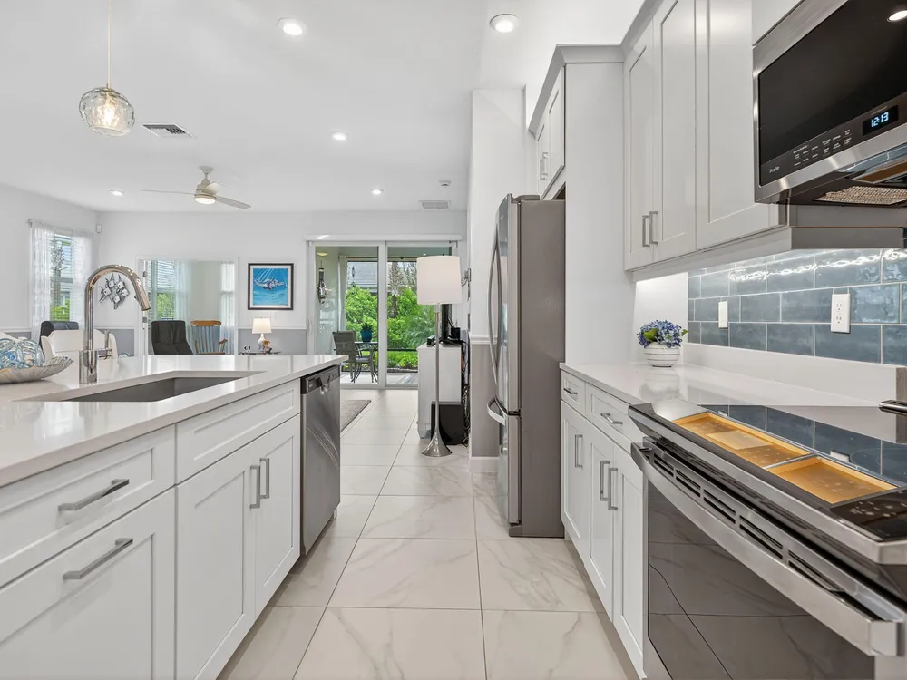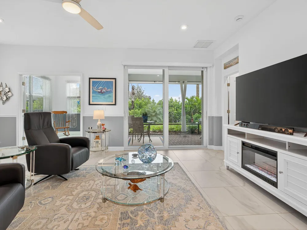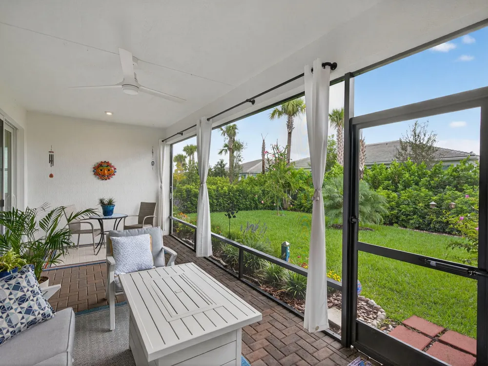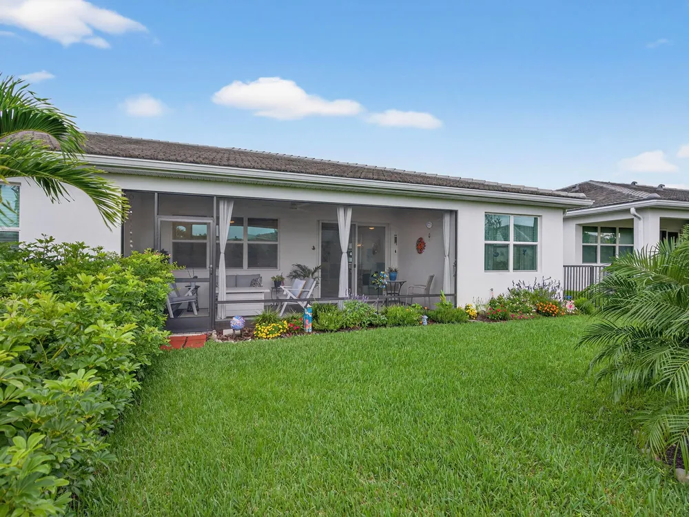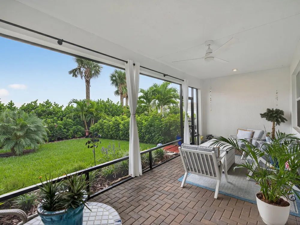 Great opportunity.Located in a secluded part of community.Not backing up to a shopping center or main road. This furnished contemporary Felicity model villa is a 2/2 plus a flex room with a 2 car garage w over $18,000. in additional upgrades after closing. Light & bright with open concept. Kitchen offers 42'' soft close cabinets w brand new electric stove & microwave. Gas hook up there if needed. Walk in pantry & large island. Quartz countertops w backsplash. Other upgrades includes include all tile throughout home, No carpet. Laundry room has high end front loading washer & dryer plus wet sink & cabinet & accessible from primary bedroom walk in closet or hallway. All hurricane impact windows & doors. Covered screened patio overlooks professionally landscaped fenced i