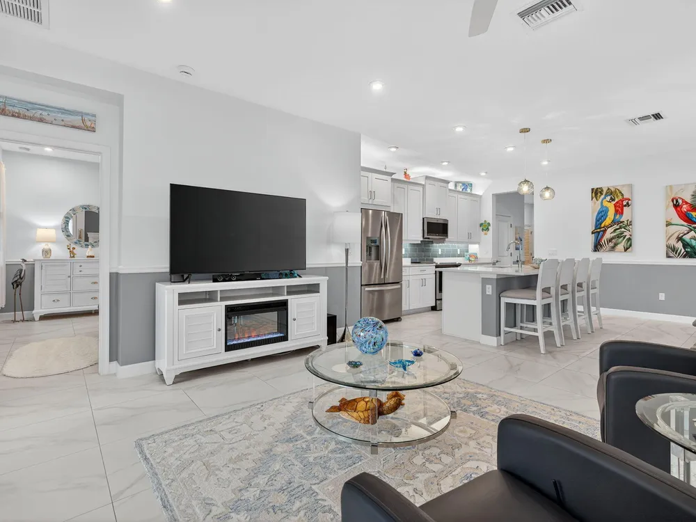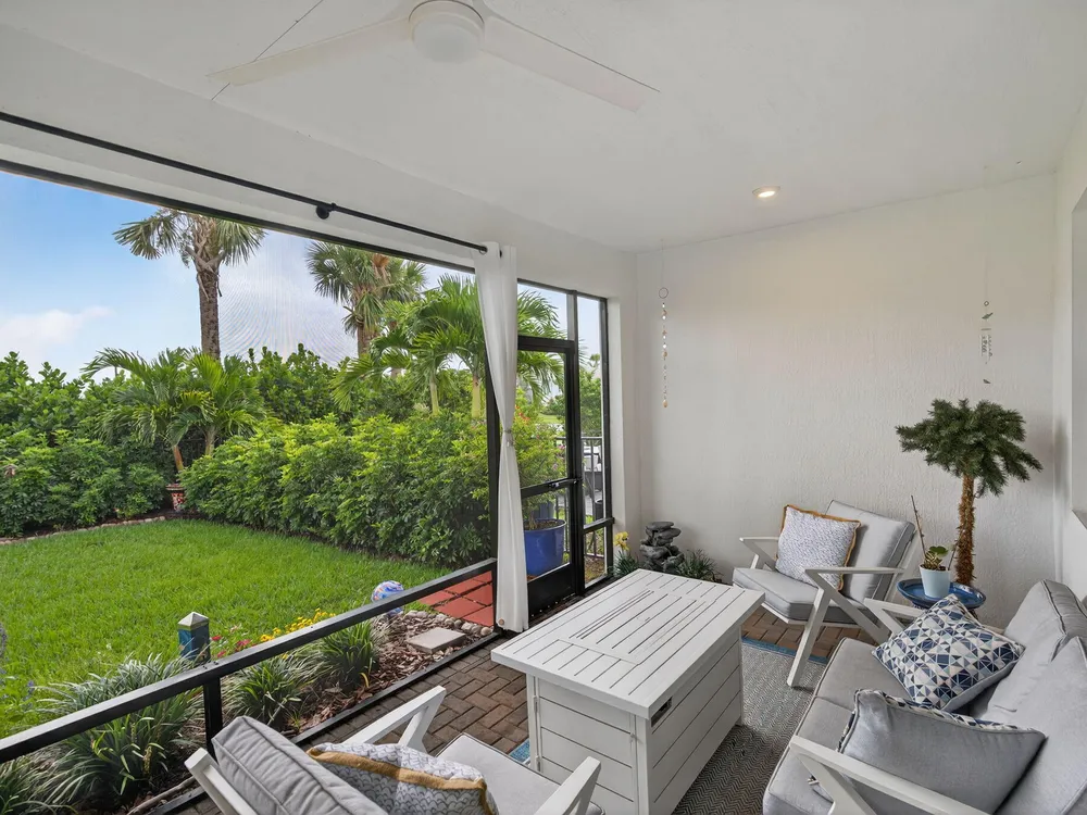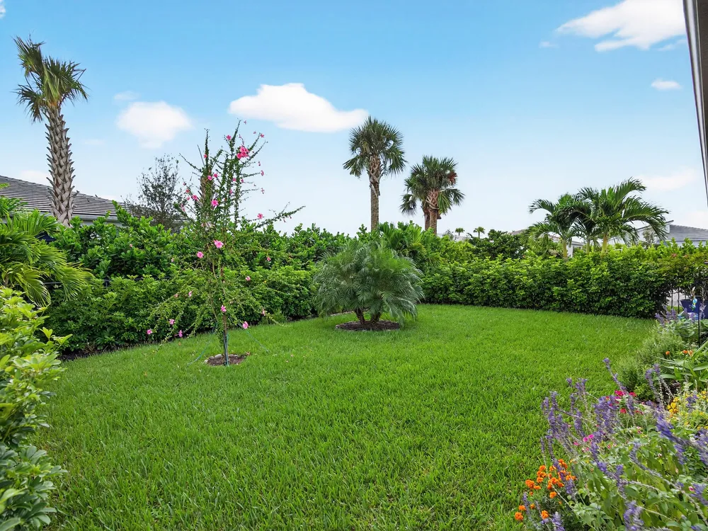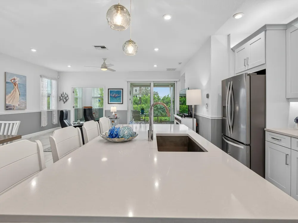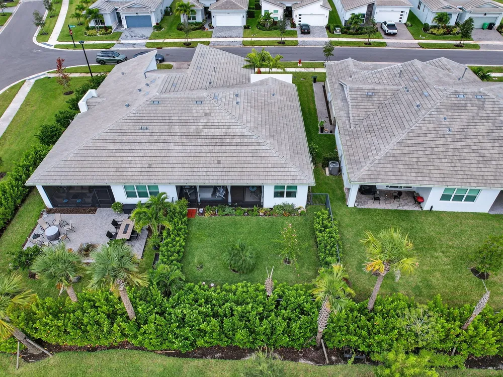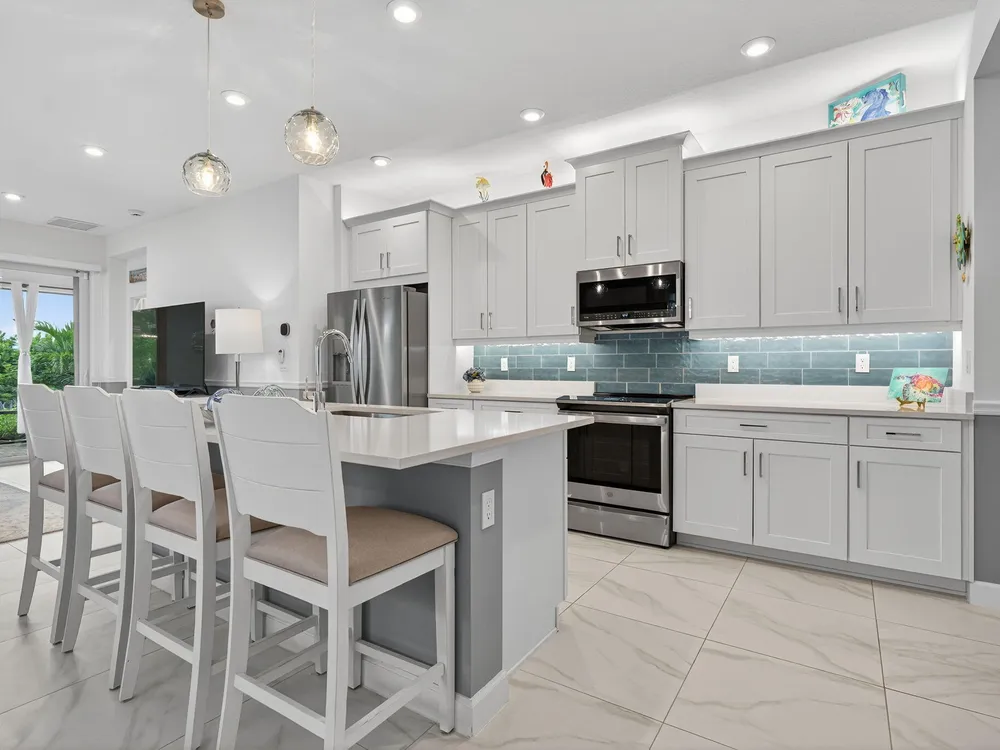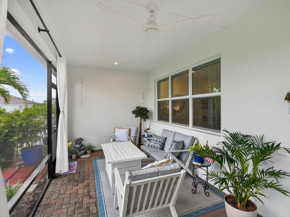 Great opportunity.Located in a secluded part of community.Not backing up to a shopping center or main road. This furnished contemporary Felicity model villa is a 2/2 plus a flex room with a 2 car garage w over $18,000. in additional upgrades after closing. Light & bright with open concept. Kitchen offers 42'' soft close cabinets w brand new electric stove & microwave. Gas hook up there if needed. Walk in pantry & large island. Quartz countertops w backsplash. Other upgrades includes include all tile throughout home, No carpet. Laundry room has high end front loading washer & dryer plus wet sink & cabinet & accessible from primary bedroom walk in closet or hallway. All hurricane impact windows & doors. Covered screened patio overlooks professionally landscaped fenced i