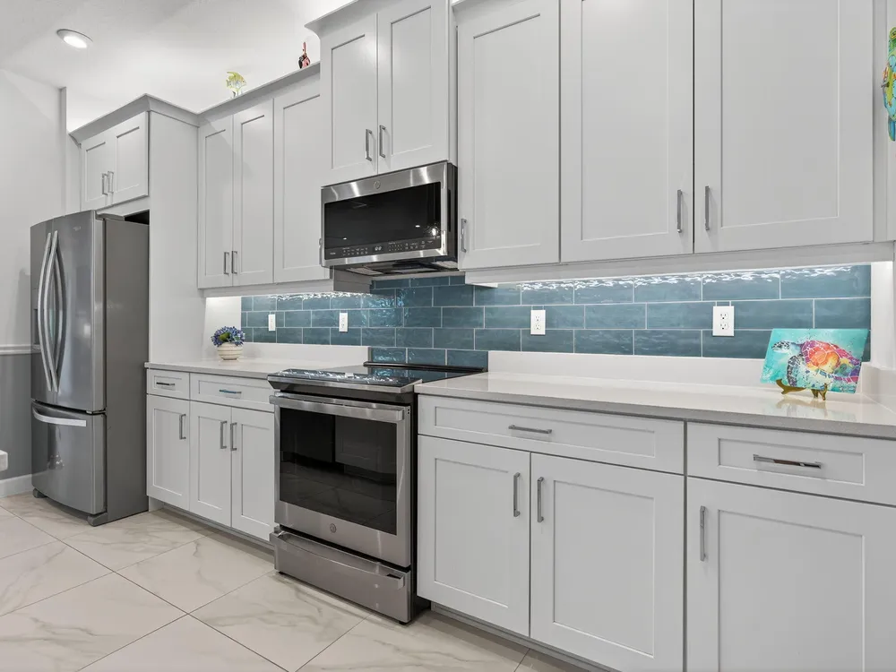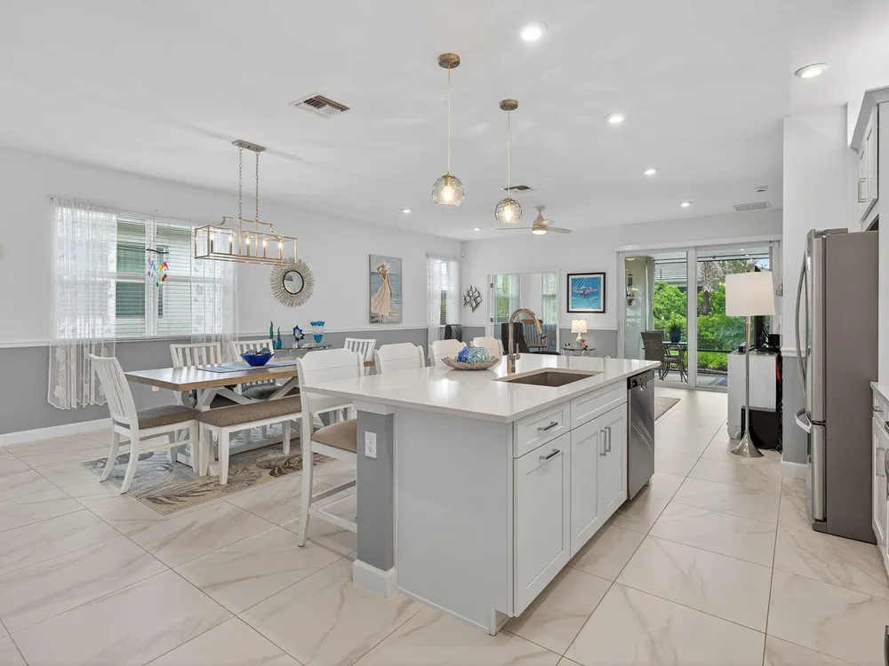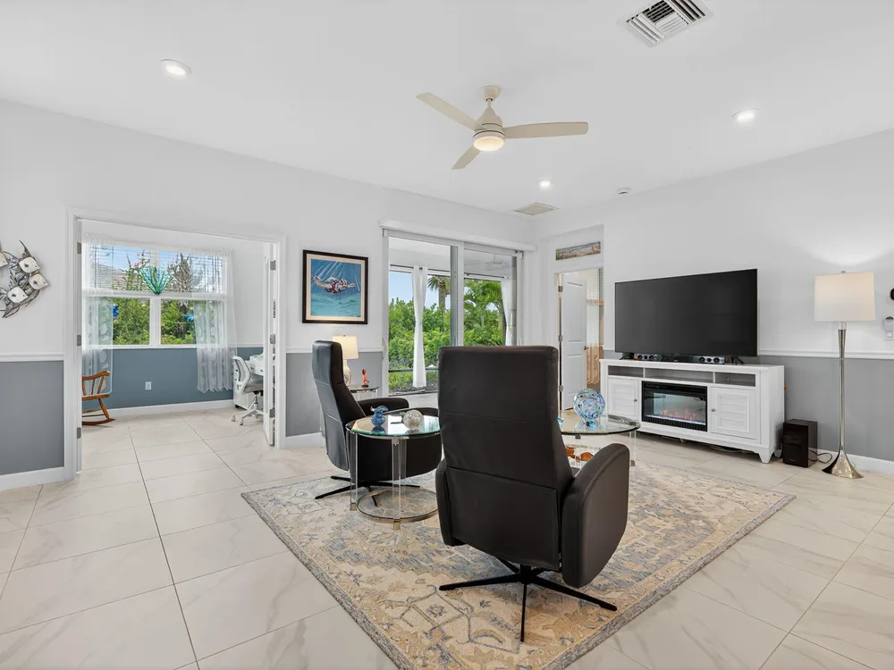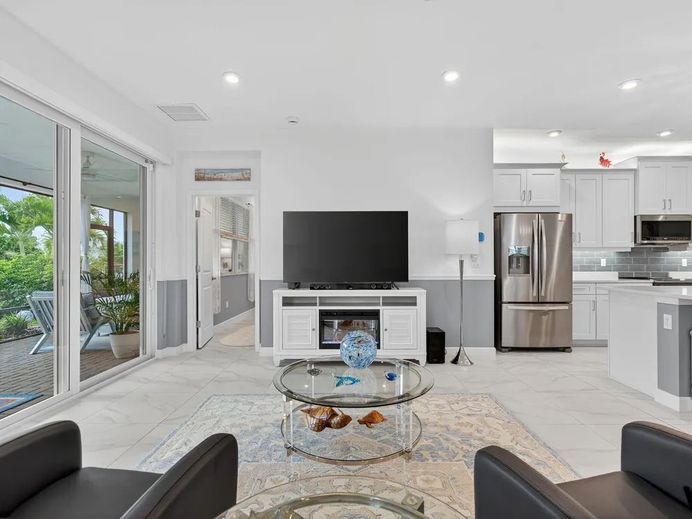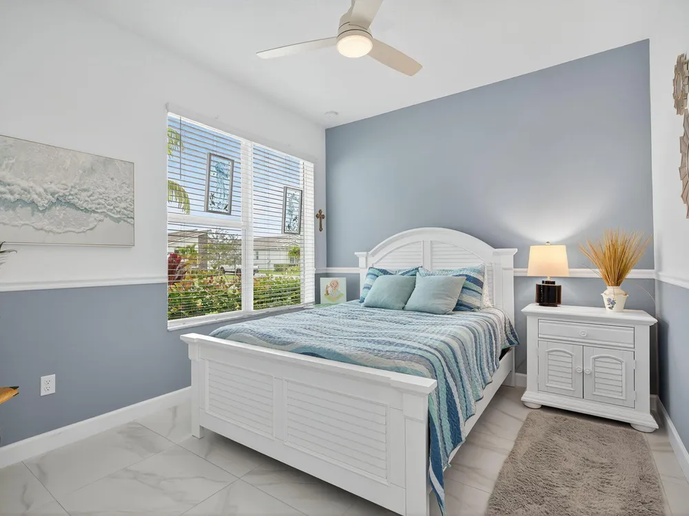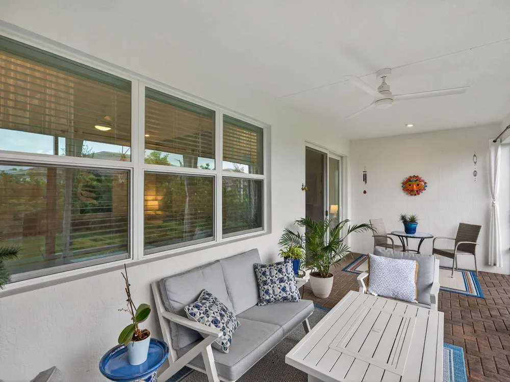 Great opportunity.Located in a secluded part of community.Not backing up to a shopping center or main road. This furnished contemporary Felicity model villa is a 2/2 plus a flex room with a 2 car garage w over $18,000. in additional upgrades after closing. Light & bright with open concept. Kitchen offers 42'' soft close cabinets w brand new electric stove & microwave. Gas hook up there if needed. Walk in pantry & large island. Quartz countertops w backsplash. Other upgrades includes include all tile throughout home, No carpet. Laundry room has high end front loading washer & dryer plus wet sink & cabinet & accessible from primary bedroom walk in closet or hallway. All hurricane impact windows & doors. Covered screened patio overlooks professionally landscaped fenced i
