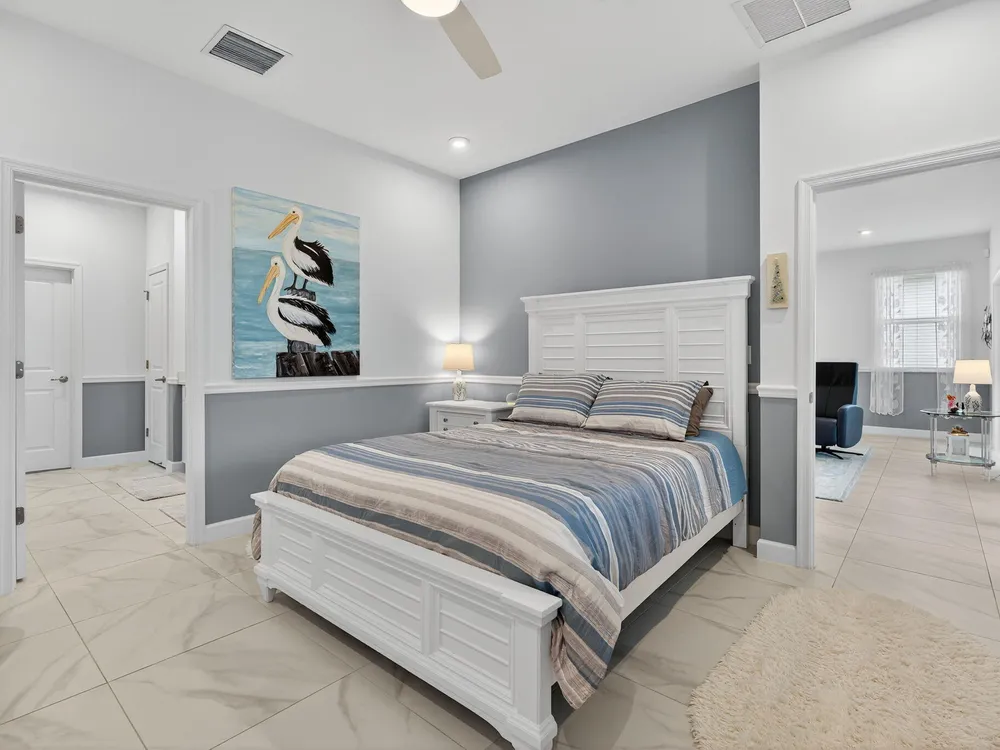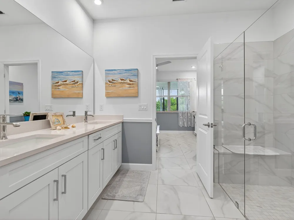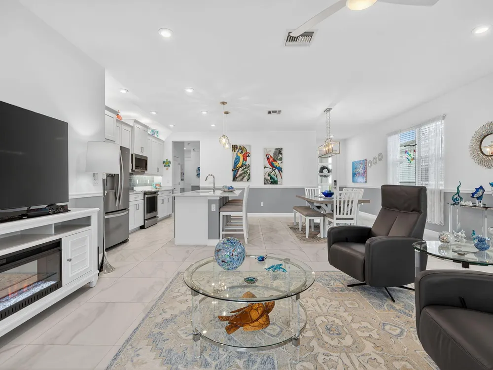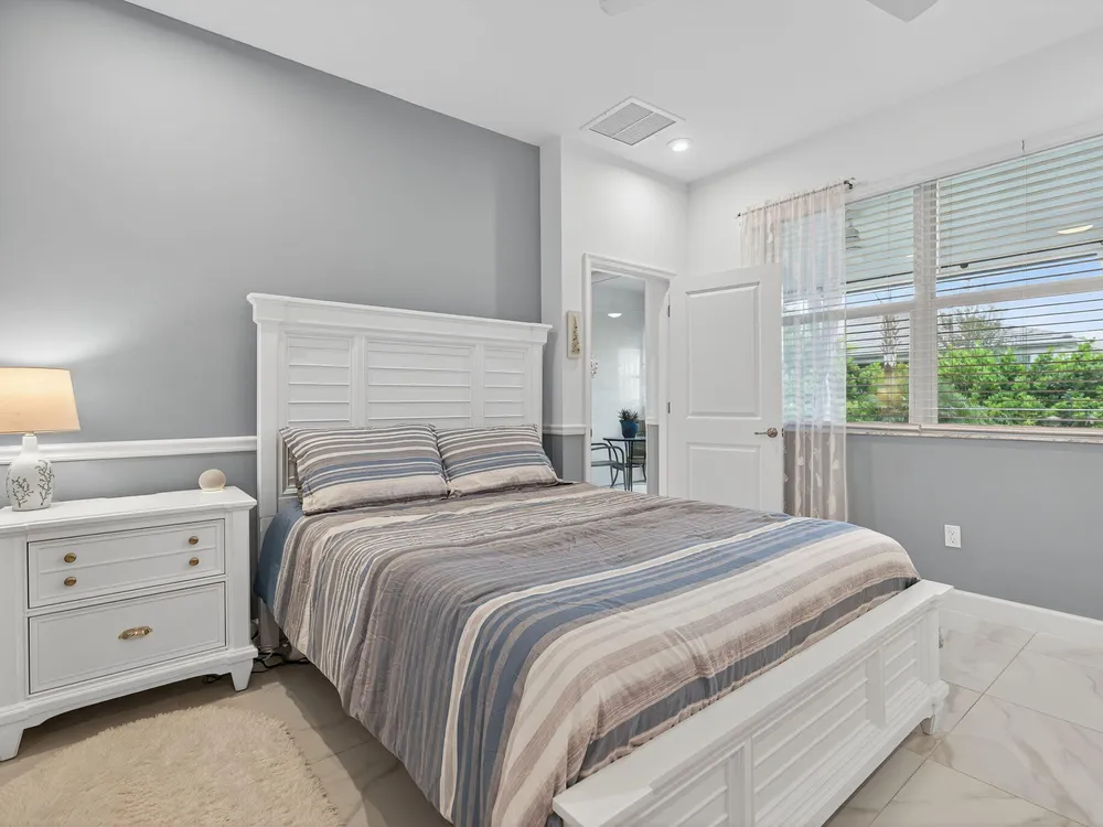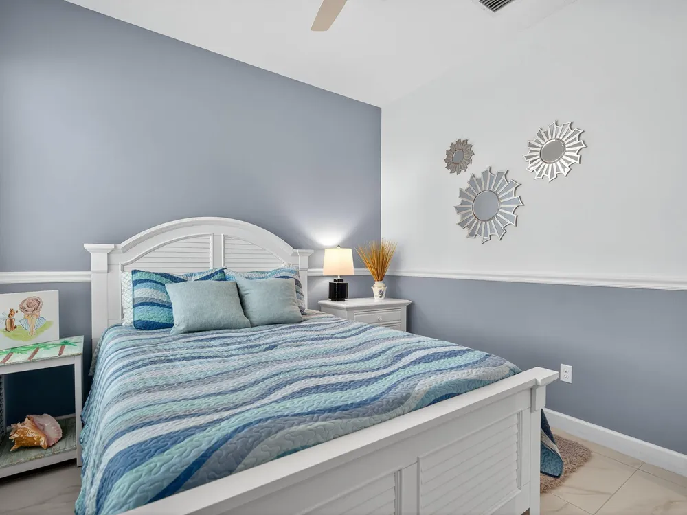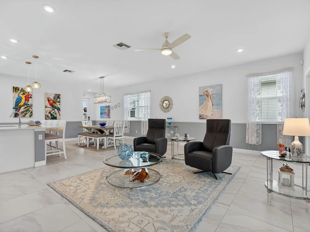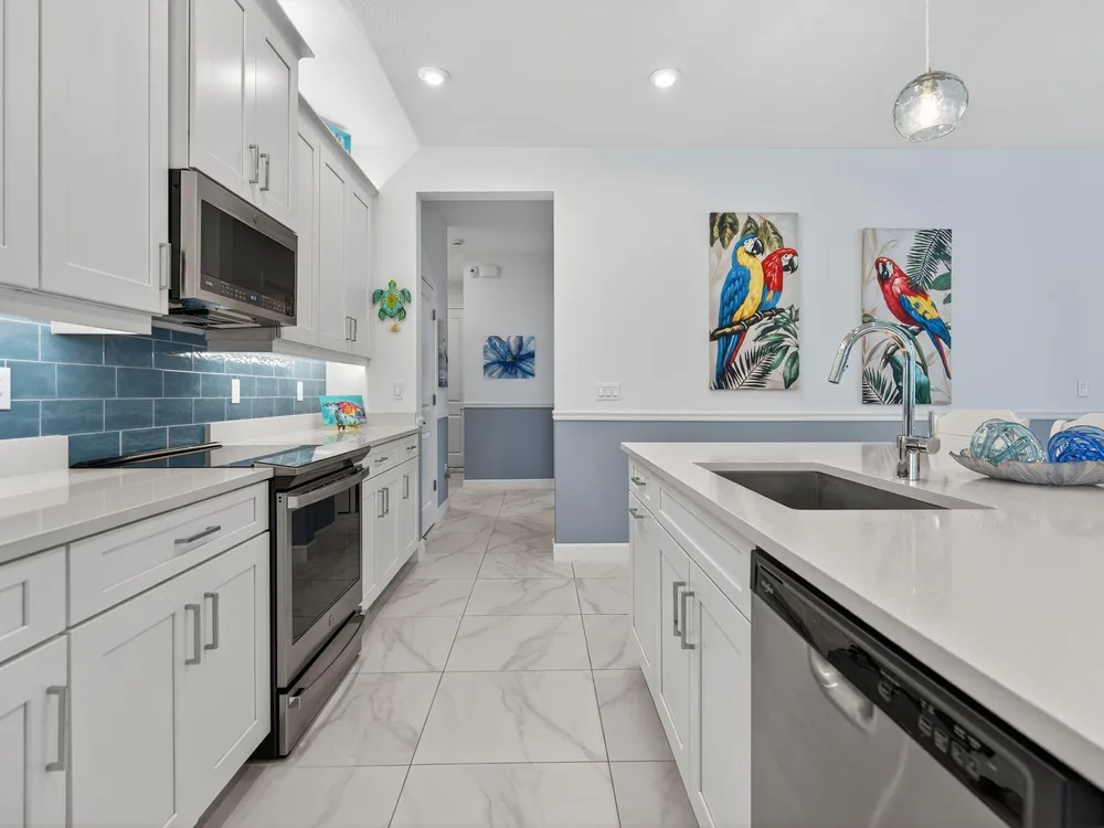 Great opportunity.Located in a secluded part of community.Not backing up to a shopping center or main road. This furnished contemporary Felicity model villa is a 2/2 plus a flex room with a 2 car garage w over $18,000. in additional upgrades after closing. Light & bright with open concept. Kitchen offers 42'' soft close cabinets w brand new electric stove & microwave. Gas hook up there if needed. Walk in pantry & large island. Quartz countertops w backsplash. Other upgrades includes include all tile throughout home, No carpet. Laundry room has high end front loading washer & dryer plus wet sink & cabinet & accessible from primary bedroom walk in closet or hallway. All hurricane impact windows & doors. Covered screened patio overlooks professionally landscaped fenced i