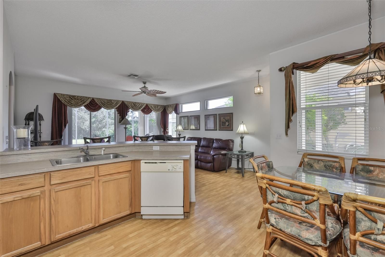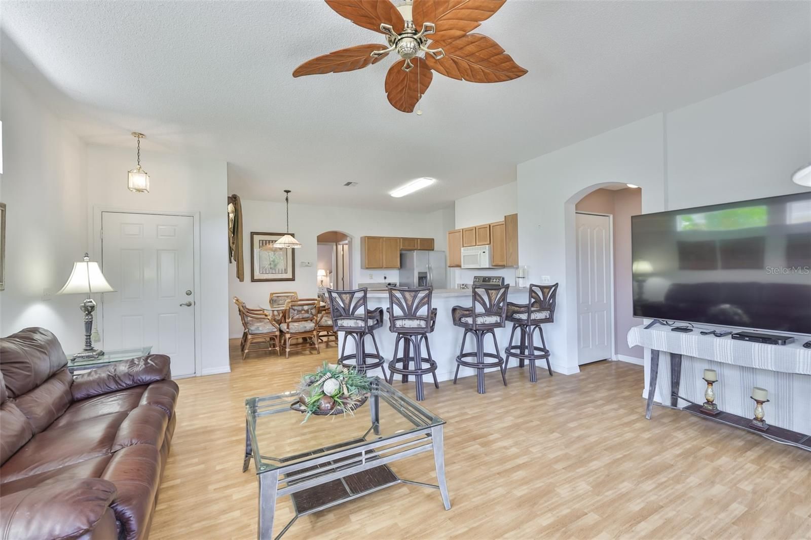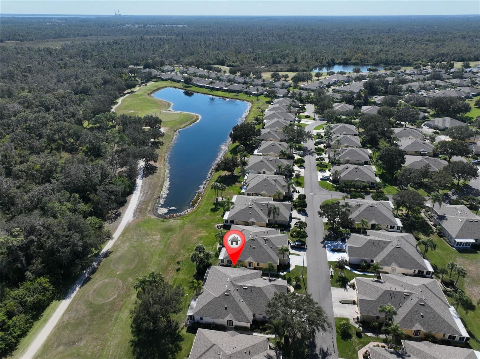This 1194 square foot, furnished 3-bedroom open floorplan Westport model has an extended, newly screened lanai looking west over the 7th hole of the Scepter golf course. This is in a pet friendly association, with no backyard neighbors. The screened entry leads into the foyer bordering the kitchen, the great room and the eating area. All the floors except the wet areas are wood look vinyl. The inside laundry room leads from the kitchen through the laundry room into the large 2 car garage. The roof was replaced in 2021 and the A/C in 2023. The monthly COA fee includes lawn care, building maintenance, roof repair/replacement, high speed internet, cable TV, pest control, water, and sewer. Kings Point is Conveniently located near beaches, medical facilities, theme parks, and major sporting venues. Amenities include 5 outdoor and two indoor pools, 2 hot tubs, a sauna, a steam room, tennis, pickleball, corn hole, bocce ball, lawn bowling, an 850-seat theater with almost continuous shows and parties, two state of the art fitness center, a woodworking shop, a ceramic/pottery studio, a model train club, an art studio, a sewing/quilting room, several cafes, free local transportation and a large sports bar! All within a private, gated community with 24 hr. manned security gates. The KPW Platinum plan warranty is good through February 2026 and will transfer to the buyer.