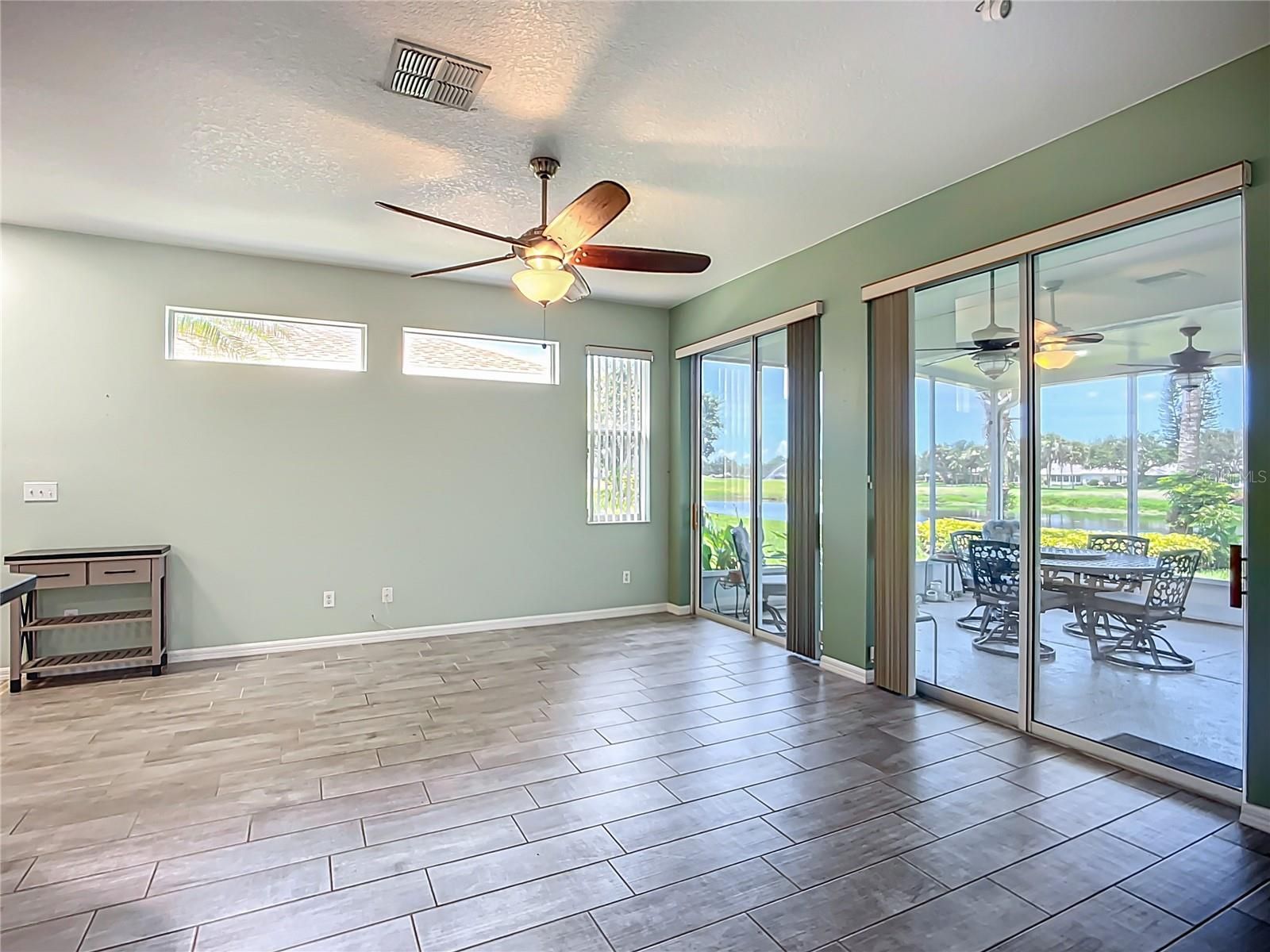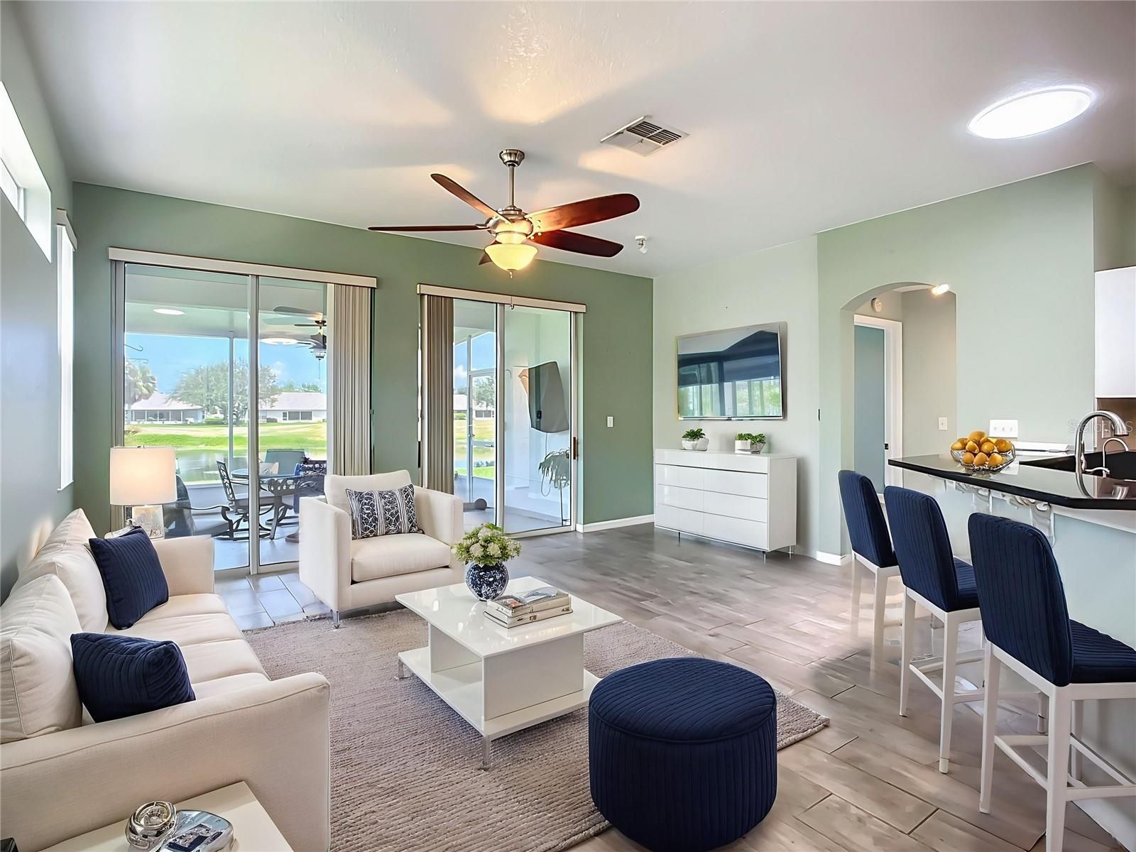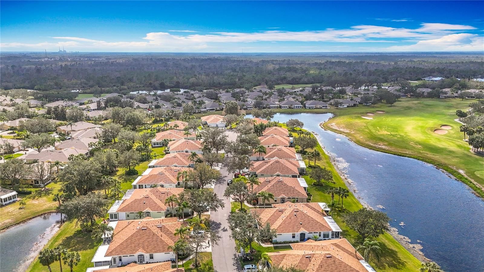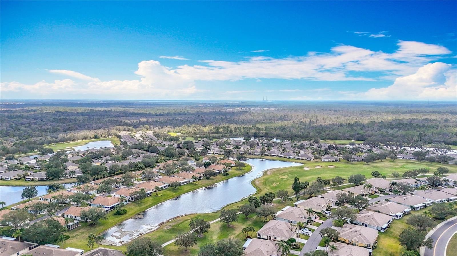 One or more photo(s) has been virtually staged. MOVE IN READY!!! The HOA includes access to two Club Houses, cable TV, Internet, Gas, exterior maintenance, ground maintenance, pest control, escrow reserves, 24- Hour Guard, recreational facilities, community pools, sewer, water, trash and private road. This beautiful (3) three bedroom, (2) two bathroom, (2) two car garage, plus Large LANAI, villa is located in the sought-after 55+ Kings Point community in Sun City Center on a no outlet street. Updated and newer items include the following: Natural gas ENERGY EFFICIENT 3 TON HVAC system replaced in 2024, exterior painted 2024, water softener, (3) energy efficient solar tubes, roof replaced in 2023 and whirlpool stainless steel appliances. All TV's included in the sale. The home features tile floors throughout, this home offers both style and easy maintenance. The kitchen boasts elegant granite countertops, solid wood cabinets, natural gas for cooking, and ample space for cooking and entertaining. The open concept living and dining areas lead a spacious lanai with serene views of a peaceful pond and the lush greenery of the golf course. Perfect for relaxing or entertaining, this home combines comfort and elegance in a vibrant, active community. Kings Point offers numerous choices for your active lifestyle. Between the South Clubhouse and the North Clubhouse and the 20/20 fitness/spa building, there is pickleball, golf, tennis courts, lawn bowling, indoor and outdoor pools, spas and Veteran's Theater for live entertainment, bingo, arts and crafts, variety of card clubs, wood shop, stained glass studio, pottery, lapidary and different dining options. Kings Point is a fully accessible golf cart community 24 hours a day. Sun City Center was voted the #1 Retirement Community in America in 2024 by Travel and Leisure Magazine. Don't miss this opportunity to enjoy resort-style living in Sun City Center.