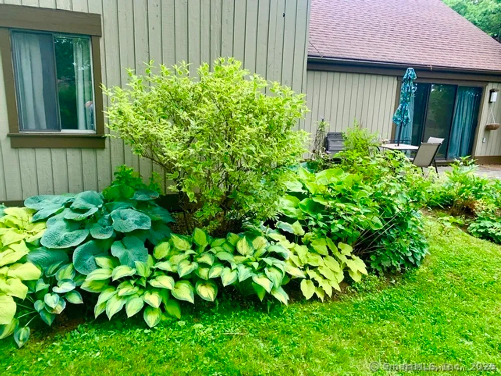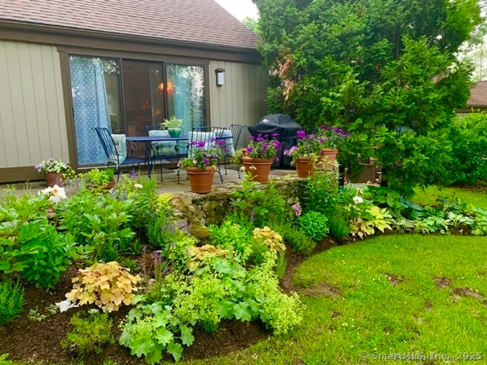 Step into a tranquil, sunny, light filled Sherman style unit. An updated 2 bed/2 bath featuring hardwood floors throughout and a thoughtfully designed open-concept living and dining area. The kitchen is complete w/ s/s appliances, custom vent hood, convenient pot filler, white cabinets, ample Quartz counter space. The dining room features a classic accent wall, sliding glass door that leads to a spacious slate patio surrounded by lush, established gardens-perfect for relaxing or entertaining outdoors. Living room has a airy feeling w/ a serene electric fireplace focal point. The primary bedroom has a walk-in closet & a fully renovated en-suite bath w/ a double sink vanity & a luxurious spa-like shower. The second bedroom is ideal as a guest room, den or home office w/ custom built-ins for added functionality. Second bath updated w/ a tub/shower. Additional highlights includes smooth ceilings (popcorn removed) crown molding, 9 ft ceilings wood raised panel doors . Don't miss the chance to enjoy low-maintenance living in a serene, friendly setting. Engage in a variety of social & recreational activities, from woodworking, arts & crafts to clubs & organized events. Also, 4 pools, garden club & is pet friendly Heritage Village is a vibrant 55 + community located in western CT. HOA includes Spectrum internet & cable. First time buyers pay a one time fee of $5000 to Heritage Village Foundation at the time of closing. Please make sure all doors are sliders are locked before leaving. Thank you