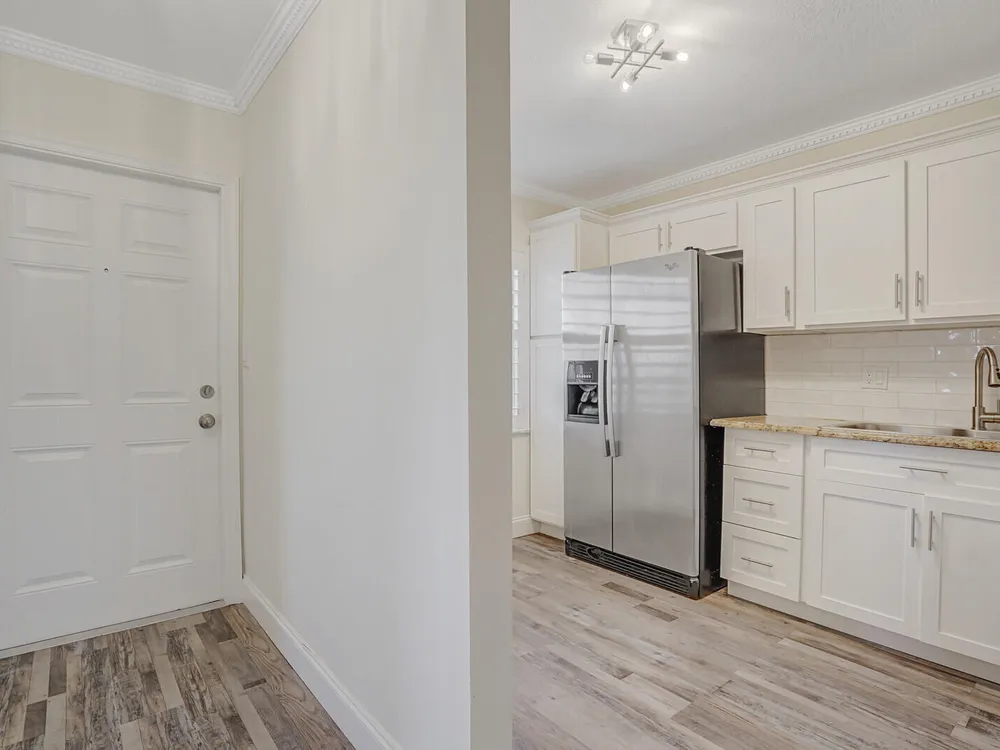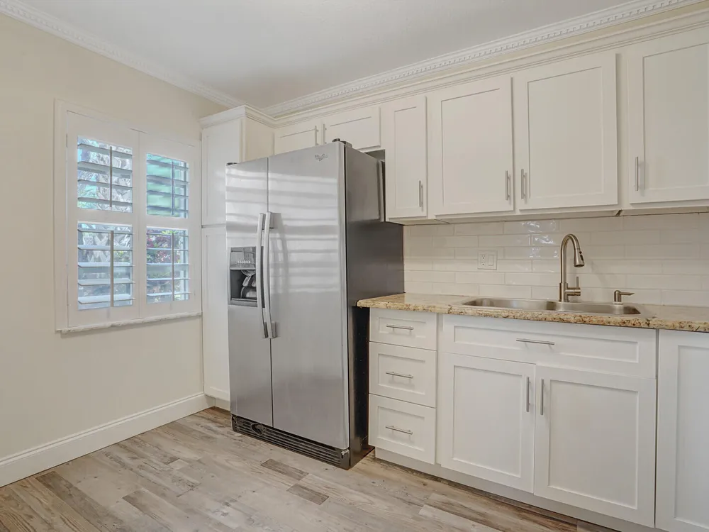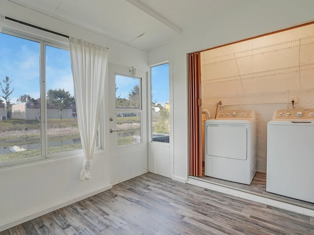 Welcome to 122 Lake Rebecca Drive in Golden Lakes Village! This beautifully renovated 2-bed, 2-bath bright corner villa features luxury vinyl flooring, a modern kitchen with stainless steel appliances, plantation shutters, and updated baths. Enjoy peaceful lake views from the spacious Florida room. Accordion shutters throughout for storm protection. Just steps from the pool in a gated 55+ community with great amenities. Move-in ready and full of charm!