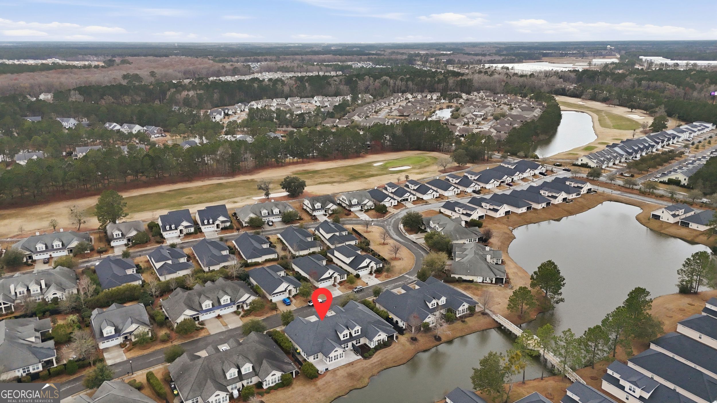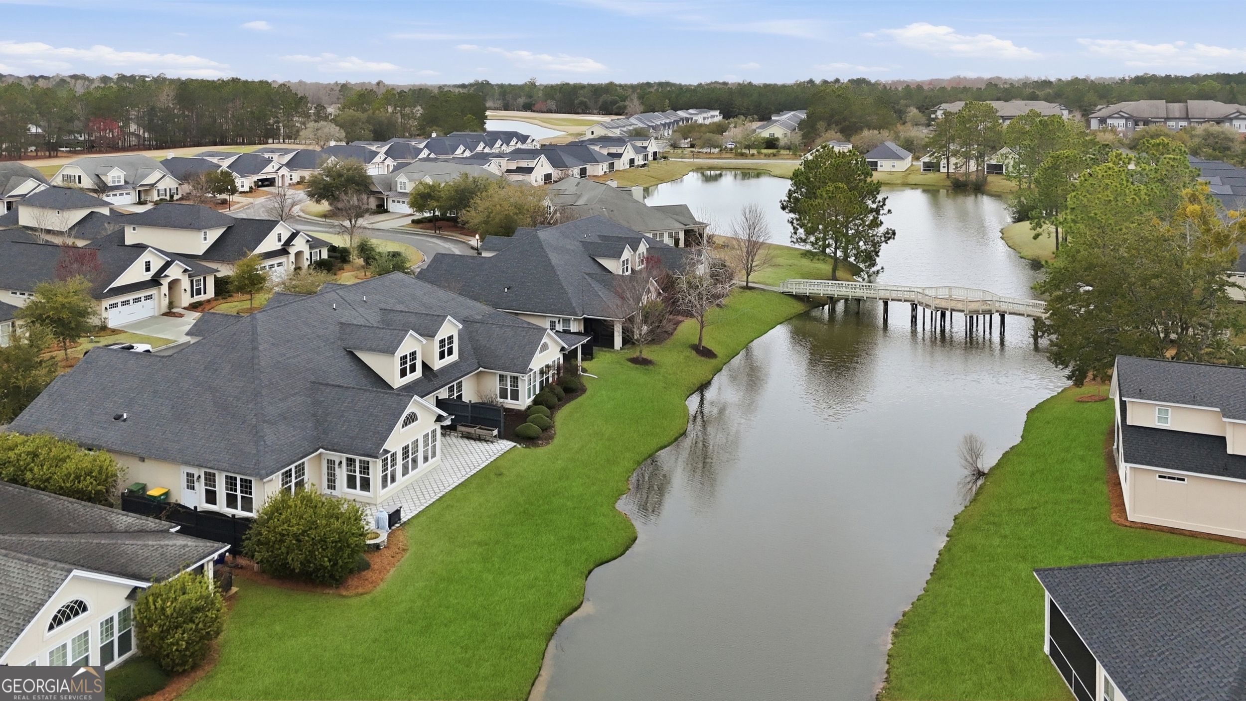 Welcome to this stunning townhome located just off Pooler Parkway, offering unbeatable access to shopping, dining, and everyday conveniences while tucked behind the gates of Savannah Quarters. Residents enjoy resort-style amenities including a Swim & Fitness Center with a junior Olympic lap pool, waterslide, wading and baby pools, plus a fully equipped fitness center, playground, Har-Tru tennis courts, and pickleball courts. Optional offerings include personalized golf lessons, fitness training, tennis instruction, swim classes, and more. Inside, this beautifully maintained home features two spacious bedrooms and an expansive living room complete with built-in bookcases and a cozy fireplace. Large windows throughout provide abundant natural light. The kitchen is a showstopper with a massive 12-foot island, ample storage, stainless steel appliances -perfect for entertaining or everyday living. Step outside to enjoy peaceful water views from the paved patio, complete with a custom fire pit. Additional upgrades include custom blinds throughout. The primary suite offers a large walk-in closet and a luxurious en-suite bath with separate vanities and a tiled walk-in shower. The secondary bathroom also features a tiled walk-in shower with ADA accessibility features. This home blends comfort, style, and convenience in one of Pooler's most sought-after gated communities.