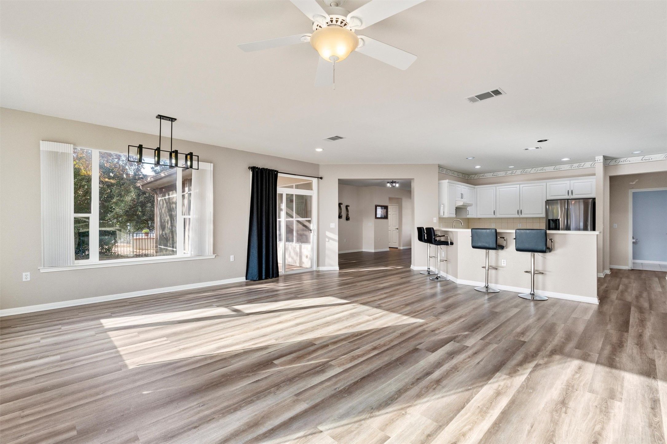 Location, Location, Location. Really Close Proximity to the main activity center you won't even need a golf cart. Travis plan with so much garage storage. 3 bedrooms with two and a half baths. Large utility room for extra storage. White cabinets with gas cooking in kitchen that is open to family room. So much natural light to enjoy. Separate Shower and Garden tub. Updated Light fixtures and ceiling fans. Gas Fireplace with built-in cabinets for extra storage. Luxury Vinyl wood-look floors throughout-No Carpet. Relax on the screened porch out back or relax on the front covered patio. Washer/Dryer and Refrigerator convey.