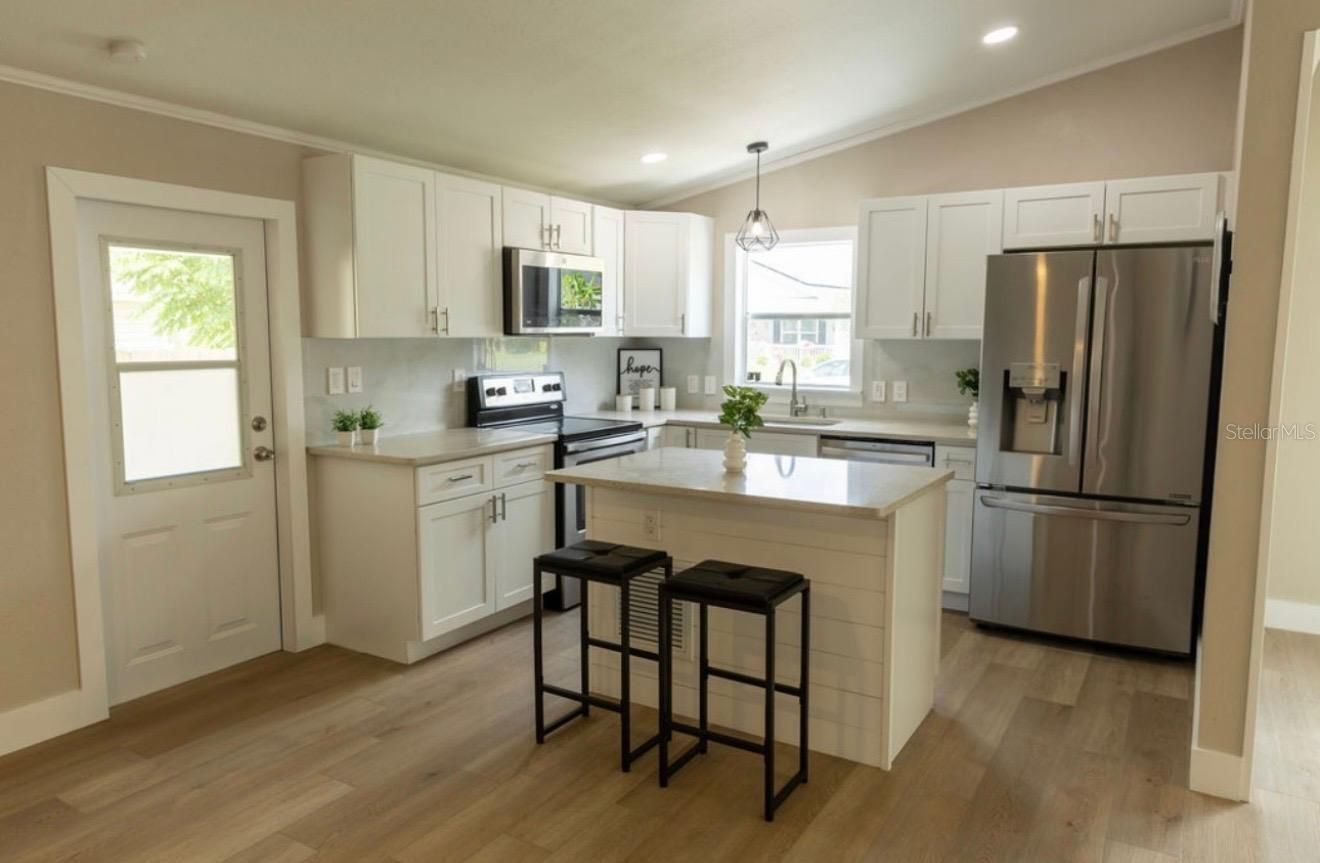 NO BOND, FINALLY FINISHED!! Be the first to see this ADORABLE, RENOVATED COTTAGE in the Village of Orange Blossom Gardens. This home is move-in ready and the BEST VALUE in The Villages! Step inside to gorgeous NEW continuous LUXURY PLANK flooring, a beautifully NEW KITCHEN with QUARTZ countertops, STAINLESS STEEL appliances, and a KITCHEN ISLAND with extra storage. NEW lighting throughout makes it shine. OPEN FLOORPLAN with large living and dining area, VAULTED CEILINGS and FRESH PAINT. Down the hall, the primary bedroom boasts TWO WALK IN closets and a brand-new en-suite bath with a shower. The guest bedroom with additional closet space is equally inviting, with an all-NEW guest bath featuring a tub and shower. Bask in the warmth of the sun on your covered lanai or porch, just steps from Silver Lake. And you’re in the heart of The Villages—minutes from 110 pools including neighborhood, family and sports pools, 125 recreation facilities, 62 golf course, (15 Championship and 43 Executive, 4 pitch and putt courses), 9 dog parks, 277 pickleball courts, 14 softball fields , 261 shuffleboard courts, 265 Bocce courts, outside exercise parks, archery, and 2 Bowlero bowling alleys. Just over the bridge, you’re close to Spanish Springs and Sumter Landing with 365 days of free bands (weather permitting). There is endless shopping, medical facilities and supermarkets, (Costco and BJ a golf cart away) and well over 125 restaurants in The Villages. There are over 3000 clubs to join should you need something to do. And if that’s not enough, you are between Ocala with its World Equestrian Center and Leesburg with its Chain of Lakes for World class fishing and boating. Don’t miss out—Call now for an appointment today! Information is deemed reliable but to be verified by buyer.