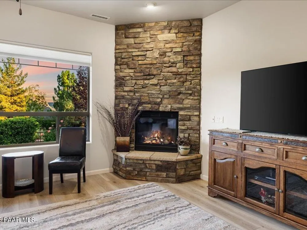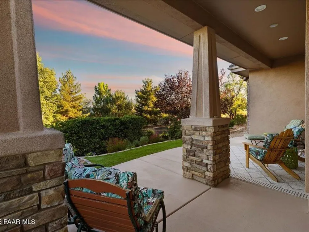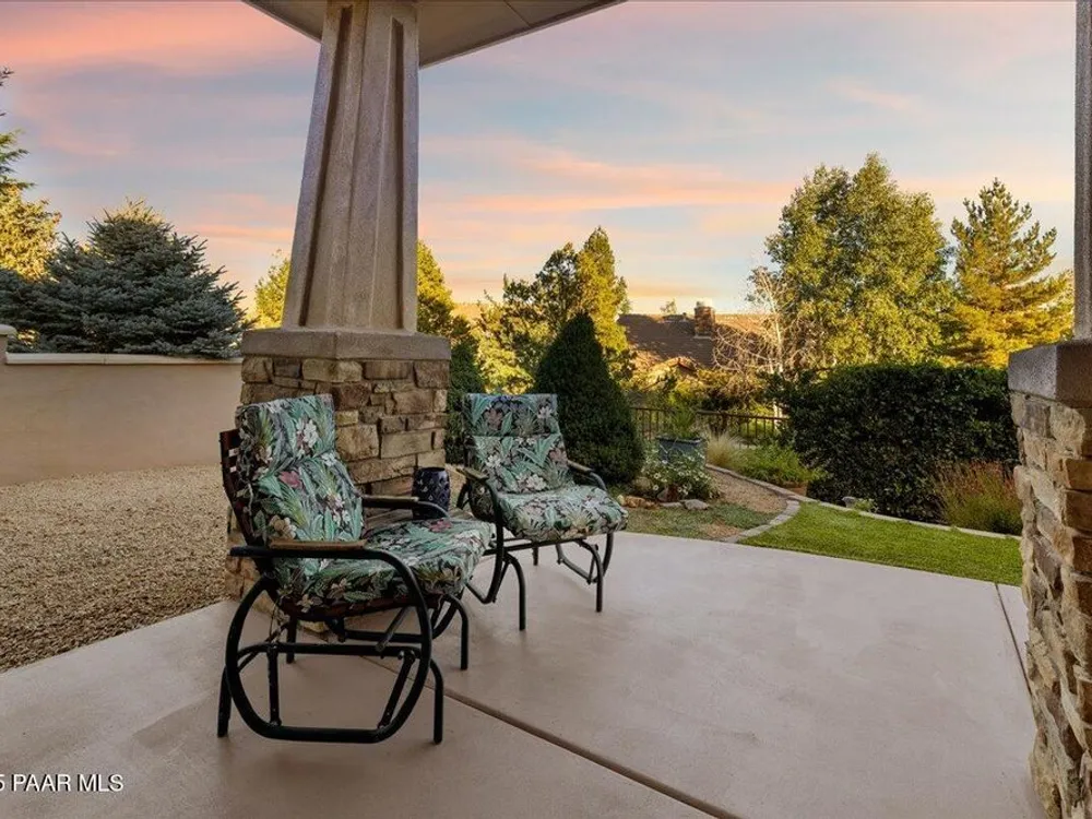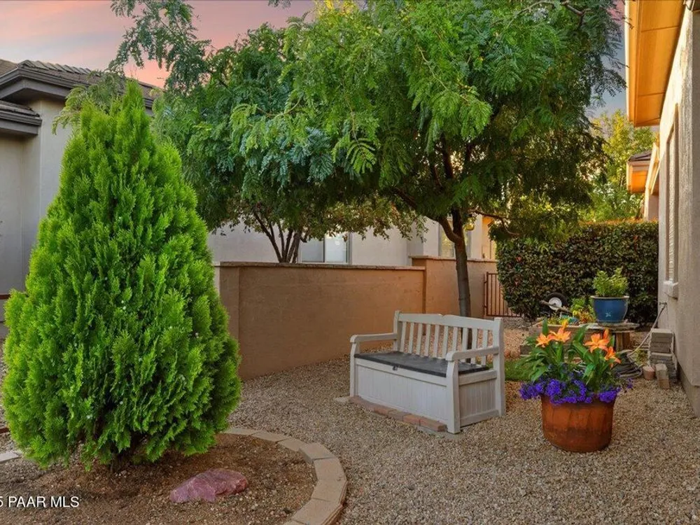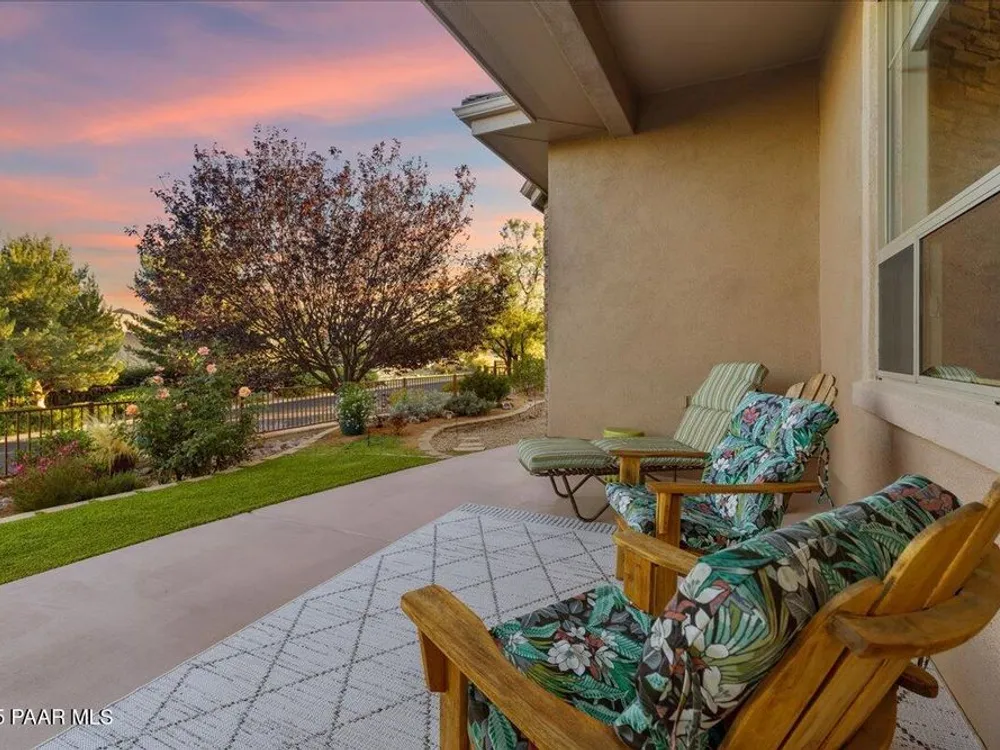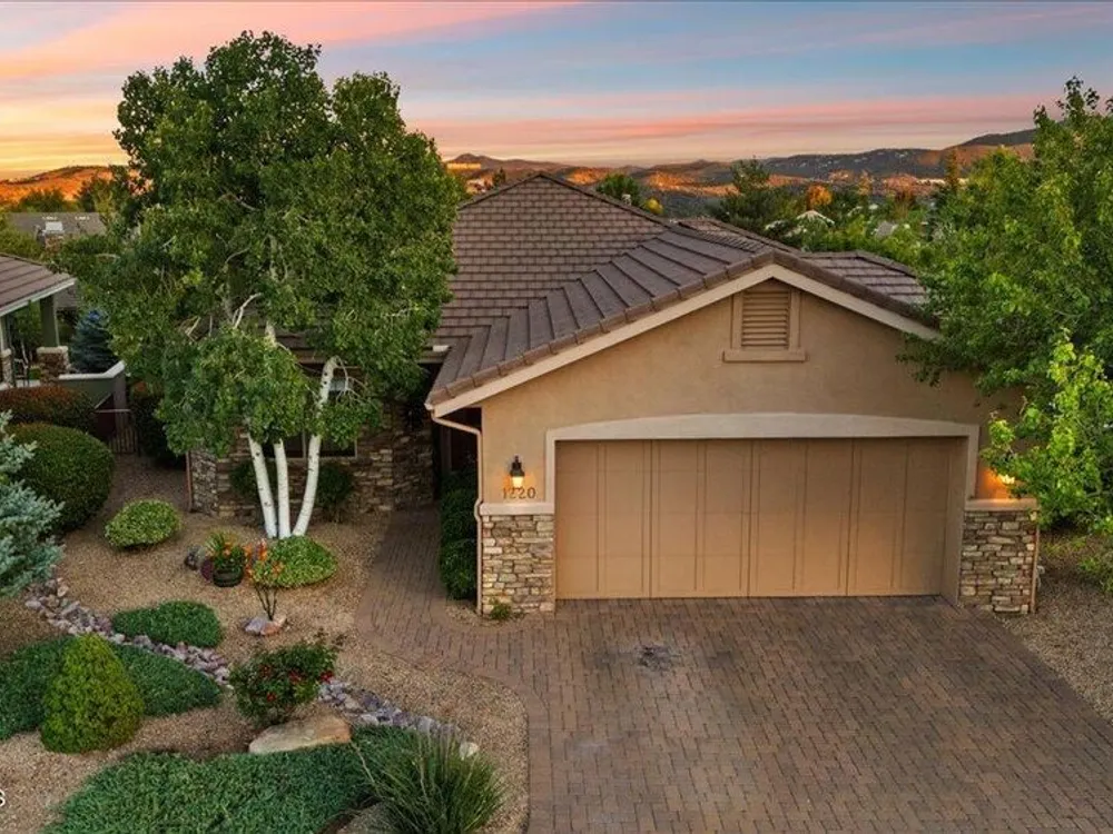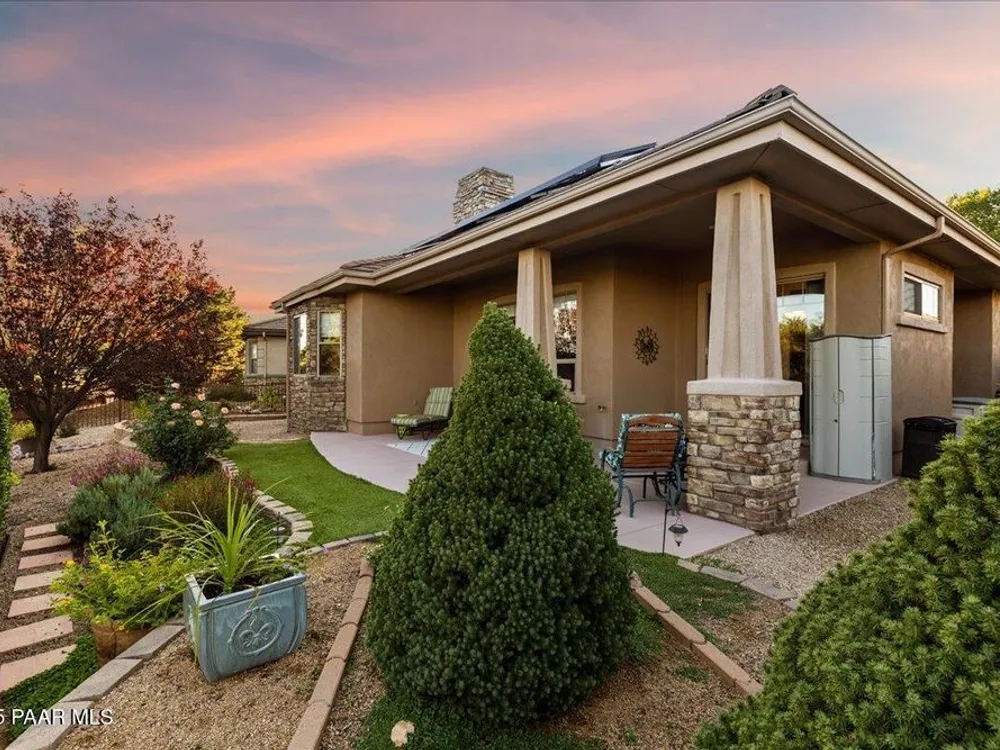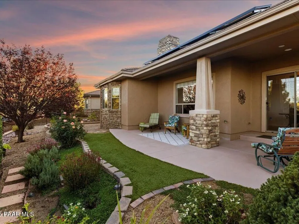 Quiet and sought after Creekside neighborhood in the gated Prescott Lakes. Beautifully maintained single level home with classic stucco accented by stonework, a durable concrete tile roof and mature landscaping which includes a fully fenced back yard. Take a short walk to the club house and enjoy scenic views of Granite Mountain and the Dells.Step inside to a welcoming foyer that opens into the spacious great room, where a floor-to-ceiling stacked stone fireplace serves as the centerpiece. Vaulted ceilings and recessed niches for art and media add dimension. Natural light enhances the open, inviting atmosphere.The kitchen is designed to impress with raised-panel cabinetry, granite countertops, crown molding and under-cabinet lighting that highlights every detail. A gas range and sleek black appliance package bring both style and practicality. The adjacent dining area is perfectly positioned to enjoy views of the backyard and distant mountains. The primary suite is a retreat featuring a tray ceiling with lighting, bay window with garden views, and a spa-like ensuite bathroom complete with a jetted tub, walk-in shower, and dual vanities. A guest suite offers privacy with its three quarter bath and walk in shower. With a space sparing Murphy bed, could also be used for hobbies. A third bedroom near the entry can easily serve as a den or office with a nearby one half bath.Throughout the home, luxury vinyl plank flooring creates a modern, cohesive feel. Energy efficient touches include a Nest thermostat and a solar system that helps reduce utility costs, and a whole-home water filtration system adds comfort and health advantages. Additional features include a well-appointed laundry room with cabinets, sink, and storage. The garage includes abundant storage cabinets, an insulated eight-foot overhead door and recirculating hot water. The covered southeast facing patio extends your living space outdoors to enjoy beautiful morning sunrises, shaded afternoons to relax or entertain, with serene landscaping and carefully designed architectural elements.