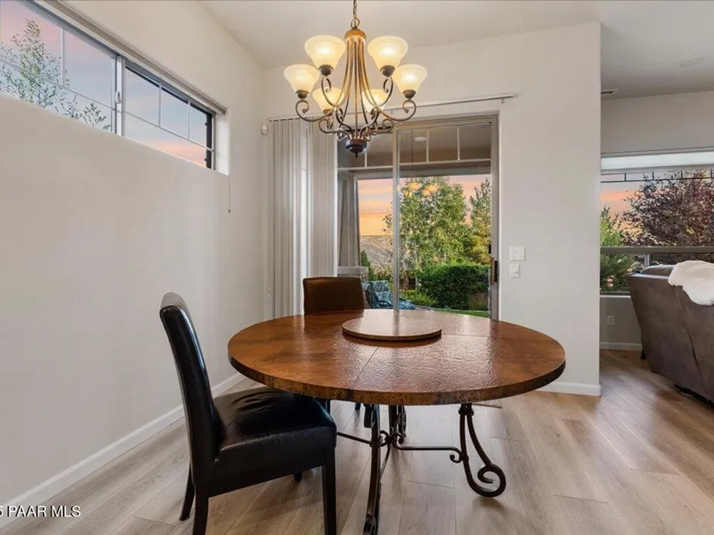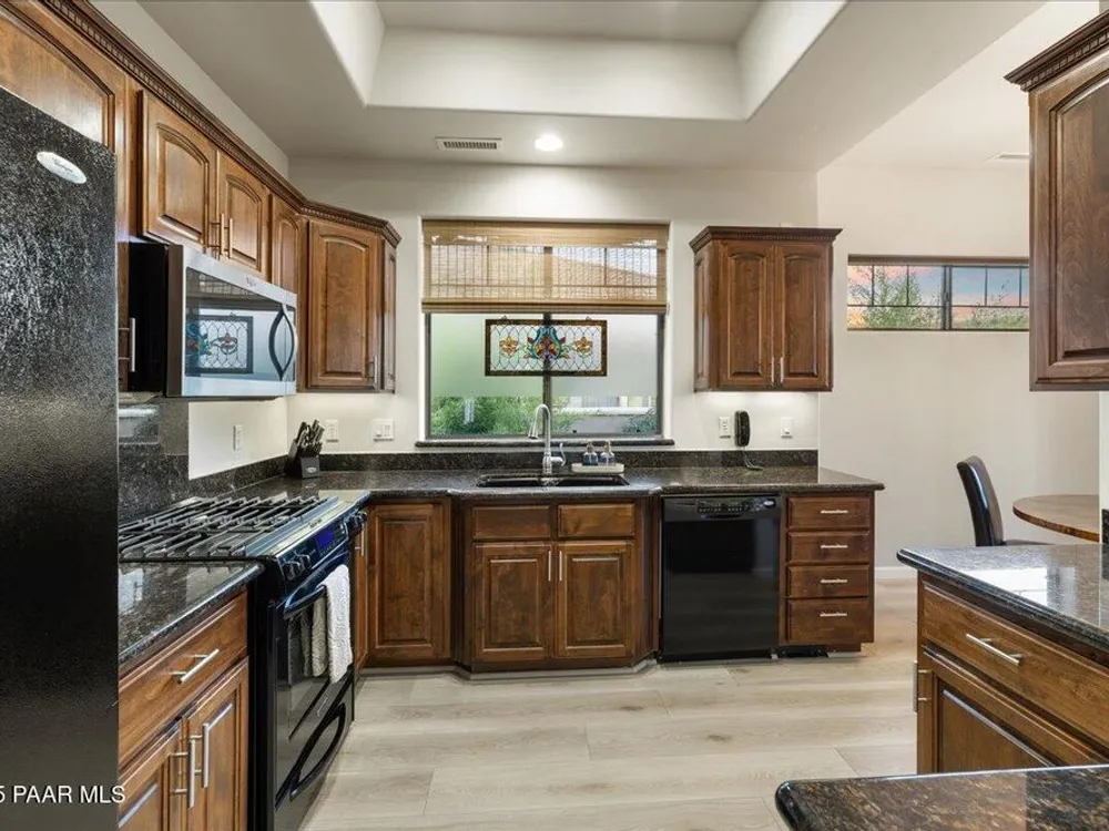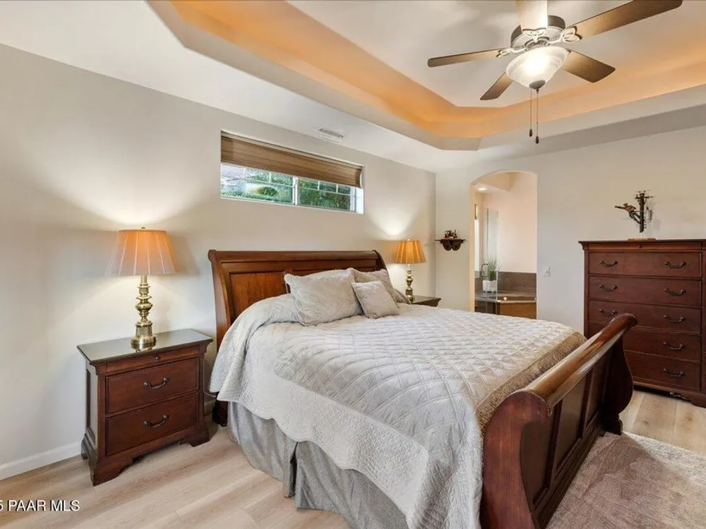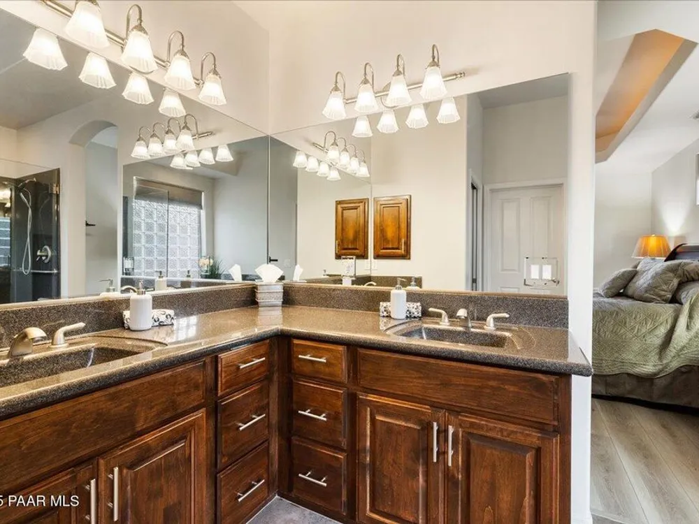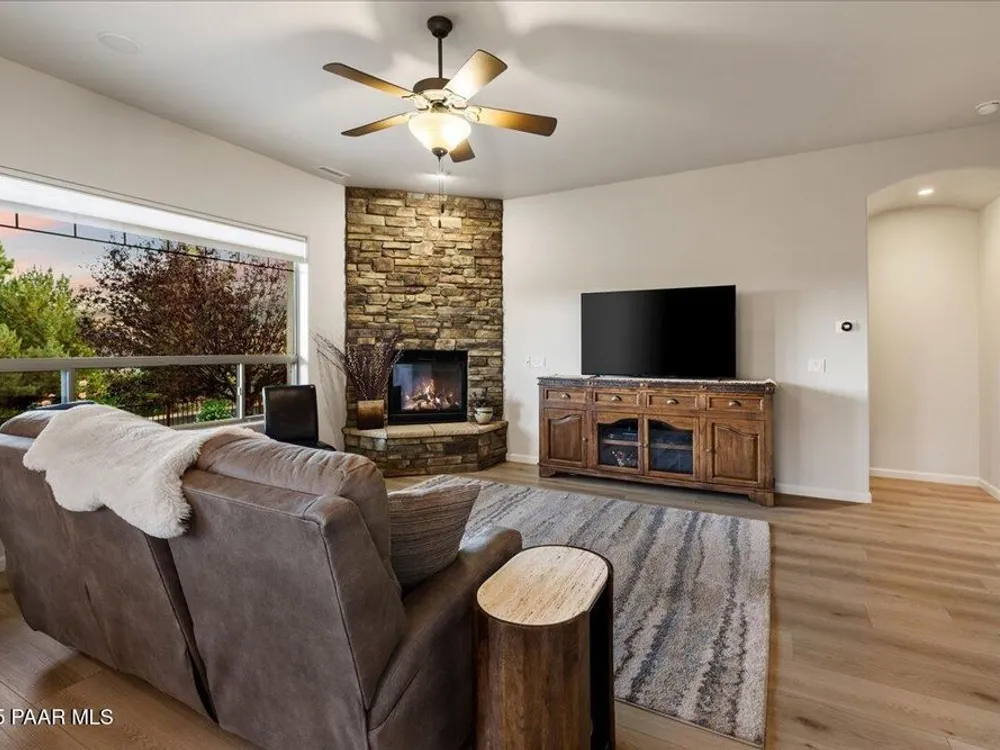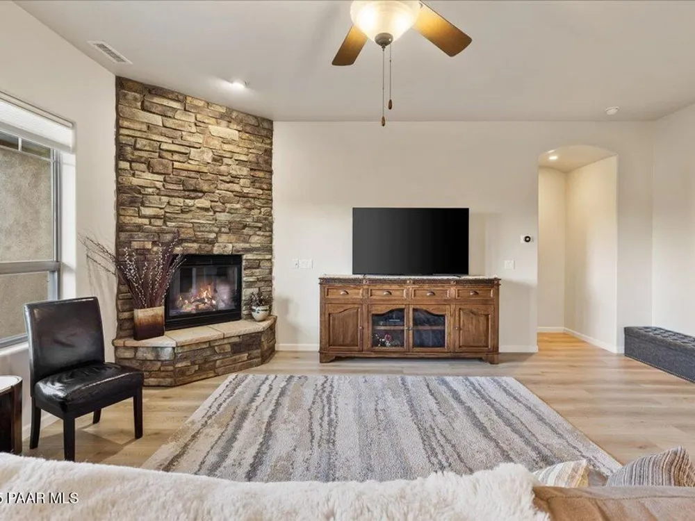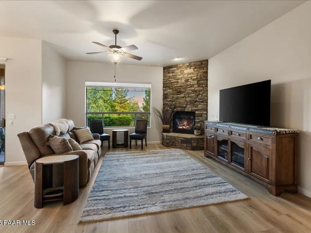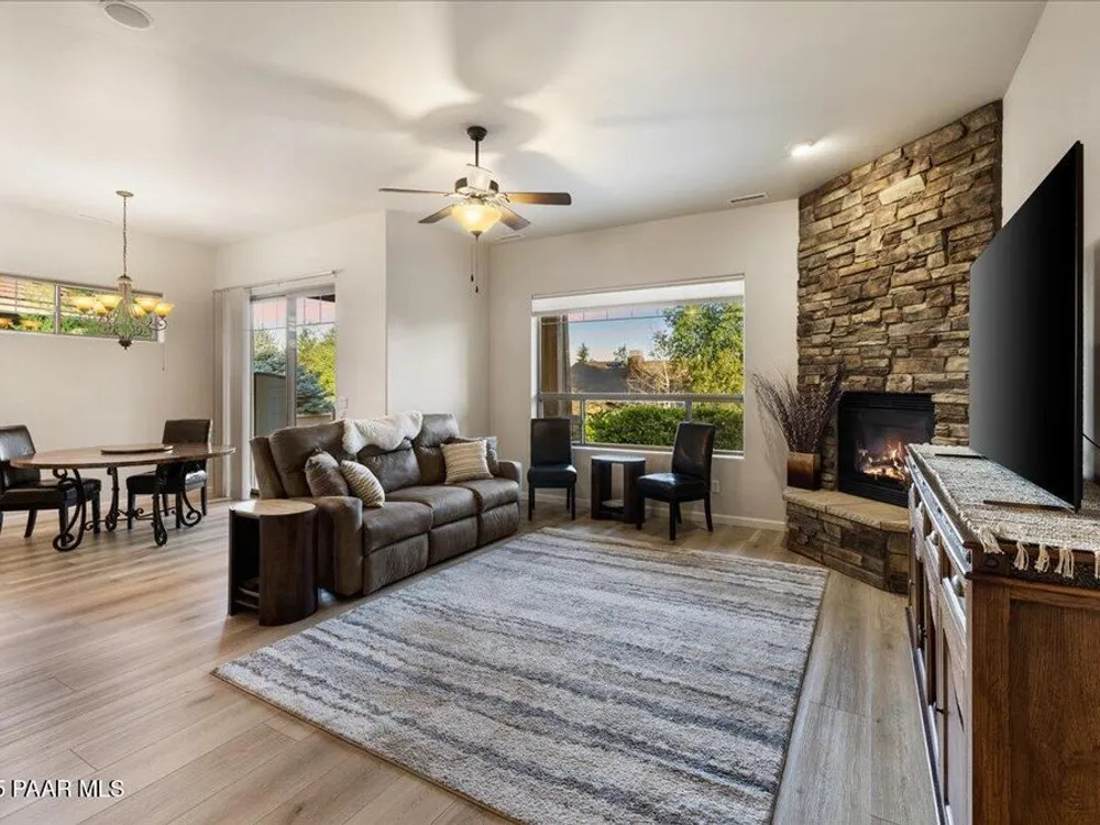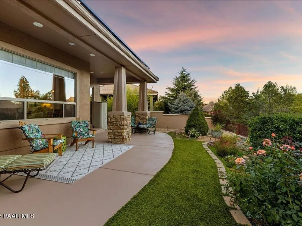 Quiet and sought after Creekside neighborhood in the gated Prescott Lakes. Beautifully maintained single level home with classic stucco accented by stonework, a durable concrete tile roof and mature landscaping which includes a fully fenced back yard. Take a short walk to the club house and enjoy scenic views of Granite Mountain and the Dells.Step inside to a welcoming foyer that opens into the spacious great room, where a floor-to-ceiling stacked stone fireplace serves as the centerpiece. Vaulted ceilings and recessed niches for art and media add dimension. Natural light enhances the open, inviting atmosphere.The kitchen is designed to impress with raised-panel cabinetry, granite countertops, crown molding and under-cabinet lighting that highlights every detail. A gas range and sleek black appliance package bring both style and practicality. The adjacent dining area is perfectly positioned to enjoy views of the backyard and distant mountains. The primary suite is a retreat featuring a tray ceiling with lighting, bay window with garden views, and a spa-like ensuite bathroom complete with a jetted tub, walk-in shower, and dual vanities. A guest suite offers privacy with its three quarter bath and walk in shower. With a space sparing Murphy bed, could also be used for hobbies. A third bedroom near the entry can easily serve as a den or office with a nearby one half bath.Throughout the home, luxury vinyl plank flooring creates a modern, cohesive feel. Energy efficient touches include a Nest thermostat and a solar system that helps reduce utility costs, and a whole-home water filtration system adds comfort and health advantages. Additional features include a well-appointed laundry room with cabinets, sink, and storage. The garage includes abundant storage cabinets, an insulated eight-foot overhead door and recirculating hot water. The covered southeast facing patio extends your living space outdoors to enjoy beautiful morning sunrises, shaded afternoons to relax or entertain, with serene landscaping and carefully designed architectural elements.