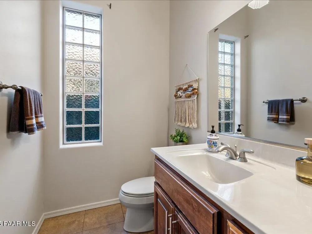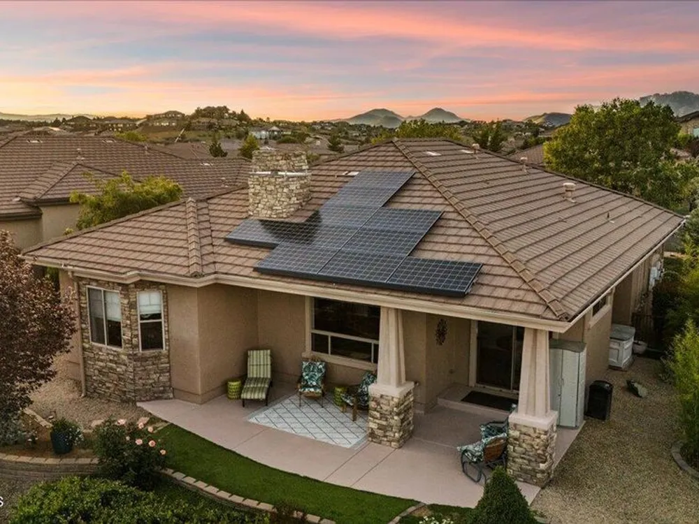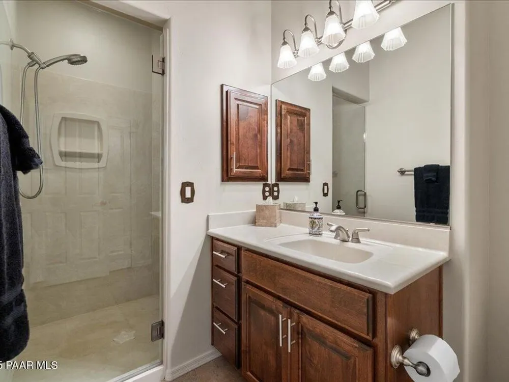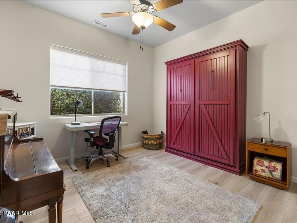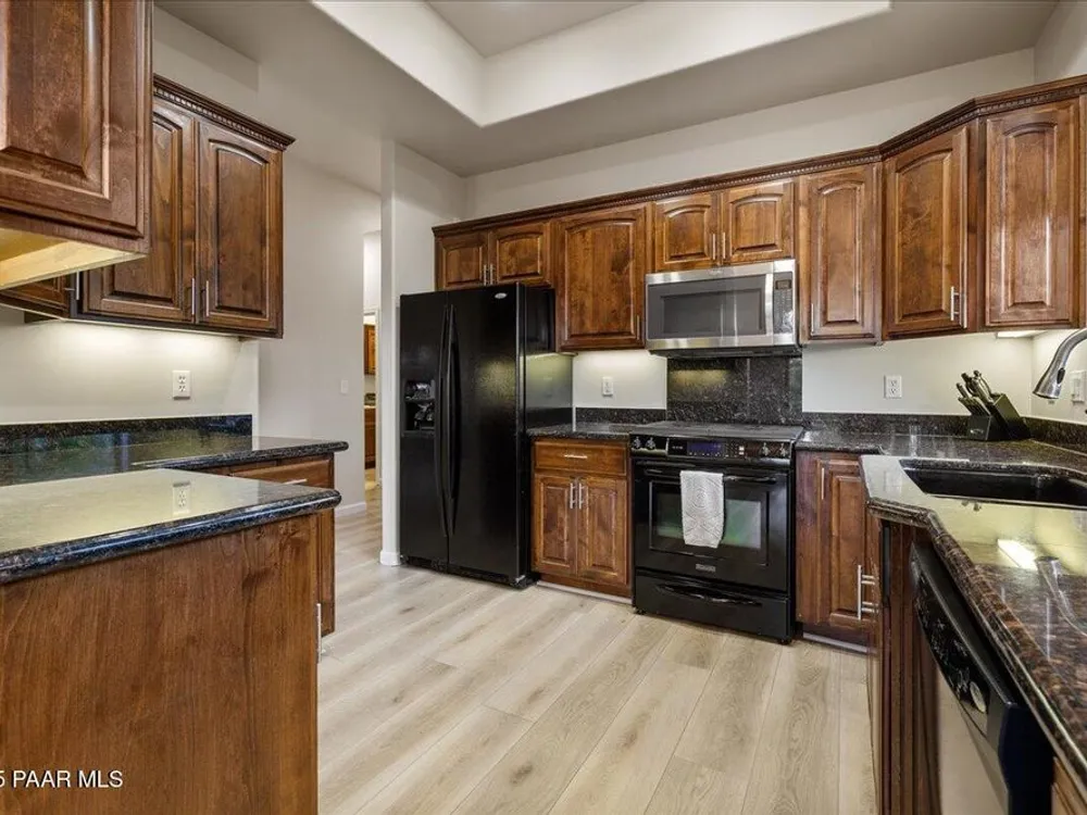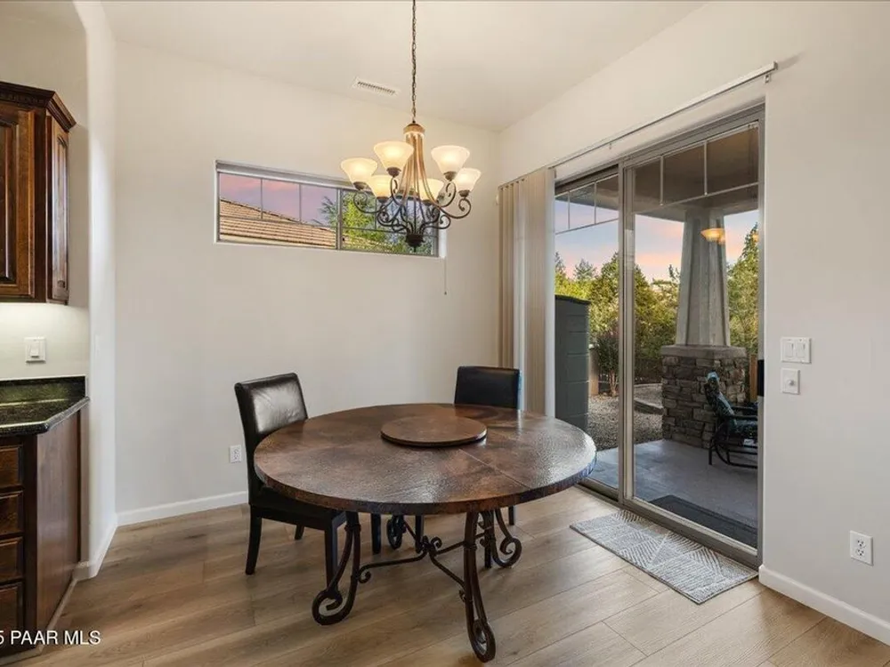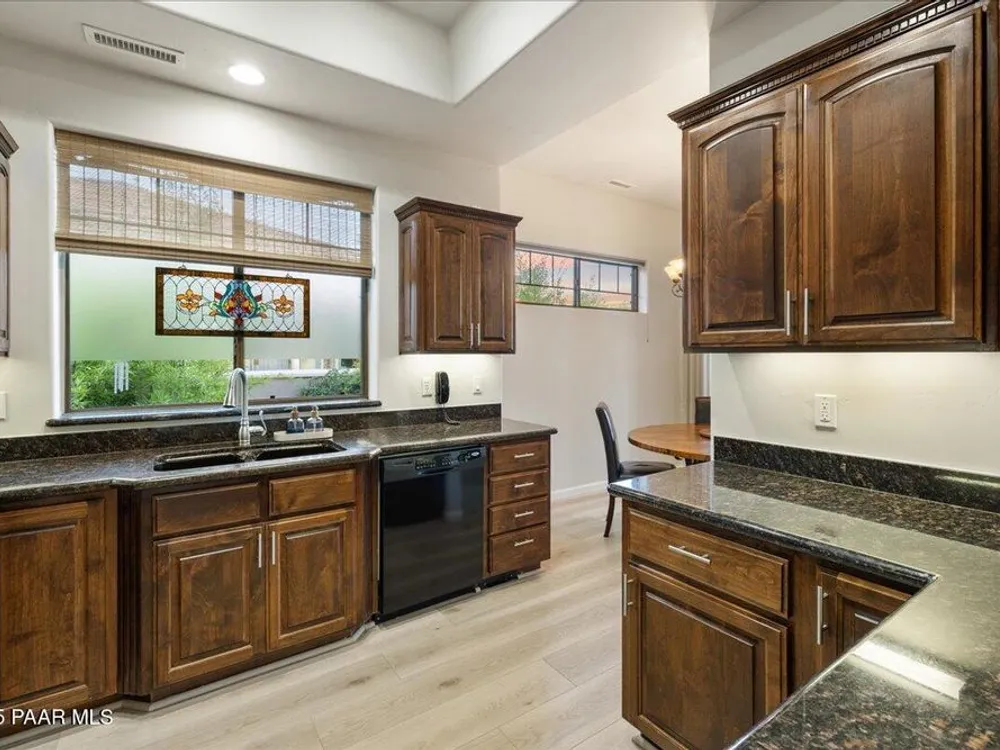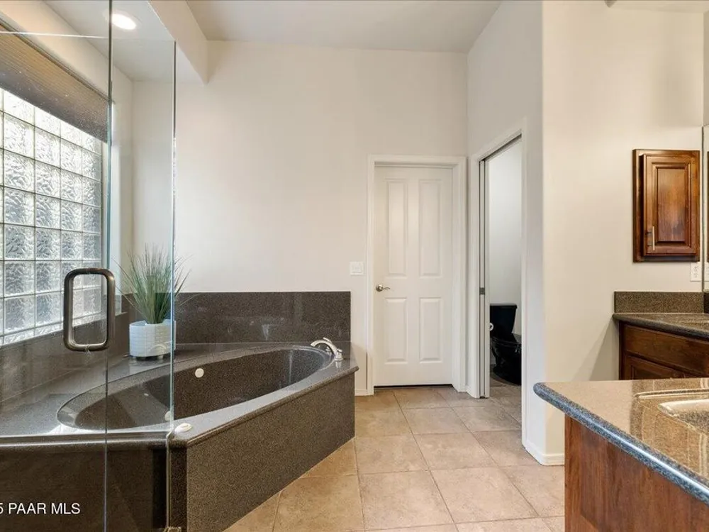 Quiet and sought after Creekside neighborhood in the gated Prescott Lakes. Beautifully maintained single level home with classic stucco accented by stonework, a durable concrete tile roof and mature landscaping which includes a fully fenced back yard. Take a short walk to the club house and enjoy scenic views of Granite Mountain and the Dells.Step inside to a welcoming foyer that opens into the spacious great room, where a floor-to-ceiling stacked stone fireplace serves as the centerpiece. Vaulted ceilings and recessed niches for art and media add dimension. Natural light enhances the open, inviting atmosphere.The kitchen is designed to impress with raised-panel cabinetry, granite countertops, crown molding and under-cabinet lighting that highlights every detail. A gas range and sleek black appliance package bring both style and practicality. The adjacent dining area is perfectly positioned to enjoy views of the backyard and distant mountains. The primary suite is a retreat featuring a tray ceiling with lighting, bay window with garden views, and a spa-like ensuite bathroom complete with a jetted tub, walk-in shower, and dual vanities. A guest suite offers privacy with its three quarter bath and walk in shower. With a space sparing Murphy bed, could also be used for hobbies. A third bedroom near the entry can easily serve as a den or office with a nearby one half bath.Throughout the home, luxury vinyl plank flooring creates a modern, cohesive feel. Energy efficient touches include a Nest thermostat and a solar system that helps reduce utility costs, and a whole-home water filtration system adds comfort and health advantages. Additional features include a well-appointed laundry room with cabinets, sink, and storage. The garage includes abundant storage cabinets, an insulated eight-foot overhead door and recirculating hot water. The covered southeast facing patio extends your living space outdoors to enjoy beautiful morning sunrises, shaded afternoons to relax or entertain, with serene landscaping and carefully designed architectural elements.
