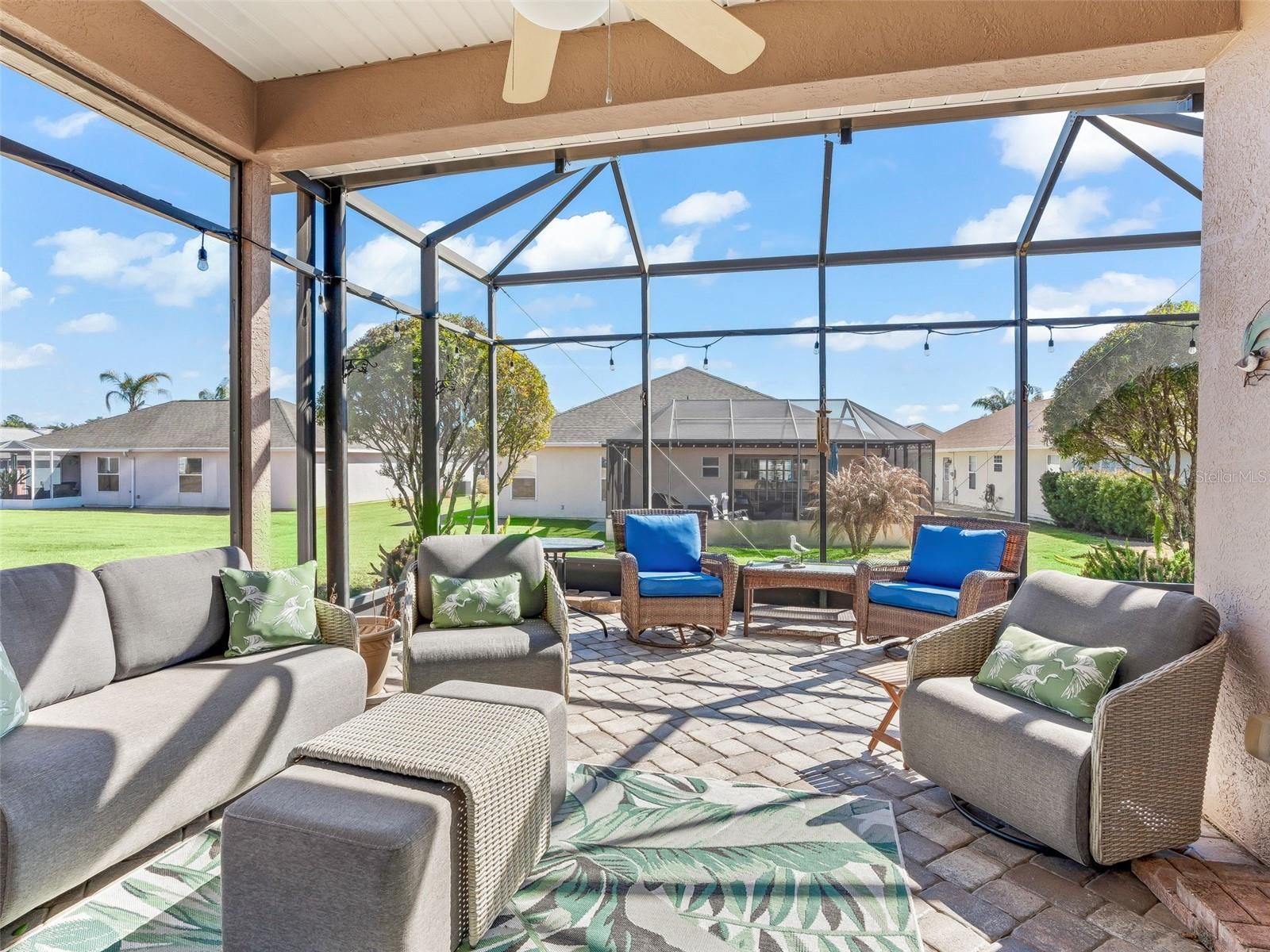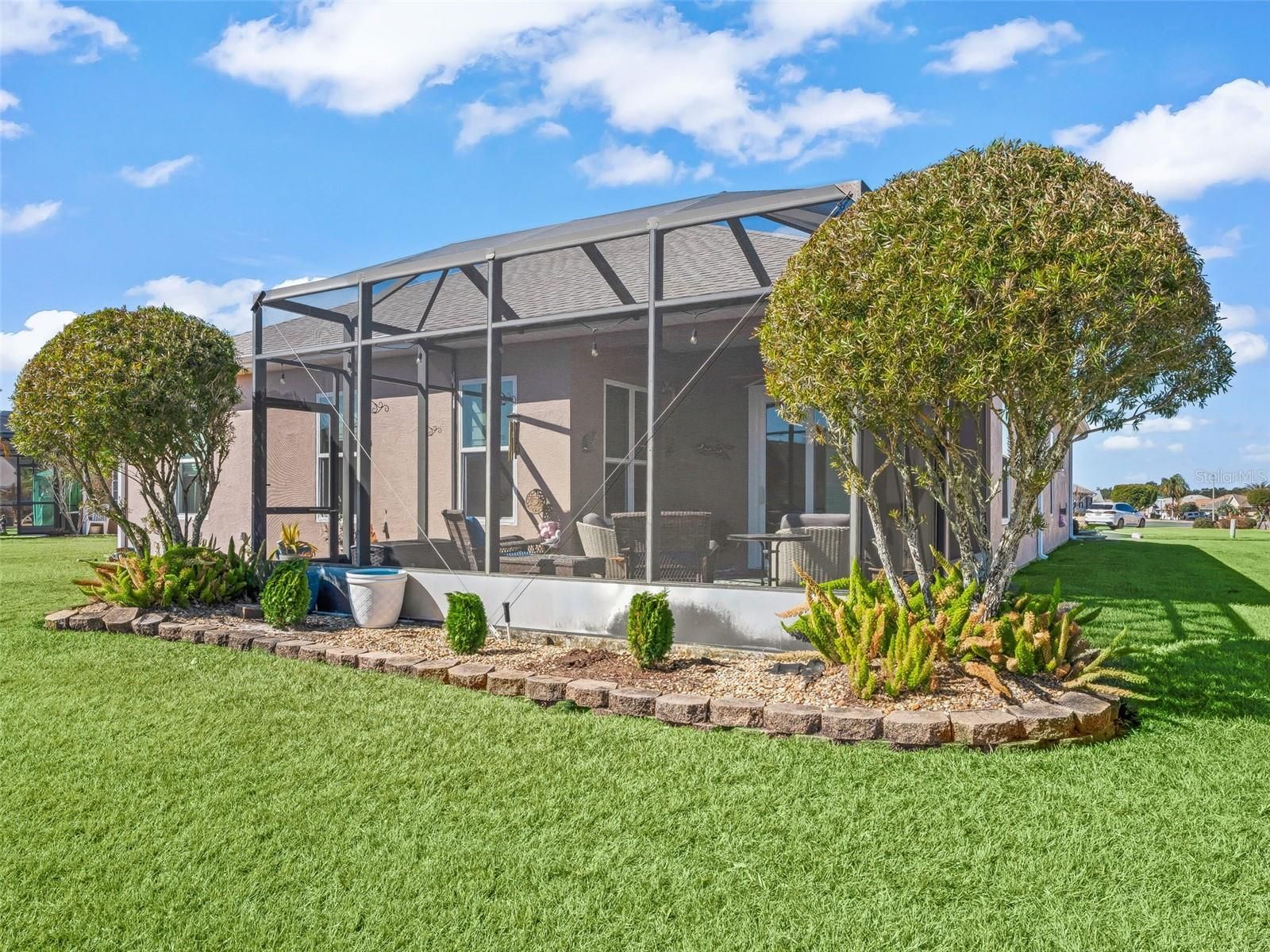 Stonecrest is a 55+ gated golf course community with all the amenities and 4 pools (one indoor), and just a Bridge Away By Golf Cart To The Villages! Stunning Upgraded Cul-de-Sac Home! 3/2 Maple with a 2 Car Garage on a Quiet Cul-de-Sac Lot! ROOF 2022! Water Heater 2025! Hurricane Impact Windows and Sliding Doors 2024! This home offers Tremendous Curb Appeal featuring New Professional Landscaping, Paver Driveway and Walkway (Repaired & Sealed 2025), Newer Exterior Paint (2020), and Elegant Covered Front Entrance. This well appointed home boasts Crown molding, Newer Interior Paint (2020), Remote Controlled Blinds, Engineered Hardwood Flooring, High ceilings and New Light Fixtures! Upon entering this lovely Maple model, you are greeted by an Open Concept Floor plan with Soaring 10 ft Ceilings which continue throughout the home, the Spacious Eat in Kitchen offers sliding door access to the covered Lanai, this creates a spectacular Gathering Space! The Kitchen showcases Granite countertops, a nice size Pantry Closet, Stainless Appliances, White Wood Cabinets, Tile Backsplash, Generous Breakfast Bar, and opens to the Large Living area. The Covered Lanai with Paver flooring (repaired & sealed 2025), features a 20 x 10 Birdcage Enclosed Back Patio where you can Soak in the Sun, Enjoy Stunning Sunsets, Tropical Florida Breezes, and enjoy an Exceptional Outdoor Living Experience! The Split Floor plan provides the Utmost Privacy for both the Owners and their Guest, with the Primary Suite commanding one side of the home, while the guest bedrooms and bathroom featuring a New Commode, a Nice Size Vanity, and a Tiled Tub and Shower combination, are located on the opposite side of the home. The Luxurious Primary suite offers a Tray ceiling, Two Walk in Closets, and an En suite bathroom. The En Suite bathroom features a Gorgeous Designer Light Fixtue, New Commode, Linen Closet, Two Vanities, Nice Size Garden Tub, Tiled Walk in Shower, and a Private Water Closet. There is plenty of room for Storage in the nice size 2 Car Garage! Call Today for Your Private Showing! Stonecrest is a 55+ gated golf course community with all the amenities, pools, pickleball courts, softball, 18 hole championship golf course, Broad Stripes Golf & Social Club and over 80 different clubs to join! As a private gated golf course community, you can expect a high level of privacy and security. Overall, this home offers a combination of Great Outdoor Space, Luxurious Features, a Desirable Location, and a Secure Community Setting. A WONDERFUL LIFESTYLE AWAITS YOU IN STONECREST!