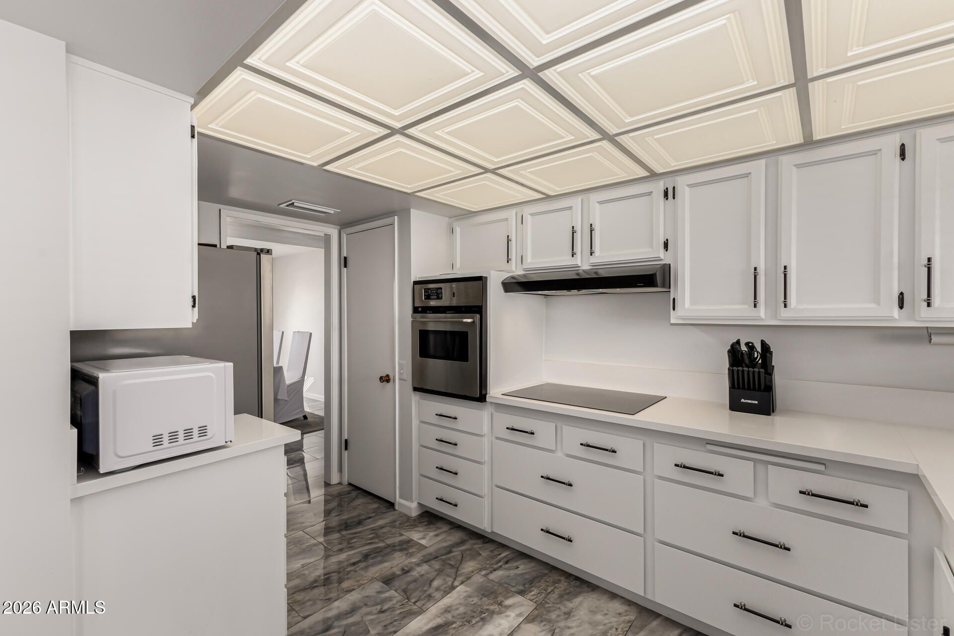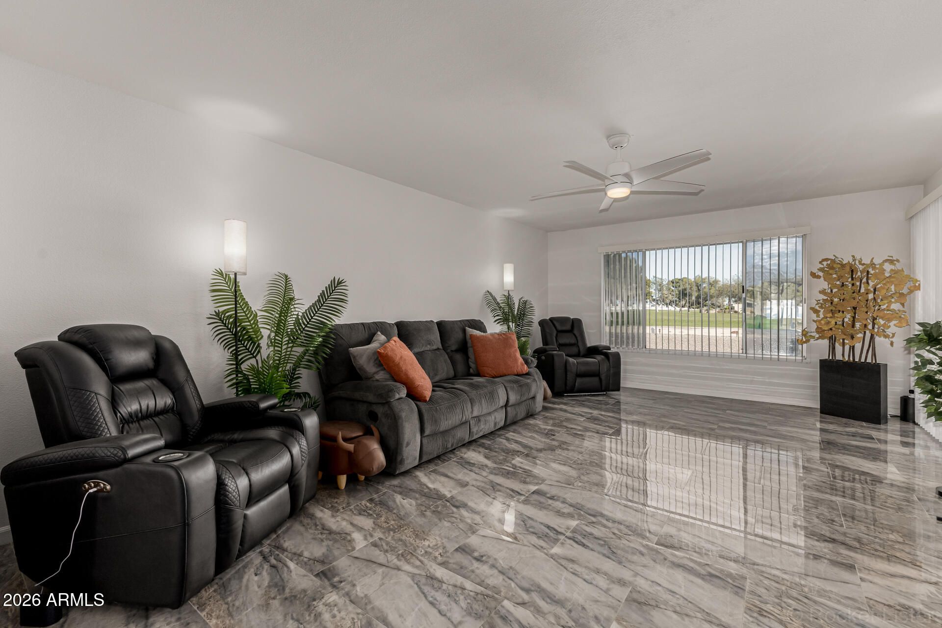 This beautifully updated Sun City home is perfectly situated on the Quail Run Golf Course, just off of the first tee/fairway! Offering over 1,770 sq.ft. of thoughtfully designed living space, this inviting residence features 2 bedrooms and 2 bathrooms with stylish upgrades throughout. Elegant porcelain tile flooring flows seamlessly through the entire home, complemented by updated window blinds, modern light fixtures, and new ceiling fans in both bedrooms and the living room. The refreshed kitchen shines with crisp white cabinetry, new pull handles, sleek quartz countertops, a new hood vent, updated sink, and a modern induction glass cooktop, creating a space that is both functional and attractive. The spacious primary suite offers added comfort with its own mini split AC unit, while the beautifully renovated primary bathroom features a porcelain stacked stone walk in shower with glass sliding doors, a rain head, and a convenient hand wand. Additional improvements include a new roof, new hot water heater, updated bathroom vanities, and a new front door. The oversized 2-car garage features built-in cabinets and a bonus golf cart/workshop area. Enjoy year round comfort and energy savings with leased solar. Beautiful golf course views, and conveniently close to shopping, dining, and freeway access, this move-in ready home provides access to the outstanding recreation centers, clubs, and activities that make Sun City one of Arizona's most vibrant active adult communities.