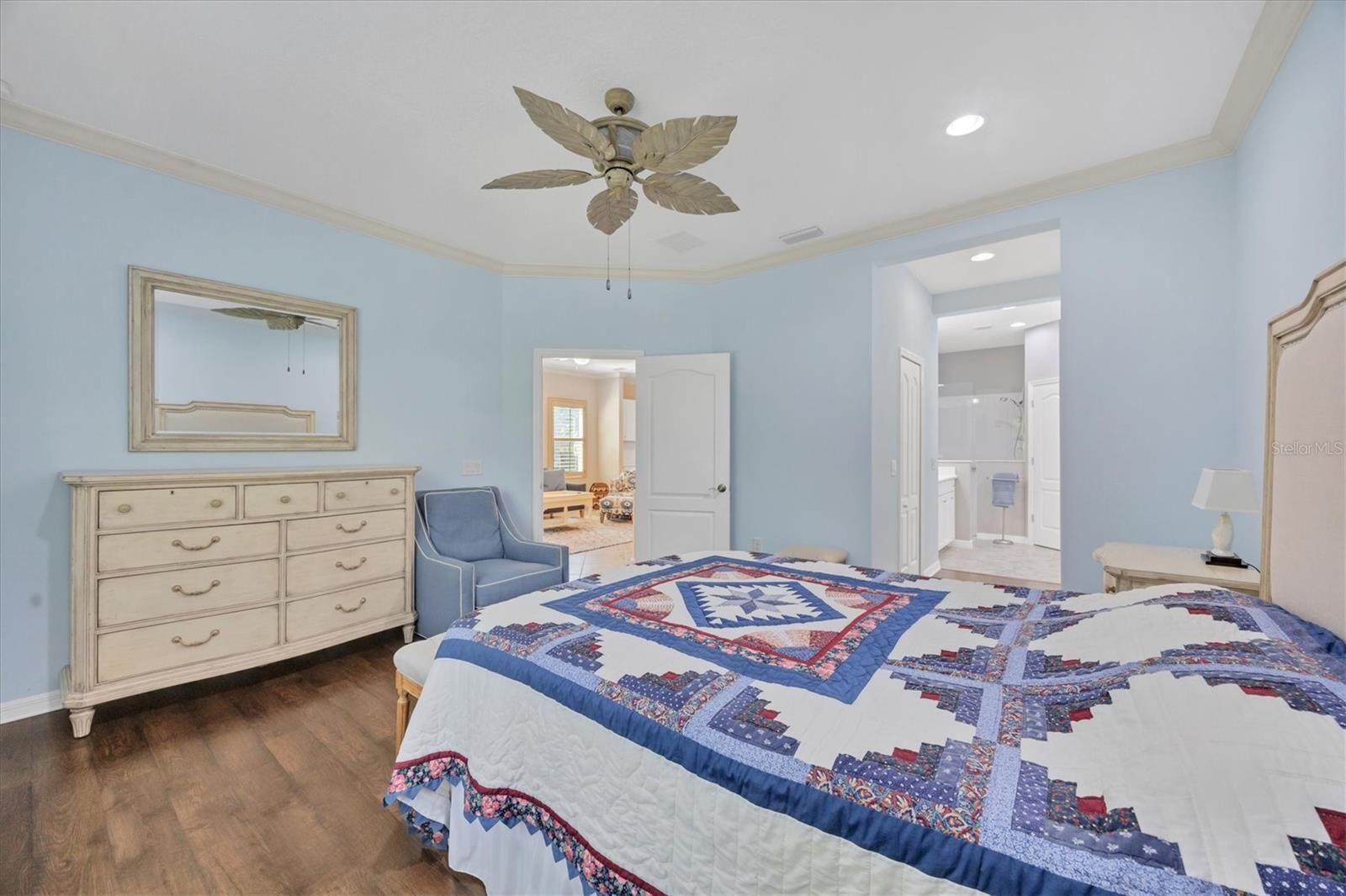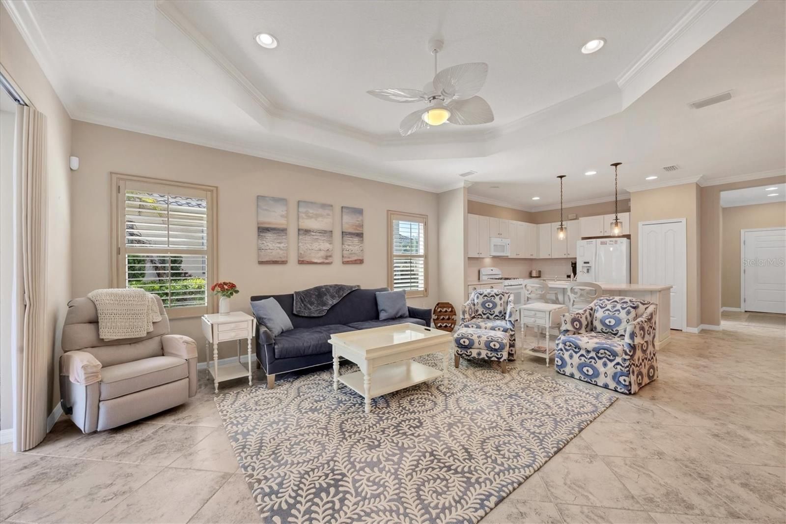 - Ceiling Fan(s), Crown Molding, Eat-in Kitchen, High Ceilings, Kitchen/Family Room Combo, Open Floorplan, Main Level Primary, Solid Surface Counters, Solid-Wood Cabinets, Split Bedrooms, Tray Ceiling(s), Vaulted Ceiling(s), Walk-In Closet(s), Window Treatments