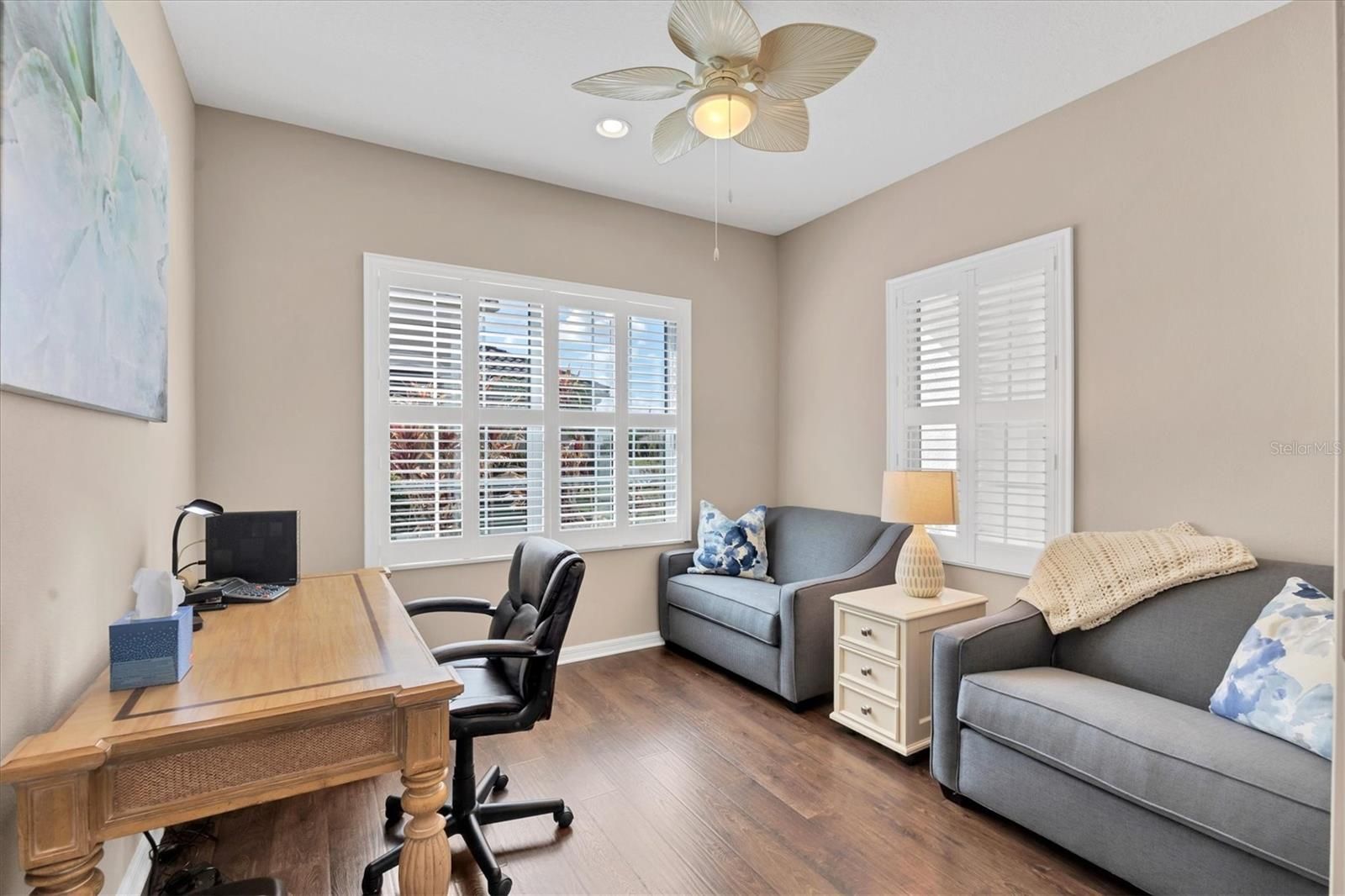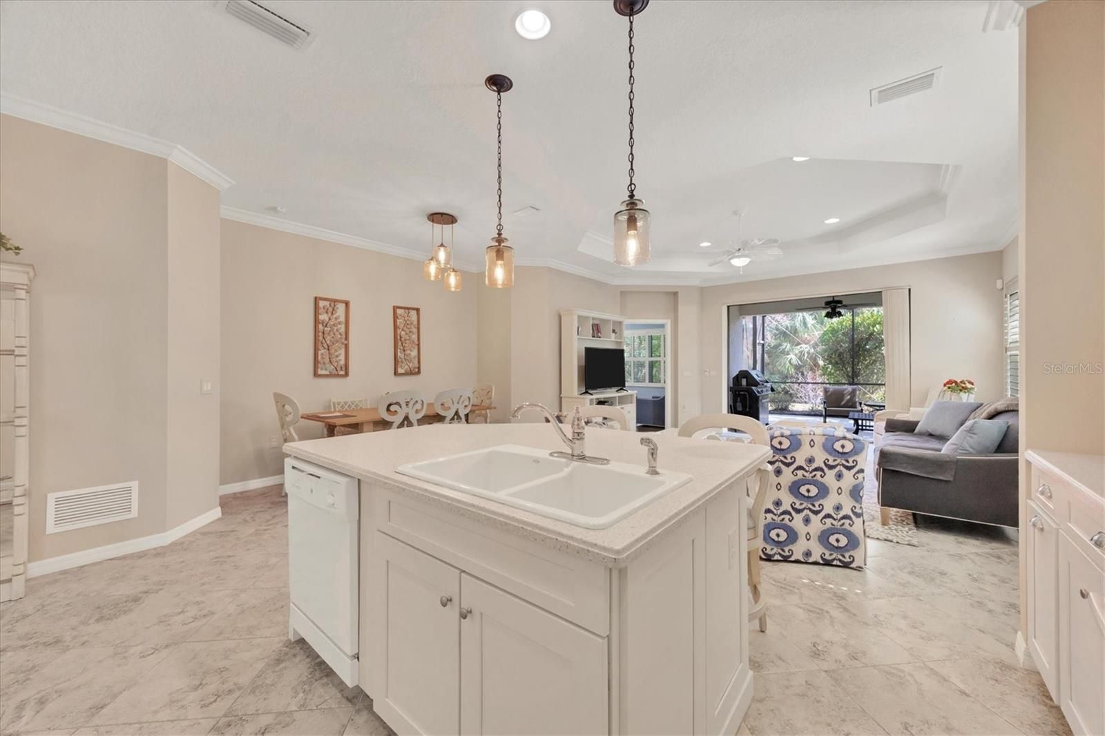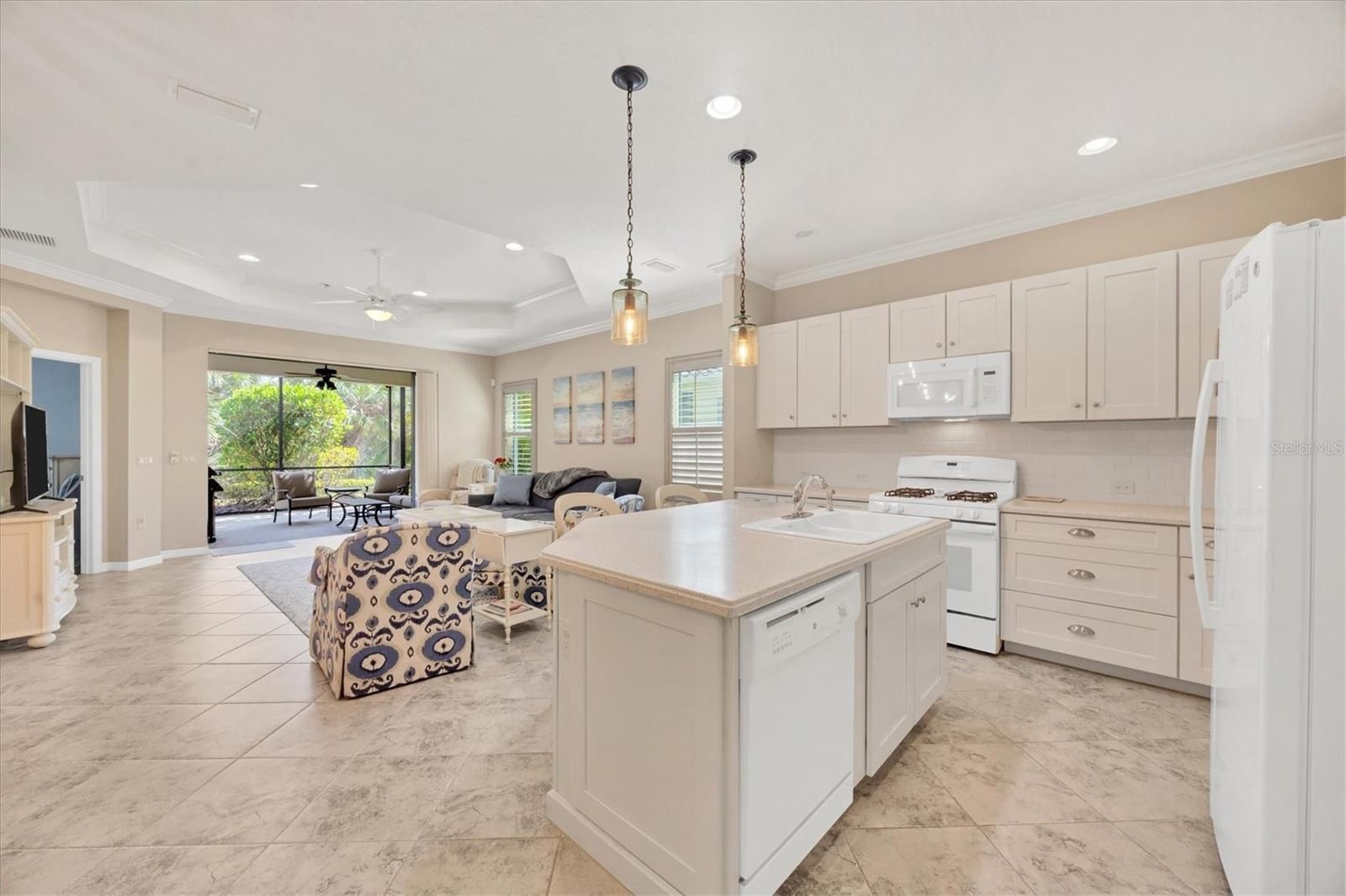 Welcome to your dream retreat in the exceptional gated Grand Palm community! This spacious, maintenance-free 2-bedroom, 2-bath home with a versatile den combines comfort and convenience. Step into an open and inviting layout featuring a gourmet kitchen with Corian countertops, high vaulted ceilings, and a great room perfect for entertaining. The main living areas and bathrooms showcase elegant tile floors, while luxury vinyl adds warmth to the bedrooms and den. Enjoy your mornings or evenings on the expansive, screened-in lanai overlooking the lush surroundings. Fully furnished, this home is move-in ready for you to start enjoying immediately. Beyond your doorstep, Grand Palm offers an impressive array of resort-style amenities. With two clubhouses, a resort-style pool, lap pool, spa, fitness center, and gathering hall, there's something for everyone. Sports enthusiasts can enjoy tennis, pickleball, and miles of scenic walking trails, while the pier offers a peaceful spot for fishing. A playground, dog park, and numerous other recreational spaces make this community truly unique. Experience the best in maintenance-free living at Grand Palm!