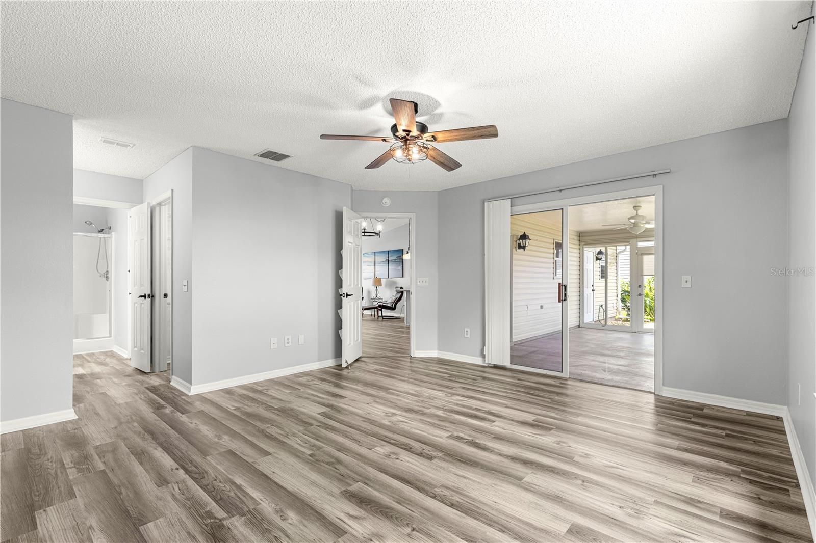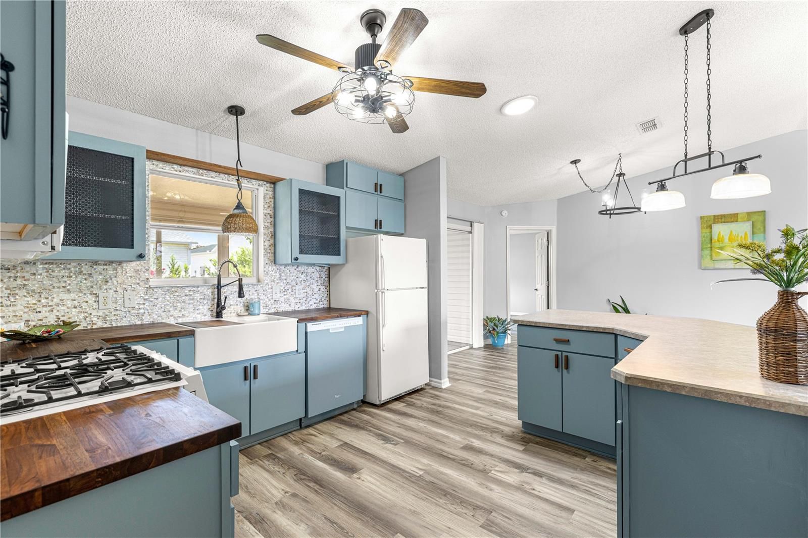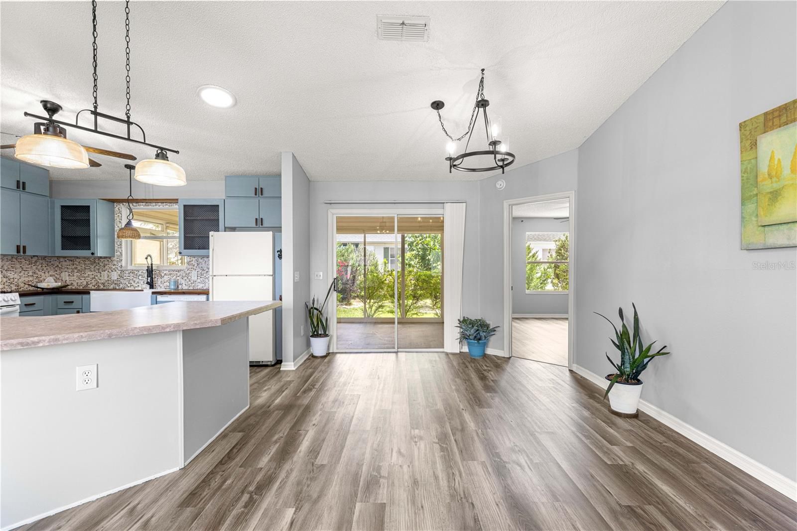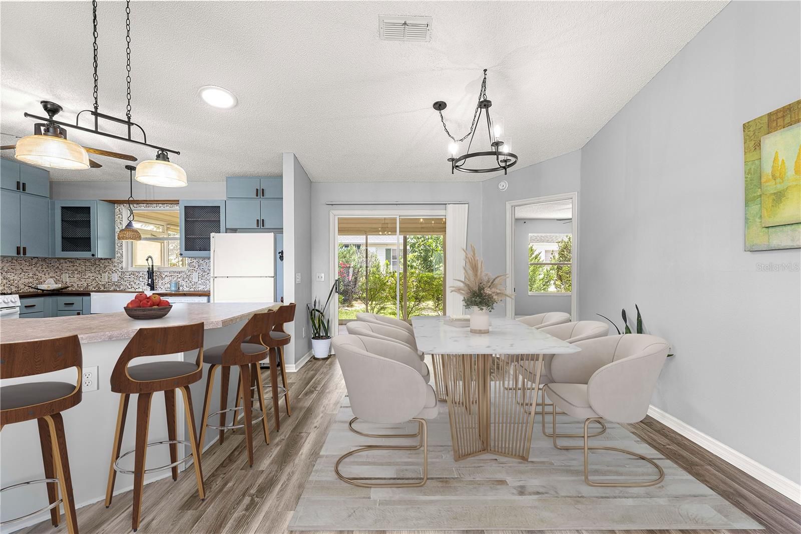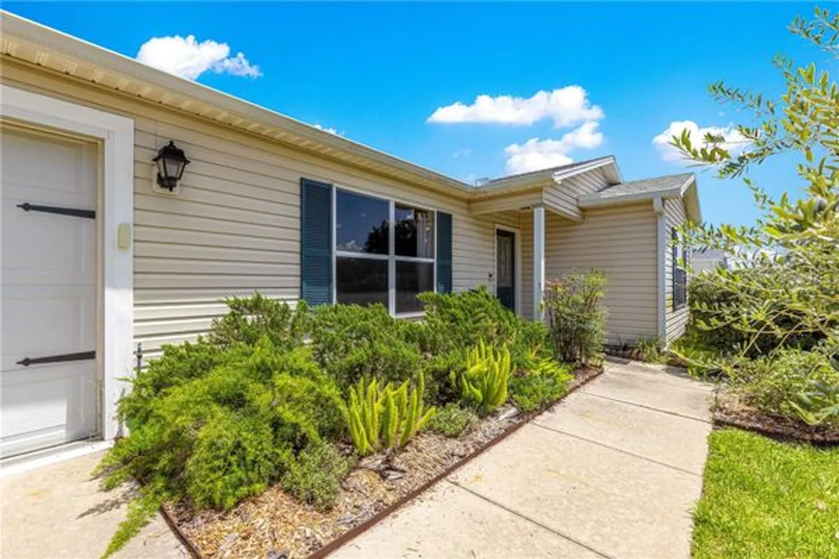 One or more photo(s) has been virtually staged. Start living The Villages® lifestyle today! Well cared for 2 bedroom, 2 bath home, located near Spanish Springs Town Square® - BOND IS PAID ! The home offers an open floor plan with HIGH CEILING - in the living, dining and kitchen area - Luxury Vinyl Plank Flooring is throughout the entire home - NO CARPET - The Kitchen has custom TEAK and laminate counter tops, gas range, expanded cabinets along with under cabinet lighting, shell backsplash, a large farm sink with a goose neck faucet, updated lighting, a sliding spice rack and a solar tube - The Livingroom and Dining area layout is perfect for entertaining friends and family - The owners bedroom has a sliding door to the lanai, ceiling fan, and a WALK in Closet! The ensuite bath offers a step in shower with a glass door and a handheld shower head - The GUEST area has a Barndoor to offer privacy for your guest! The guest bedroom has an updated ceiling fan - The guest bath offers a shower/tub combination and a solar tube - The 20' x 12' Lanai is GLASSED enclosed, and has a ceiling fan and PRIVACY LANDSCAPING! The yard is also enhanced with 5 fruit trees - Orange, Peach, Mulberry, Loquat and Italian Black Olives ! The garage offers a keyless entry, utility sink along with washer and dryer - The ROOF WAS REPLACED IN 2018 & HVAC 2016 - The home is conveniently located near The Savannah Regional Recreation Center, El Santiago Village Recreation Center, Glenview Golf and Country Club, The Villages® Polo Club & Saddlebrook Softball Complex- where pools, tennis, pickleball and so much more - are all just a golf car ride away!
