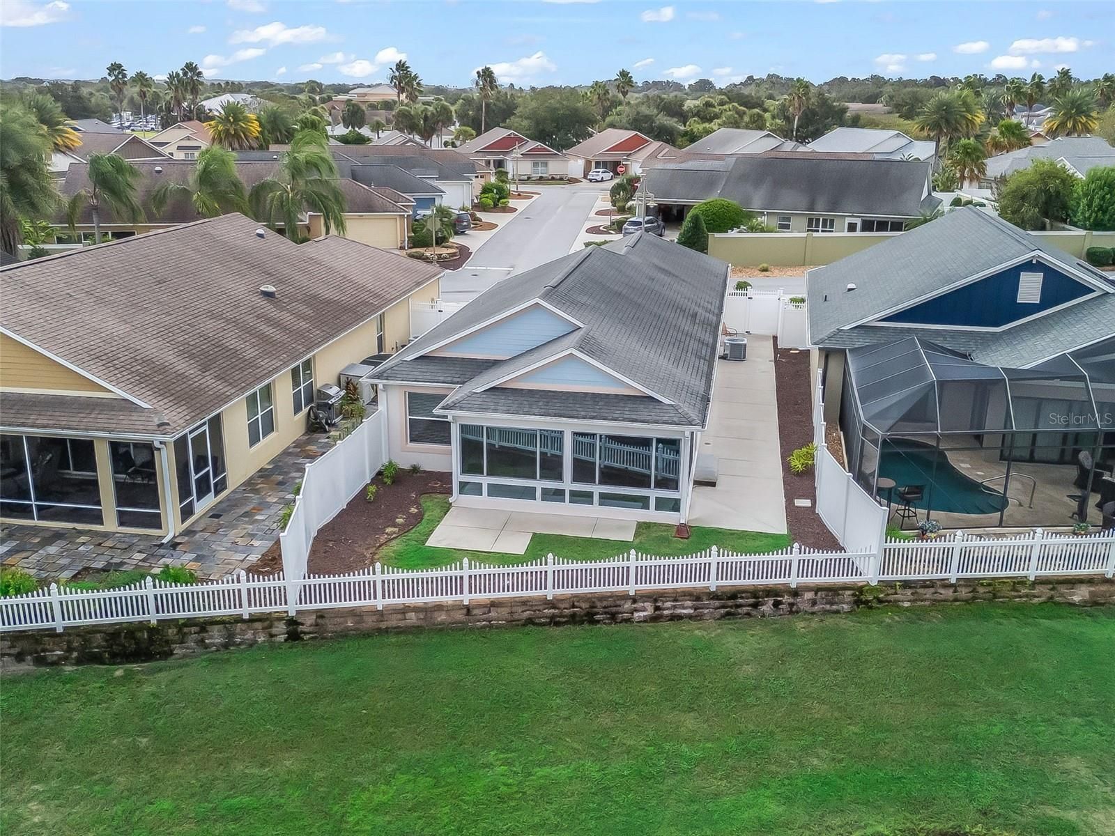 Spectacular WATERFRONT & GOLF-FRONT home – Steps to Lake Sumter Landing! This one-of-a-kind property at EDGEWATER BUNGALOWS offers the perfect blend of location, lifestyle, and comfort. Situated on a premier waterfront and golf front site, this residence showcases sweeping views of LAKE SUMTER and a serene setting. Inside, you’ll find an open floor plan with soaring high ceilings, creating a bright and spacious atmosphere. The kitchen featuring maple cabinetry includes LG stainless steel appliances (2023), Bosch Dishwasher (2025) and an open floor plan - open to the main living areas. A climate-controlled, SPACIOUS, enclosed lanai with high-end glass windows and screens, adds square footage and invites you to relax or entertain year-round while enjoying the beautiful backdrop. No carpet throughout this lovely home featuring tile and laminate floors- this versatile layout is designed for easy living. Just a short walk to Lake Sumter Landing’s entertainment, dining, and shopping - this location can’t be beat. This home has NO BOND! New landscaping installed in 2023.