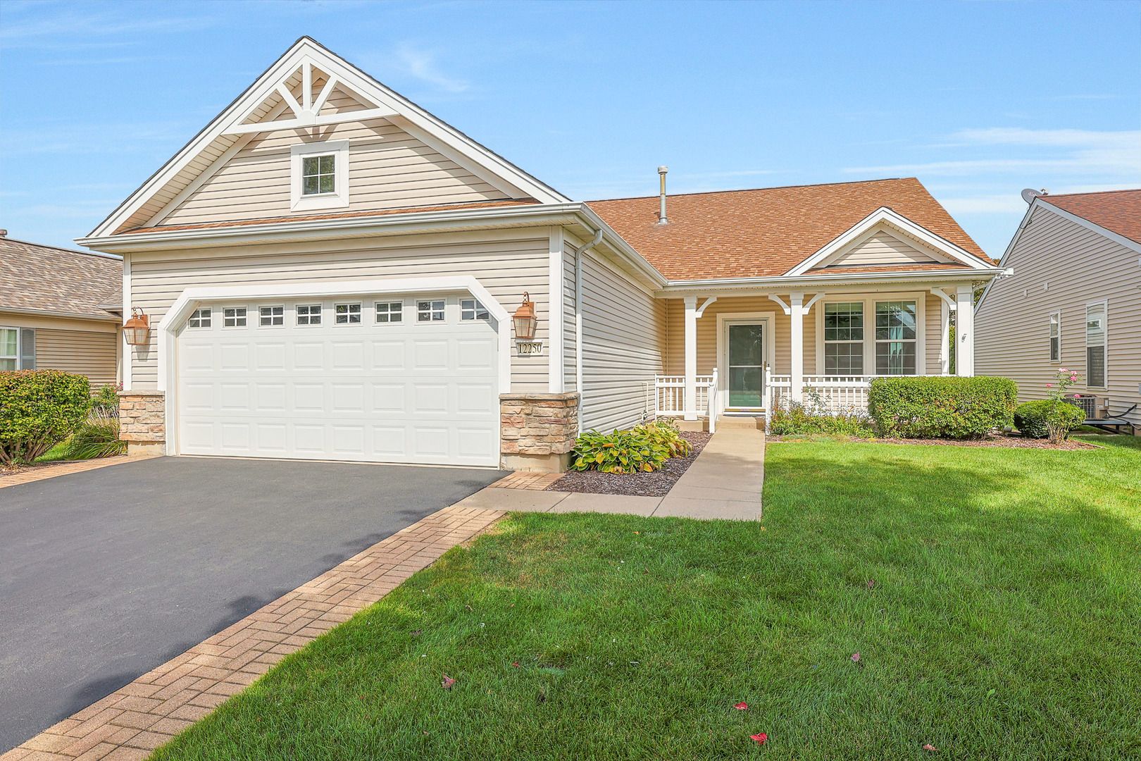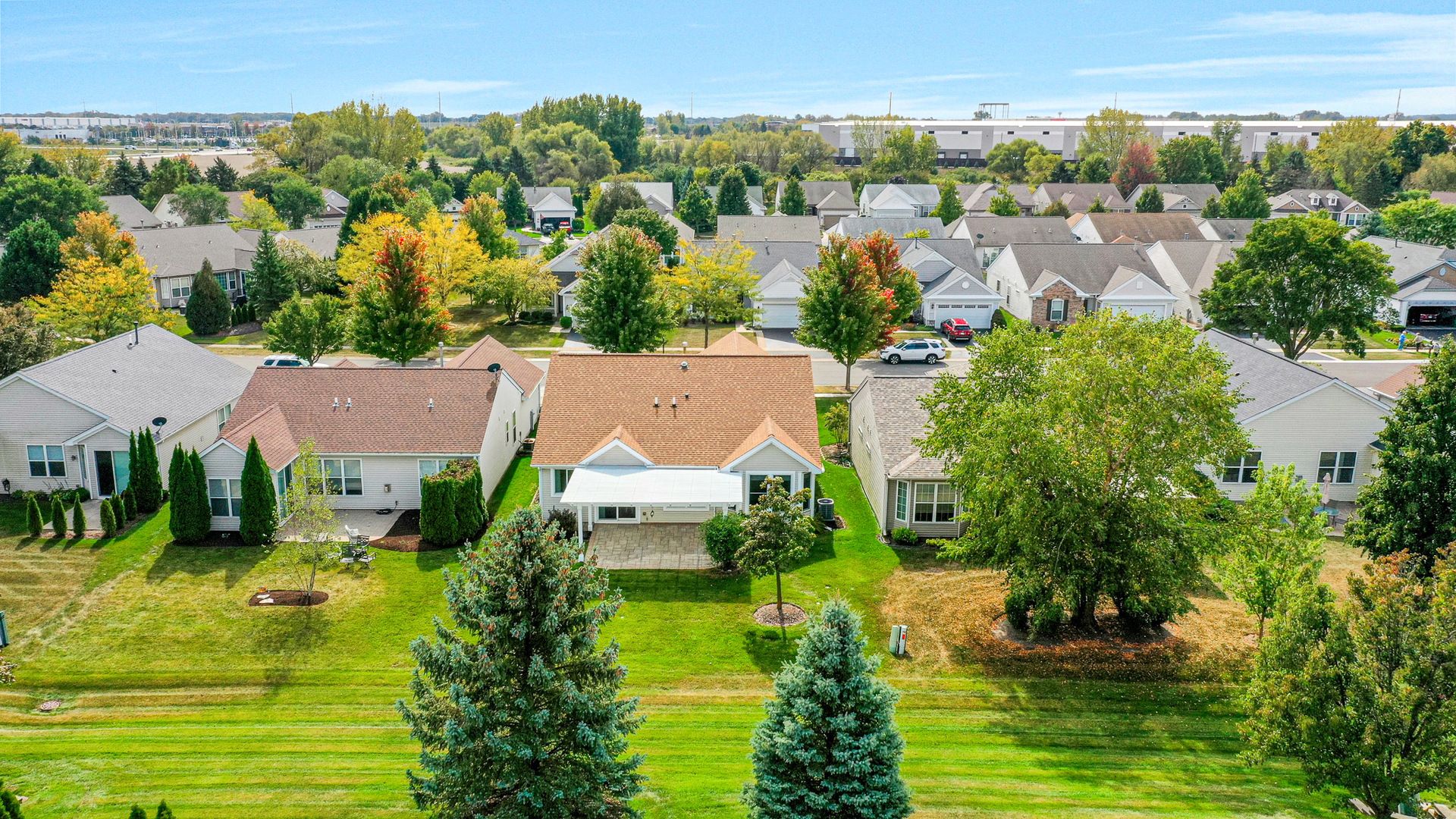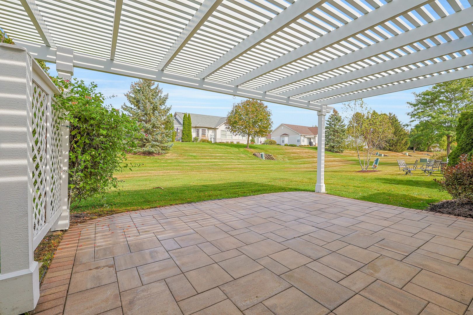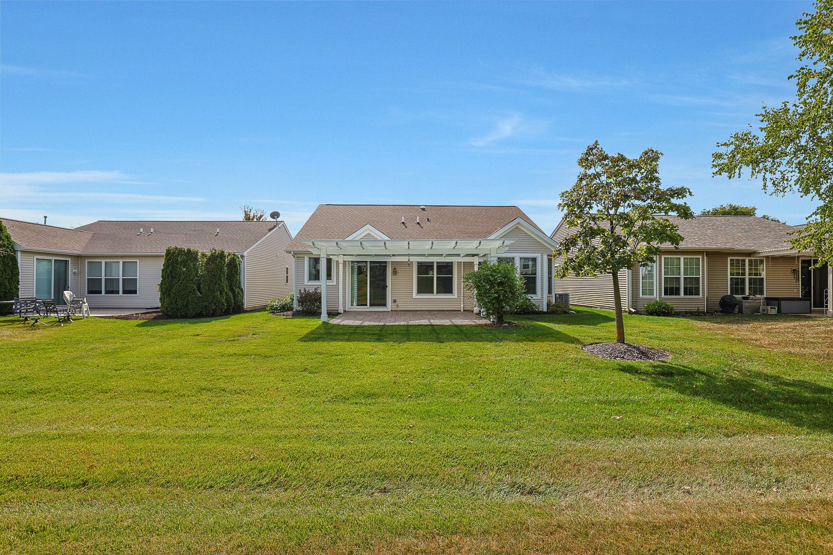 Nothing to do but move into this airy Manistee model with bonus room! This 2-bedroom, 2-bathroom home offers fresh carpet and paint (2025) and a spacious layout. The tile foyer opens to a bright living/dining room, while the kitchen and family room showcase beautiful hardwood floors. The eat-in kitchen features newer granite countertops, updated faucet, oak cabinets, and a new microwave (2025). The primary suite includes a bay window, large walk-in closet, and private bath. Additional updates include: new driveway (2023), roof (2020), hot water tank (2021), and HVAC (2019). Enjoy the stone elevation with brick paver accents in front and step out back to a huge brick paver patio (2020) with oversized pergola overlooking a deep lot and berm. Other highlights include ceiling fans throughout, lever door handles, 2 solar tubes, lawn irrigation system, laundry sink and replacement windows in the kitchen, den, and primary bedroom (2009). All located in Del Webb Sun City, an active 55+ resort-style community offering 2 lodges, indoor and outdoor pools, golf, tennis, bocce, and so much more!