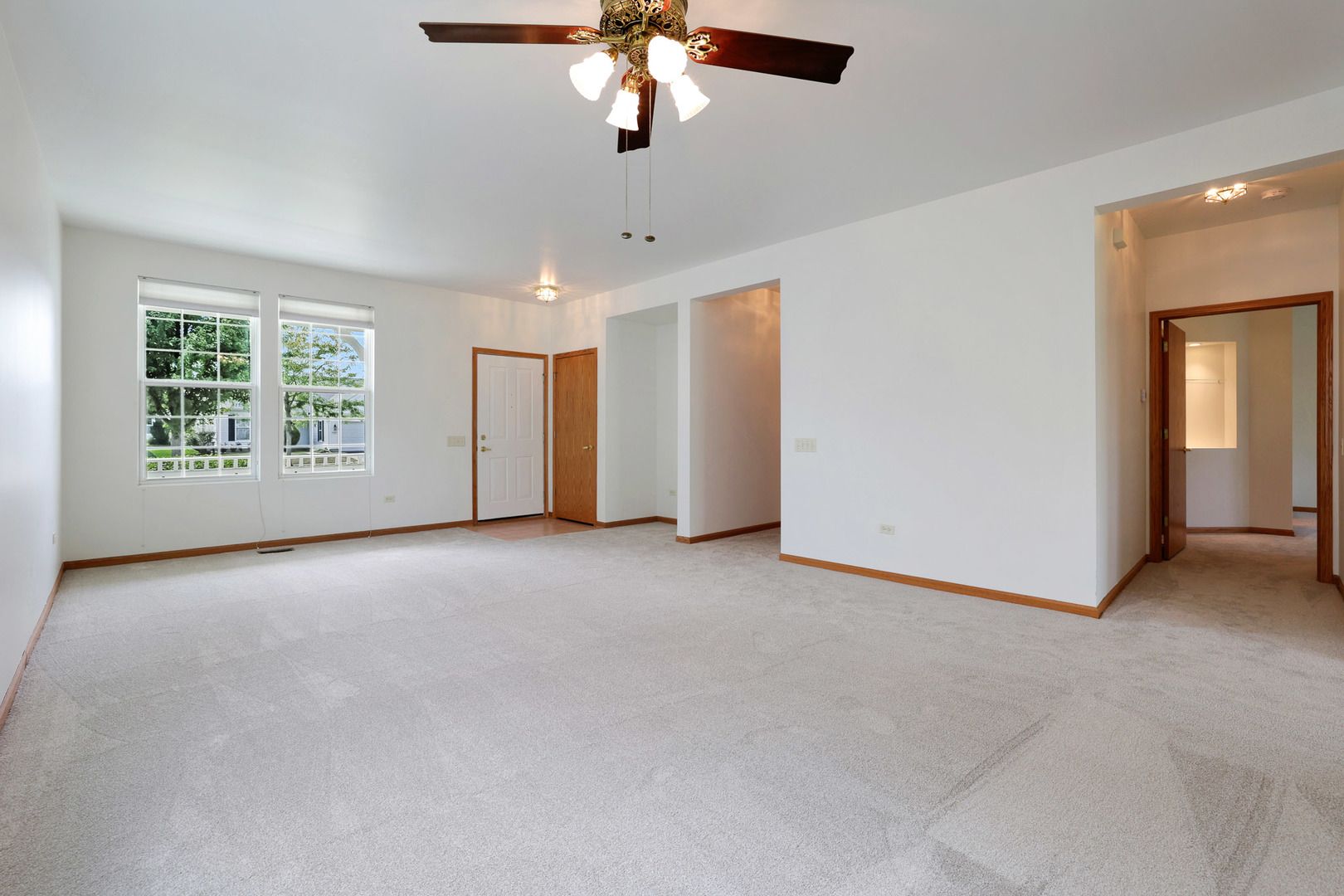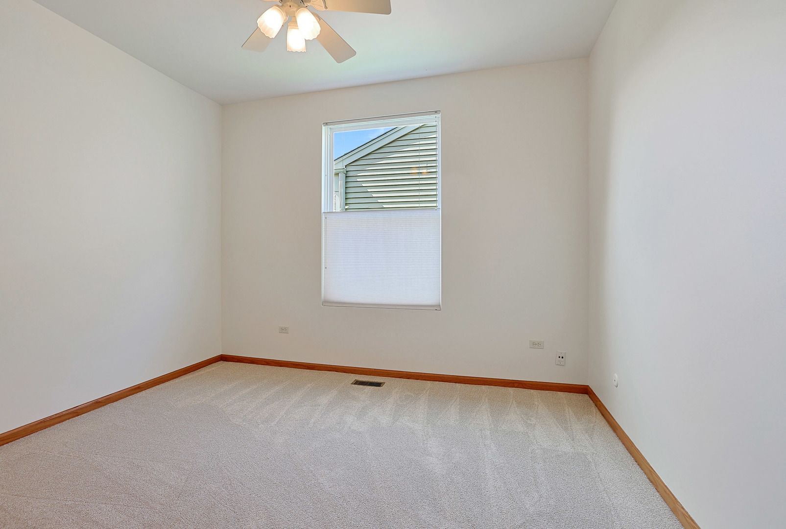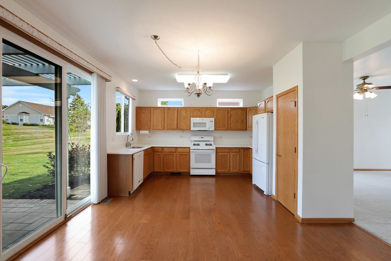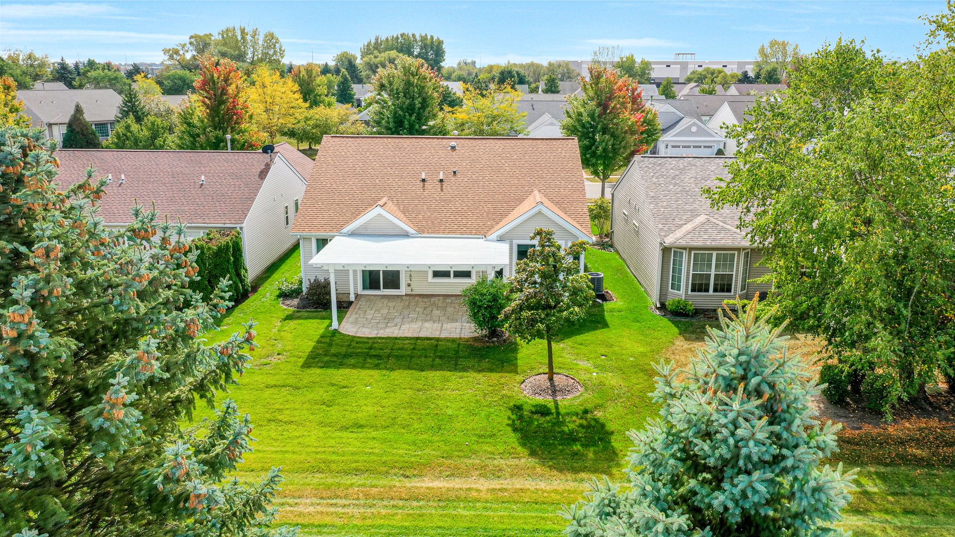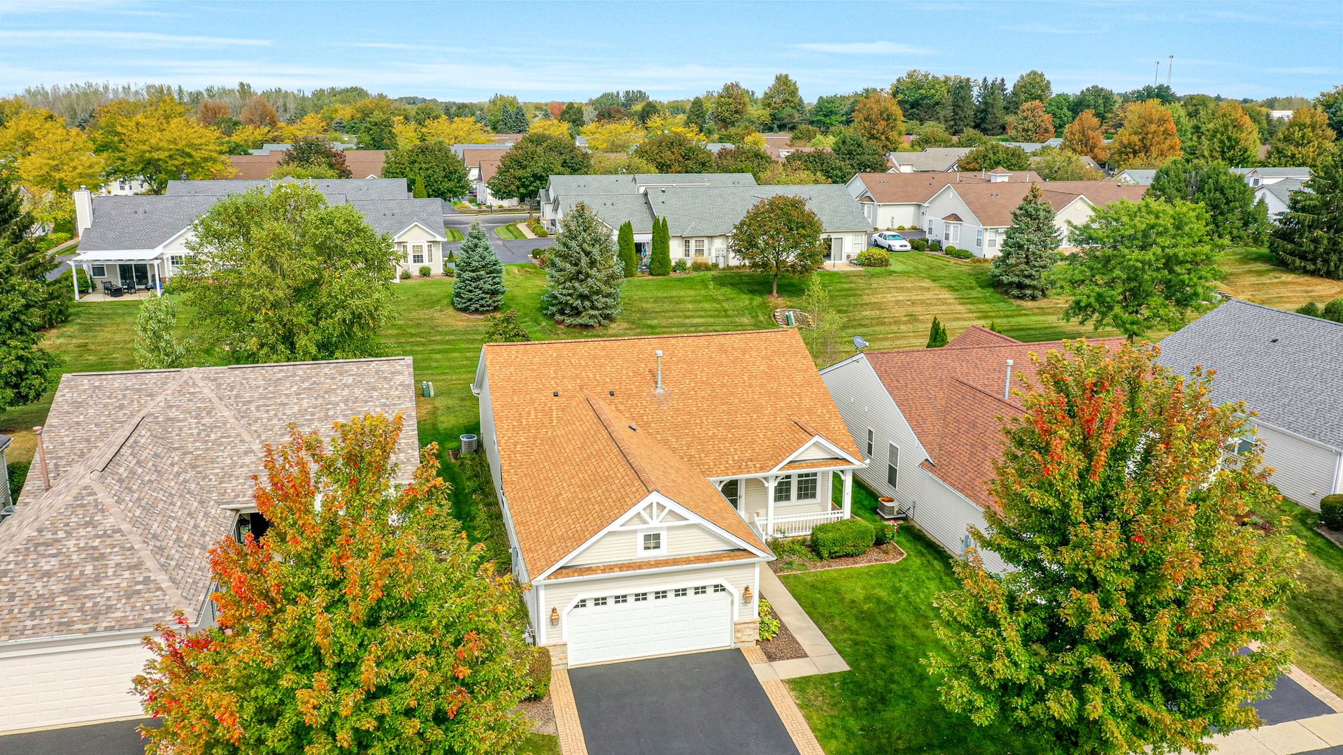 Nothing to do but move into this airy Manistee model with bonus room! This 2-bedroom, 2-bathroom home offers fresh carpet and paint (2025) and a spacious layout. The tile foyer opens to a bright living/dining room, while the kitchen and family room showcase beautiful hardwood floors. The eat-in kitchen features newer granite countertops, updated faucet, oak cabinets, and a new microwave (2025). The primary suite includes a bay window, large walk-in closet, and private bath. Additional updates include: new driveway (2023), roof (2020), hot water tank (2021), and HVAC (2019). Enjoy the stone elevation with brick paver accents in front and step out back to a huge brick paver patio (2020) with oversized pergola overlooking a deep lot and berm. Other highlights include ceiling fans throughout, lever door handles, 2 solar tubes, lawn irrigation system, laundry sink and replacement windows in the kitchen, den, and primary bedroom (2009). All located in Del Webb Sun City, an active 55+ resort-style community offering 2 lodges, indoor and outdoor pools, golf, tennis, bocce, and so much more!