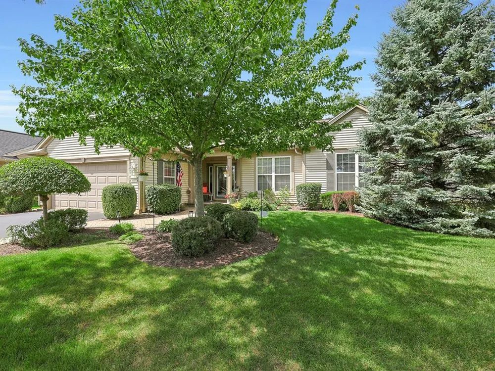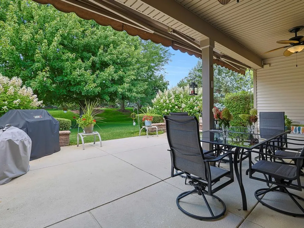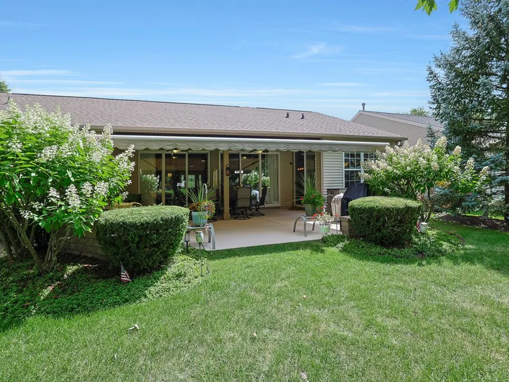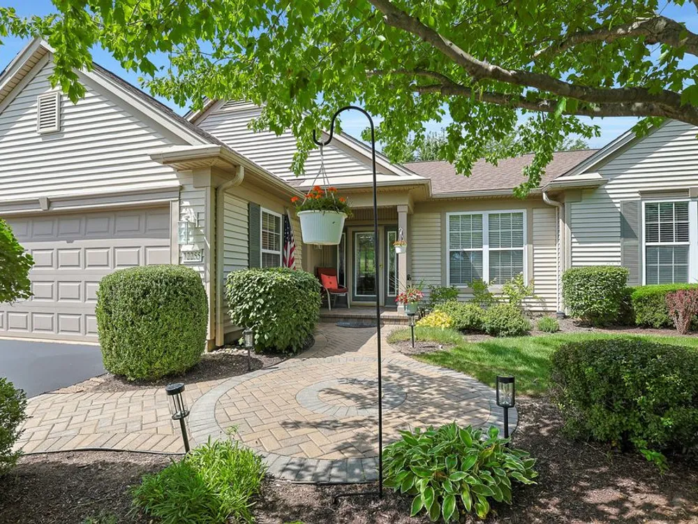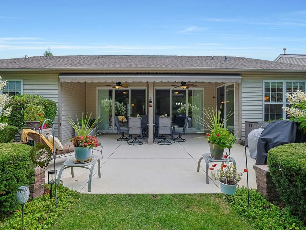 Move in ready Adler with private backyard. Walk into a welcoming foyer with tile floors that leads to a spacious, light-filled open floor plan. Hardwood floors extend through the family and dining room, creating a warm and inviting feel. The gourmet kitchen is a true highlight with granite countertops, stainless appliances, 42" white cabinets with crown molding and hardware, an updated sink and faucet, a breakfast bar, and a sunny breakfast nook. The primary suite features a generous walk-in closet and a private bath with ceramic tile, raised dual vanity, soaking tub, and walk-in shower. A modern second bath with a tiled walk-in shower is sure to impress. French doors open to the versatile den, complete with hardwood floors and built-in desk and cabinetry. Step outside to a private backyard designed for relaxation, offering a large concrete patio, power awning, and lush landscaping for added privacy. Additional highlights include crown molding, updated lighting, stylish ceiling fans, panel doors, and custom window treatments. The laundry room is equipped with a front-load washer and dryer, tile backsplash, and utility sink. Exterior features include a brick ribbon driveway, brick front walkway, lawn sprinkler system, and professional landscaping. Roof has been replaced. Water heater replaced in 2018. Enjoy the active adult, 55+ resort-style community with two outdoor pools, an indoor pool, fitness facilities, and countless activities.