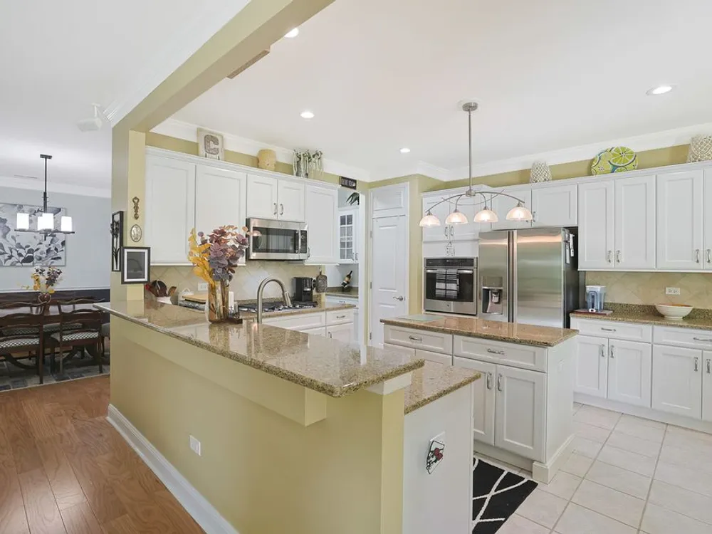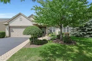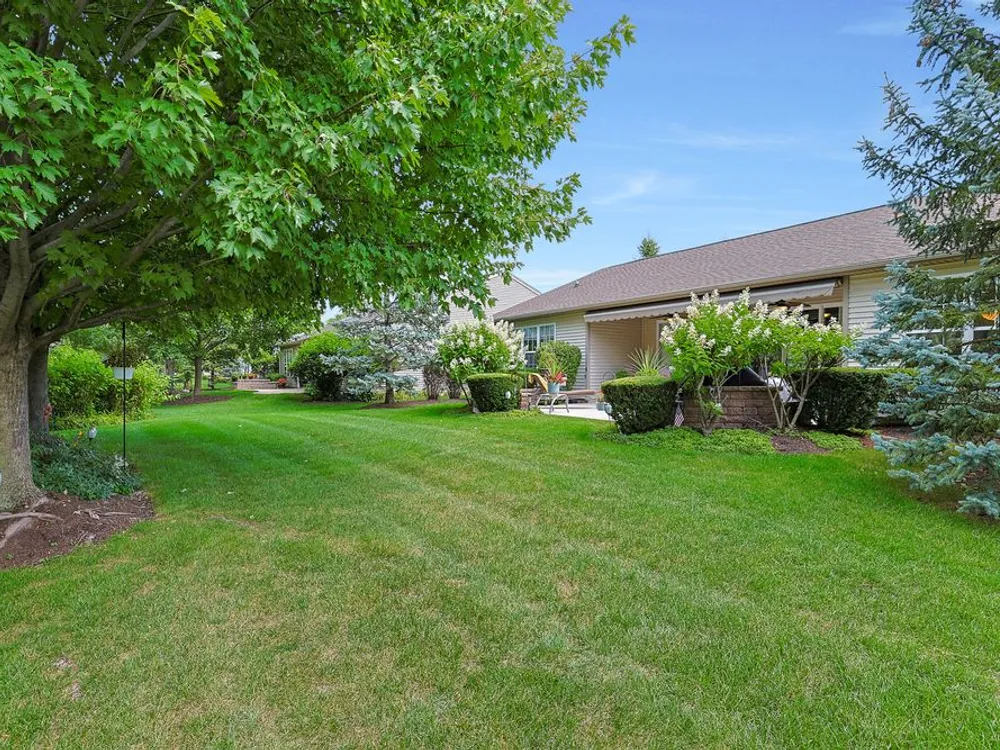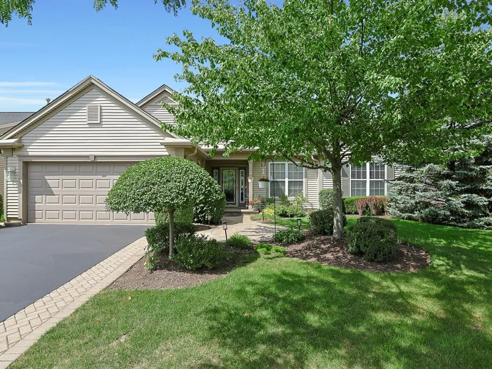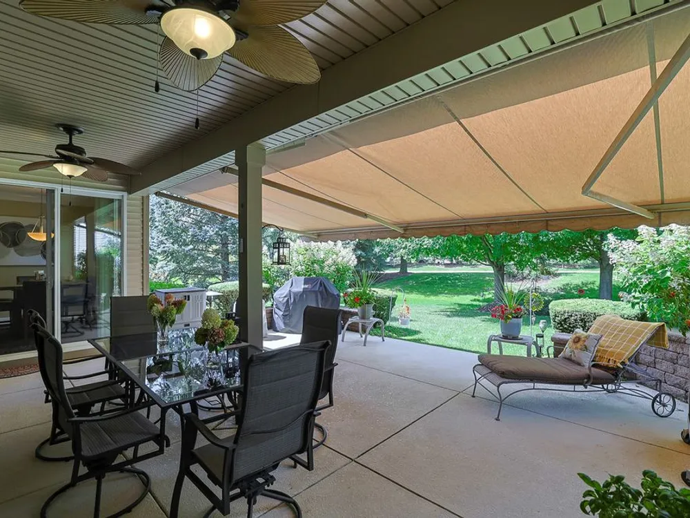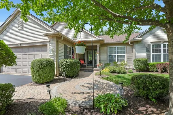 Move in ready Adler with private backyard. Walk into a welcoming foyer with tile floors that leads to a spacious, light-filled open floor plan. Hardwood floors extend through the family and dining room, creating a warm and inviting feel. The gourmet kitchen is a true highlight with granite countertops, stainless appliances, 42" white cabinets with crown molding and hardware, an updated sink and faucet, a breakfast bar, and a sunny breakfast nook. The primary suite features a generous walk-in closet and a private bath with ceramic tile, raised dual vanity, soaking tub, and walk-in shower. A modern second bath with a tiled walk-in shower is sure to impress. French doors open to the versatile den, complete with hardwood floors and built-in desk and cabinetry. Step outside to a private backyard designed for relaxation, offering a large concrete patio, power awning, and lush landscaping for added privacy. Additional highlights include crown molding, updated lighting, stylish ceiling fans, panel doors, and custom window treatments. The laundry room is equipped with a front-load washer and dryer, tile backsplash, and utility sink. Exterior features include a brick ribbon driveway, brick front walkway, lawn sprinkler system, and professional landscaping. Roof has been replaced. Water heater replaced in 2018. Enjoy the active adult, 55+ resort-style community with two outdoor pools, an indoor pool, fitness facilities, and countless activities.