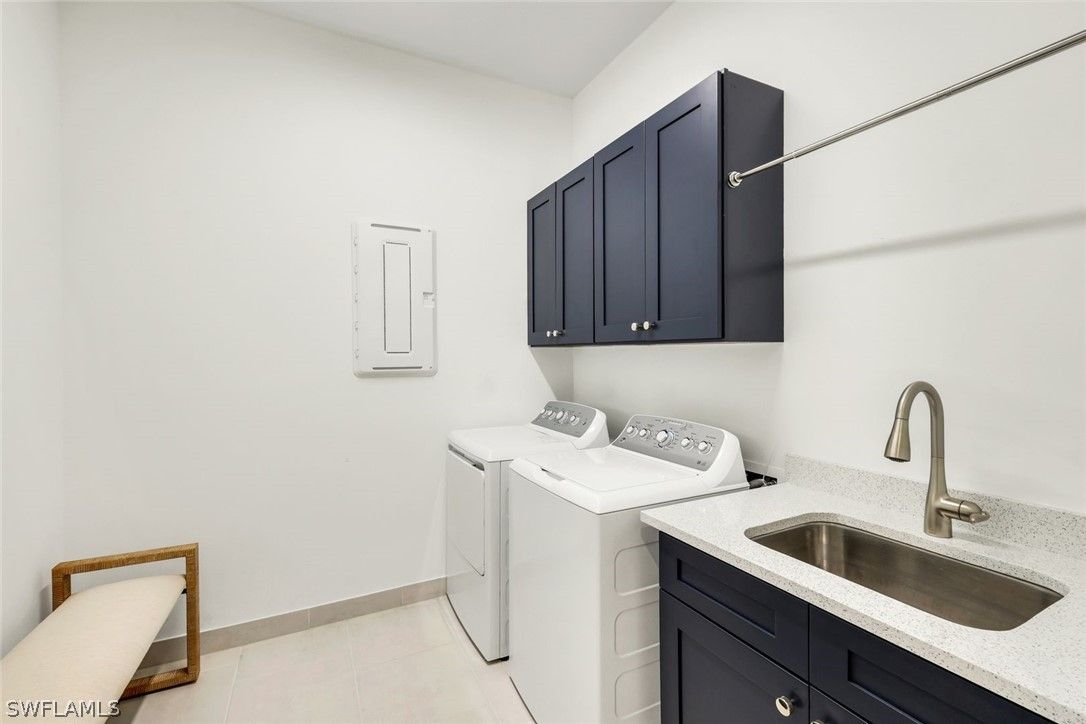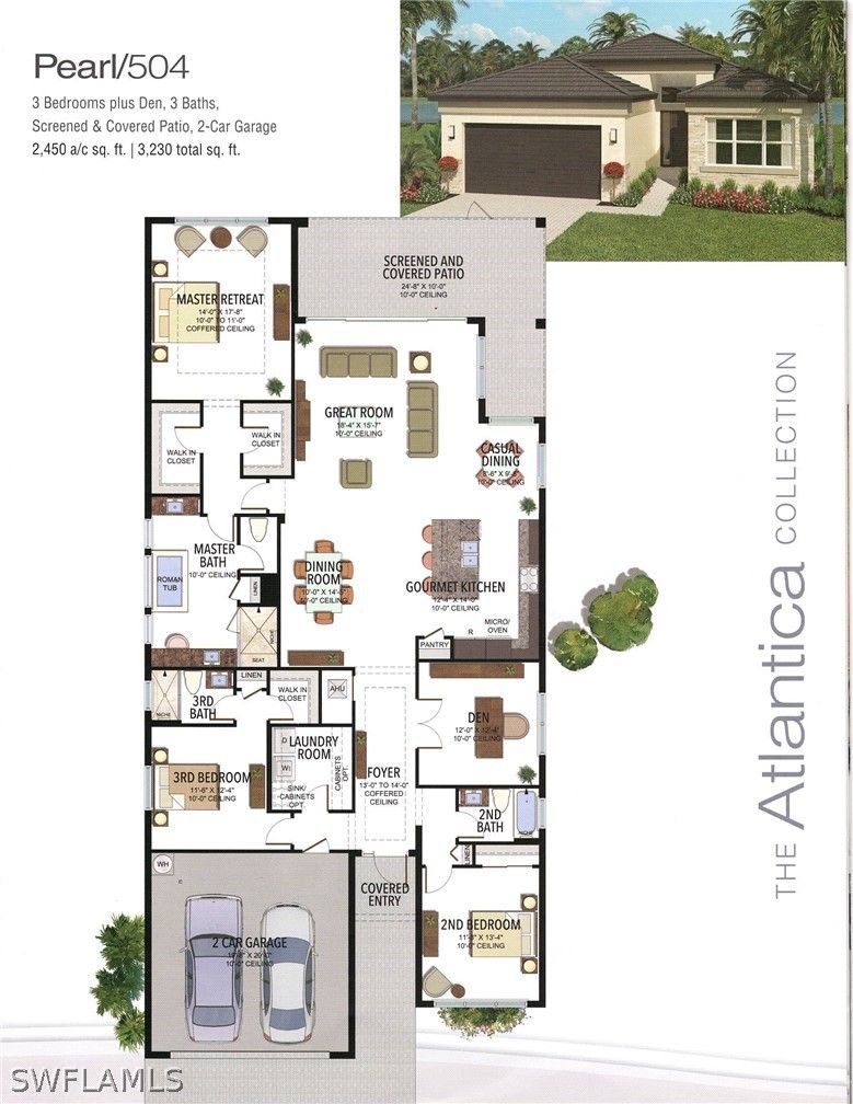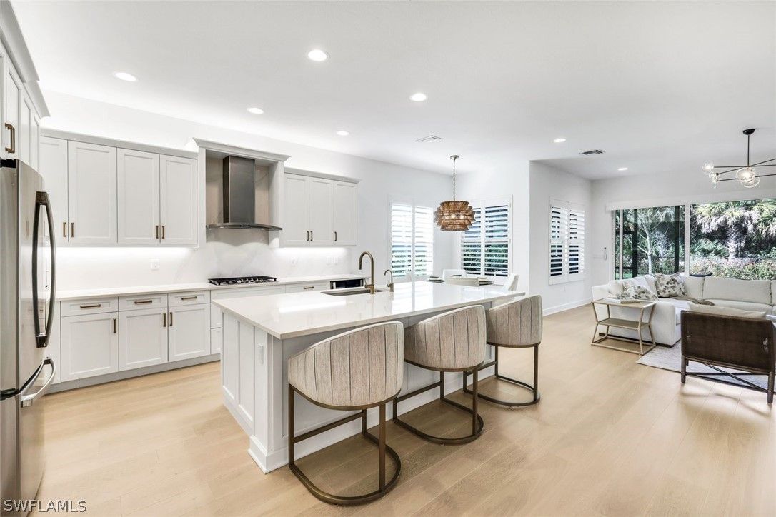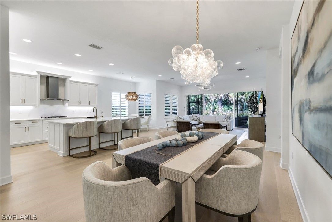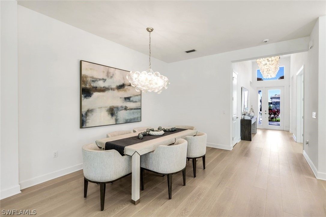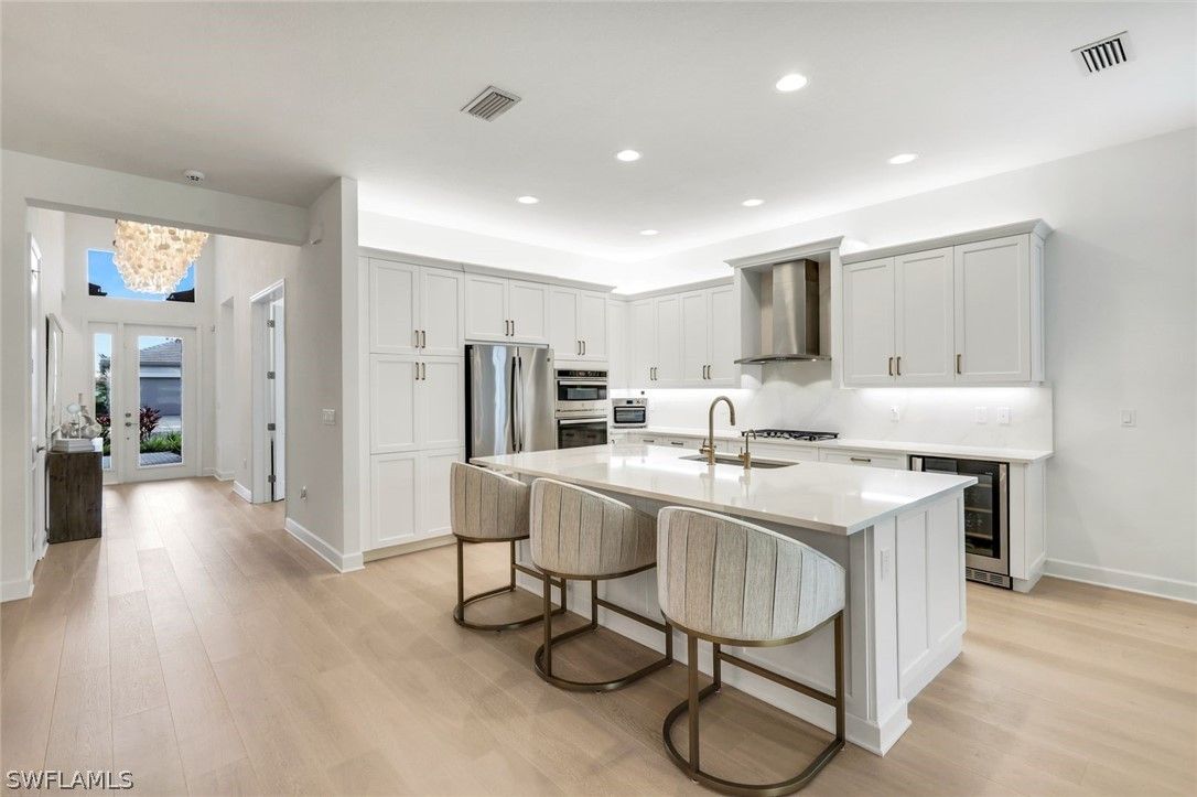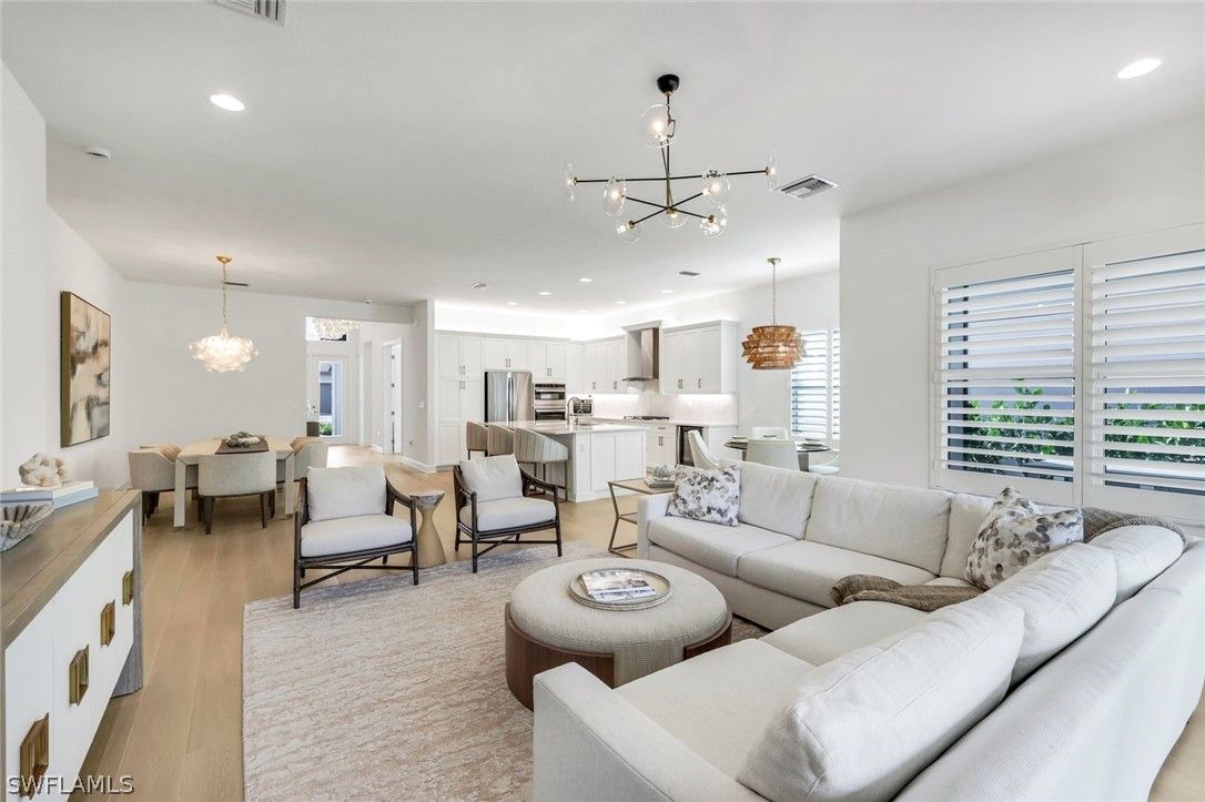 Coastal elegance and effortless living come together in this tastefully appointed Pearl floor plan, ideally positioned within the vibrant community of Valencia Trails. With over $200,000 in builder upgrades and owner customizations, this home showcases an elevated level of finishes and thoughtful design throughout. A glass entry door opens to a welcoming foyer with soaring coffered ceilings accented by dramatic chandeliers. One of the home’s most striking features is the French white oak hardwood flooring installed throughout the main living areas—a custom upgrade that brings warmth, texture, and timeless coastal style well beyond standard builder finishes. Curated lighting fixtures, designer ceiling fans, and plantation shutters further enhance the home’s refined interior. The great room flows seamlessly into both formal and casual dining areas and a light-filled gourmet kitchen, creating an inviting space where family and guests can gather with ease. The kitchen features upgraded white shaker cabinetry, quartz countertops and backsplash, a large cabinet-wrapped island, deep single-bowl sink, instant hot faucet, champagne-toned faucet and hardware, and ambient lighting. GE appliances include a gas cooktop, vented hood, and beverage refrigerator, offering everyday functionality. The split-bedroom floor plan offers privacy for owners and guests alike. The spacious primary suite includes two finished walk-in closets and a spa-like bath with dual vanities, a soaking tub, and an oversized walk-in shower with multiple shower heads, bench seating, and frameless glass enclosure. Two guest bedrooms and two full baths provide inviting space for visitors, complemented by a versatile French-door den ideal for a home office, media room, or sitting area. Indoor living extends naturally to the L-shaped screened lanai, designed with separate areas for relaxing and dining. An outdoor kitchen makes entertaining easy while the peaceful western preserve view provides a beautiful backdrop for evening sunsets. The homesite offers ample room to create your own outdoor oasis with space for a future pool. Additional features include hurricane-impact windows and doors, a finished laundry room with GE washer and dryer, cabinetry and sink, and a prime location within the community with quick and convenient access to the Vanderbilt Beach Road entrance. This thoughtfully designed Pearl floor plan offers 2,450 square feet of well-planned living space, creating a home that feels both spacious and easy to maintain—an ideal choice for year-round residents or seasonal snowbirds. Valencia Trails is more than a community—it’s a lifestyle. This exclusive 55+ neighborhood offers a spectacular 43,000-square-foot clubhouse featuring a gourmet restaurant, poolside bar, resort-style pools, fitness center, pickleball, tennis, bocce, yoga studio, art studio, cooking classes, spa, dog park, and a vibrant social calendar. Here, every day feels like a resort getaway.