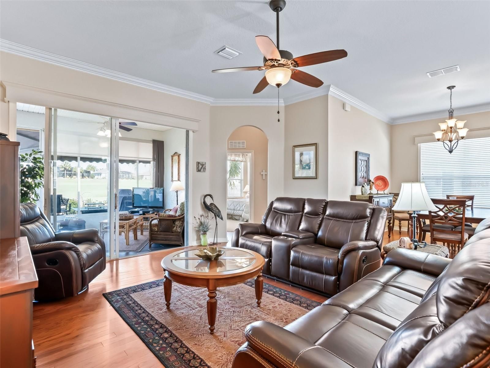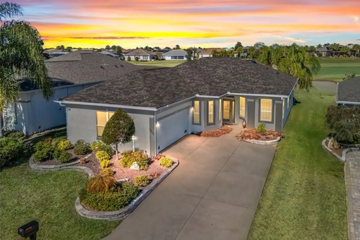 STONECREST-WHETHER YOUR RETIRED OR WORKING FROM HOME YOU WILL HAVE THE BENEFITS OF AN ACTIVE LIFESTYLE, NO SNOW, TAX ADVANTAGES, BEAUTIFUL OUTDOOR SPACES TO ENJOY, AND A HOME OFFICE WITH SERVICES AT YOUR FINGERTIPS. INSTANT HOME OPPORTUNITY AWAITS YOU IN THE SUNSHINE STATE LOCATED ON ONE OF THE LARGEST CUL DE SACS IN THE COMMUNITY SURROUNDED BY THE PRISTINE GOLF COURSE! Welcome home to this BEAUTIFUL, QUITE, LOW TRAFFIC, TURNKEY, GOLF-FRONT St. Johns model on the 7th fairway in the sought-after Stonecrest gated golf community. Your NEW LIFESTYLE will be enhanced by the 1,768 SF under heat and air, plus a MAGNIFICANT additional 178 SF Florida room with view of the course, bringing even more space to enjoy the Florida lifestyle. Recent improvements include a 2023 roof, 2 solar fans on the roof, 2018 HVAC, 2021 water heater, water softener AND AN ANTENNA WHICH BRINGS IN ABOUT 50 CHANNELS. Beautifully landscaped with palm trees, stone accents at the foundation, gutters, exterior lighting, private mailbox, and an inviting covered entry. A leaded glass front door with sidelight and transom window that opens to a foyer, along with a storm door, creates a stunning first impression. Inside, you’ll find tall ceilings, crown molding, hardwood floors, newer carpeting in the bedrooms, lever handles throughout, ceiling fans, and an open floor plan designed for both comfort and entertaining. The front foyer leads to a den with French doors, followed by a spacious open dining area. The kitchen features a FULL VIEW OF THE GOLF COURSE, granite countertops, stainless steel appliances, recessed LED lighting, tall cabinetry, breakfast bar, a center island w/ storage, a closet pantry, and a casual dining nook with three bay windows. THE GREAT ROOM HAS VIEW VIEWS OF THE GOLF COURSE THROUGH 3 PANES OF SLIDING GLASS DOORS which makes for a very inviting space! An inside laundry room with cabinets adds convenience and right off the garage and kitchen. The guest bath includes a tall vanity with granite countertops, a tub/shower combination, and a large privacy window. This is a split floor plan so the spacious owner’s suite is privately located and separated by French doors, and showcases a three-bay window with golf course views, a large walk-in closet with custom shelving, and a luxurious ensuite bath with a large soaking tub, a pvt. water closet, a second large closet, a large privacy window, a linen closet, tall vanities with granite, and a built in gender-neutral artistry station. Enjoy outdoor living in the 12x15 full-view Florida room featuring PORCELAIN plank flooring, roll-down shades, and a remote-controlled ceiling fan, which opens to a 24x18 open patio complete with a newer LED fire pit, gas grill, tables, and chairs, creating the BEST outdoor space for relaxation. The garage offers cabinets, an external key pad, workbenches, and an attic shuttle. A GAS GOLF CART is available for purchase or negotiation. The Seller will remove some select personal items prior to closing. Stonecrest is a deed-restricted, active golf community offering 18 holes of championship golf, four pools including an indoor pool and spa, a fully equipped fitness center, lighted pickleball courts, softball, and a vibrant social calendar with dozens of clubs and activities. Golf cart access to nearby shopping adds to the convenience. The community clubhouse features a popular casual dining restaurant and pro shop and serves as the heart of social life. Welcome Home.