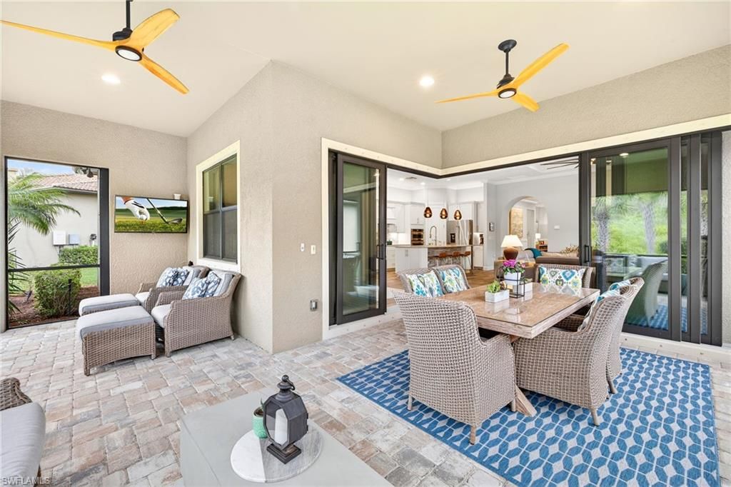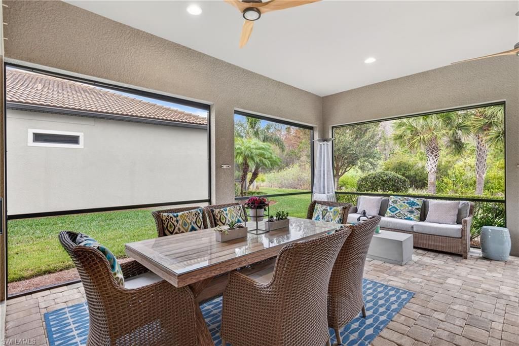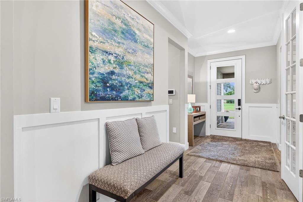 Move in ready and beautifully appointed! This stunning Summerwood (2017) offers three bedrooms, two baths, plus a den, and showcases exceptional interior detailing throughout. Enjoy serene preserve views, a welcoming front porch with an impact glass insert door, and beautifully integrated indoor–outdoor living.The open concept design features white painted maple cabinetry, a large quartz island, KitchenAid stainless steel appliances, induction cooktop, tile backsplash, custom built walk-in pantry, above cabinet and under cabinet lighting, designer fixtures, and striking Murano glass pendants. Architectural enhancements include coffered ceilings, crown molding, decorative paneling, wainscoting, plantation shutters, wood tray accents, and wood look tile carried throughout the entire home for a cohesive, stylish finish. A zero-corner slider extends the great room to the expansive covered lanai, while 11' ceilings and 8' solid core doors elevate the sense of openness and light. Additional upgrades include Fanimation fans, landscape lighting, and a central vacuum system.The spacious owner’s suite offers a tray ceiling, shiplap feature wall, an oversized walk in shower, double sinks, a private water closet, and a custom built in master closet. Two guest bedrooms share a well appointed bath, and the den provides flexible space for work or relaxation. The upgraded Whirlpool washer/dryer is complemented by a laundry tub and a stylish laundry room backsplash, adding both function and design.Outdoor living shines with a large covered lanai designed for entertaining, framed by peaceful preserve views and protected by Kevlar hurricane screens. The garage features custom storage cabinetry, an epoxy coated floor, and its own AC, creating a clean, organized, and climate controlled workspace.Somerset at The Plantation offers an exceptional amenity package including pickleball, tennis, two pools, sauna, massage and facial rooms, a fitness center, bocce ball, a library, and numerous social clubs. HOA services include Hotwire internet and cable, irrigation, lawn mowing, fertilization, landscape trimming, and mulching. Optional golf and social memberships are available at The Plantation Golf & Country Club, featuring an 18-hole Hurdzan Fry championship course, driving range, putting green, and on-site dining. This home is ideally located near I 75, shopping, dining, RSW airport, and Gulf beaches.