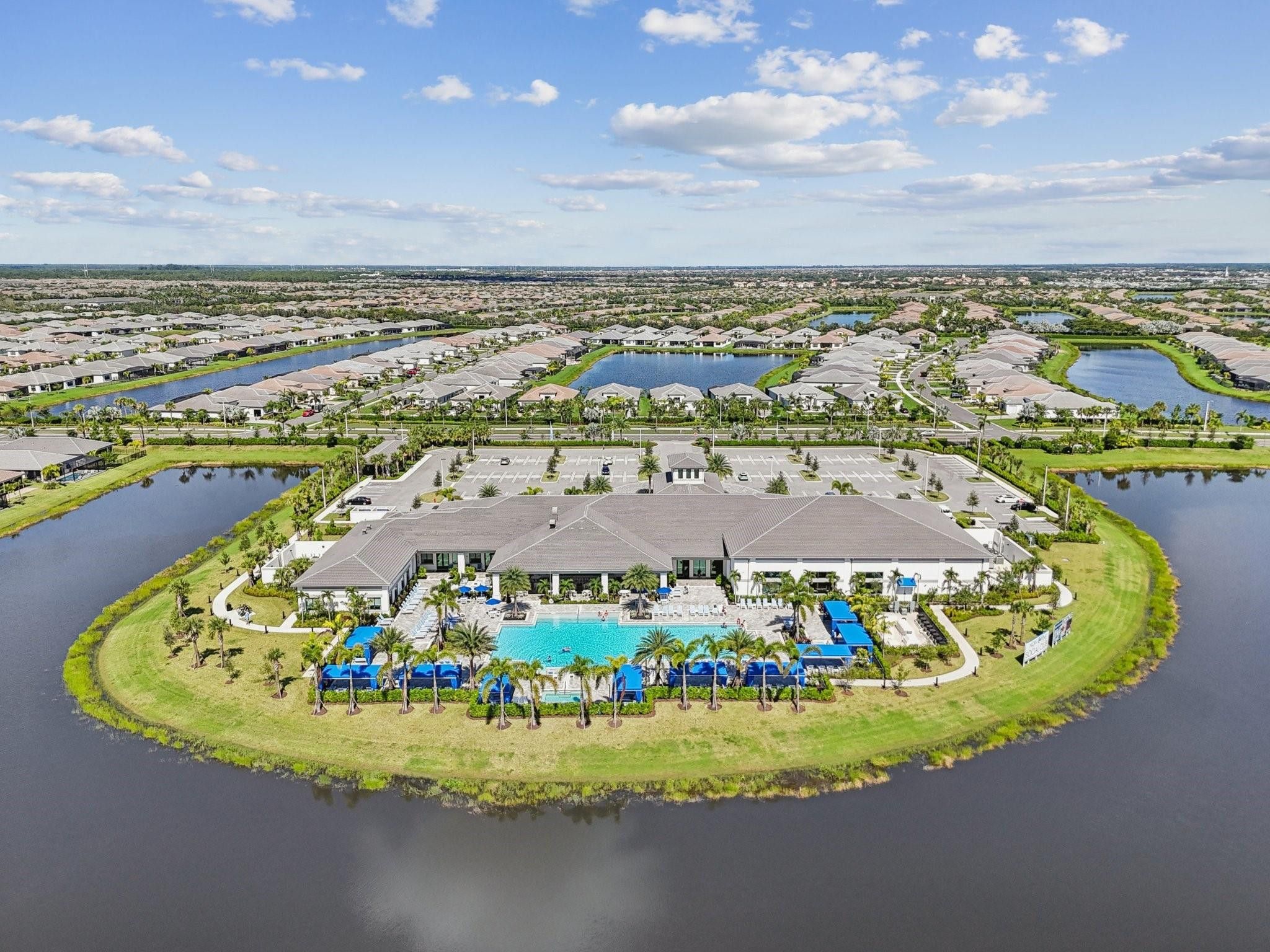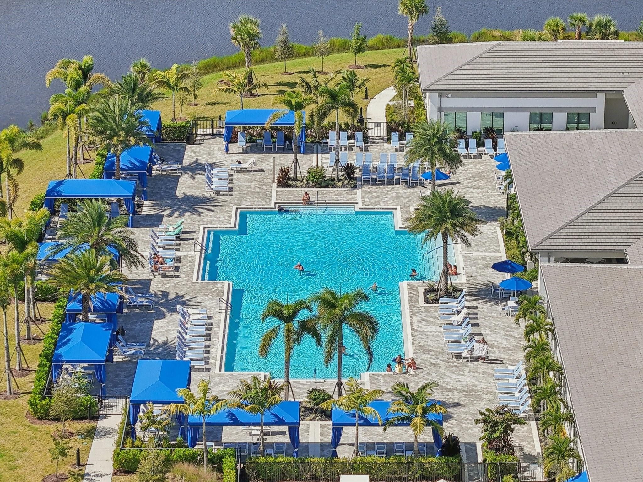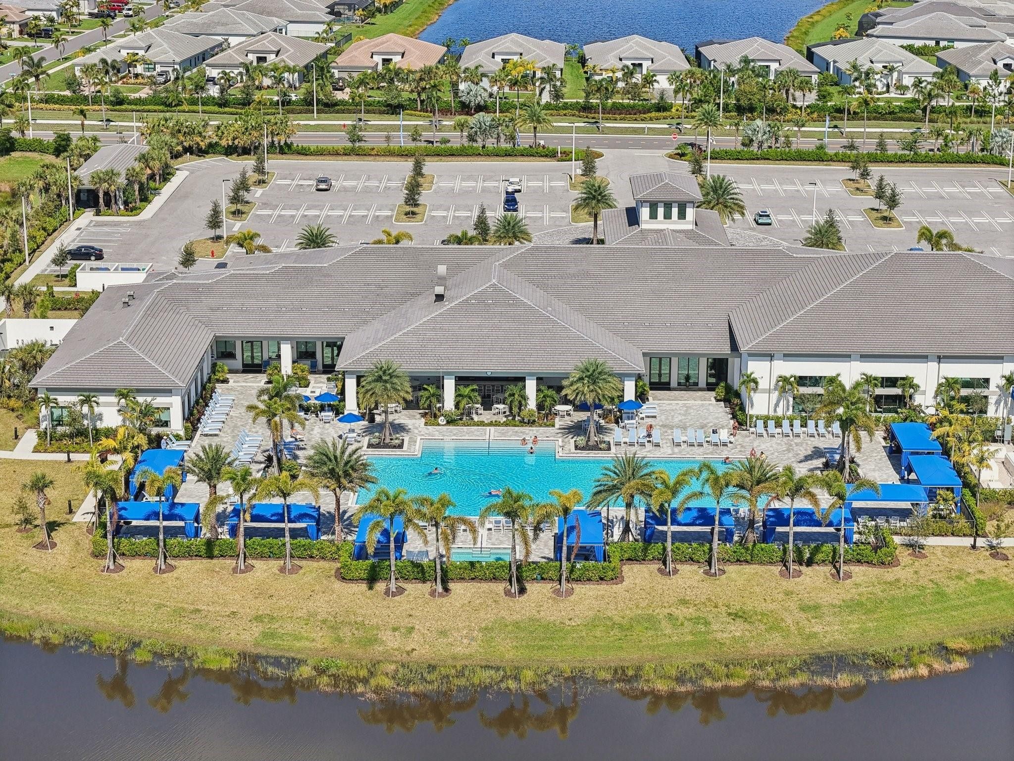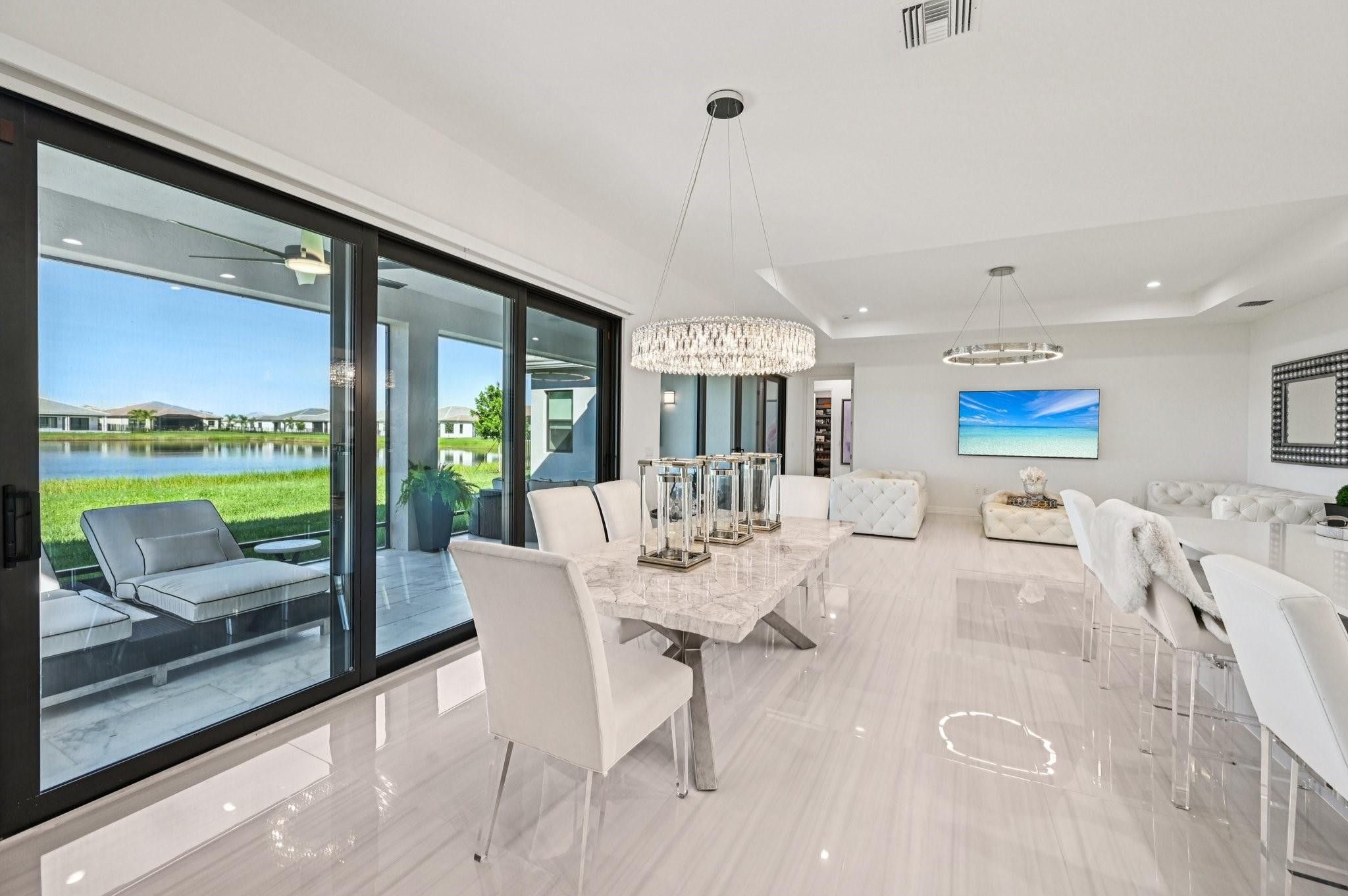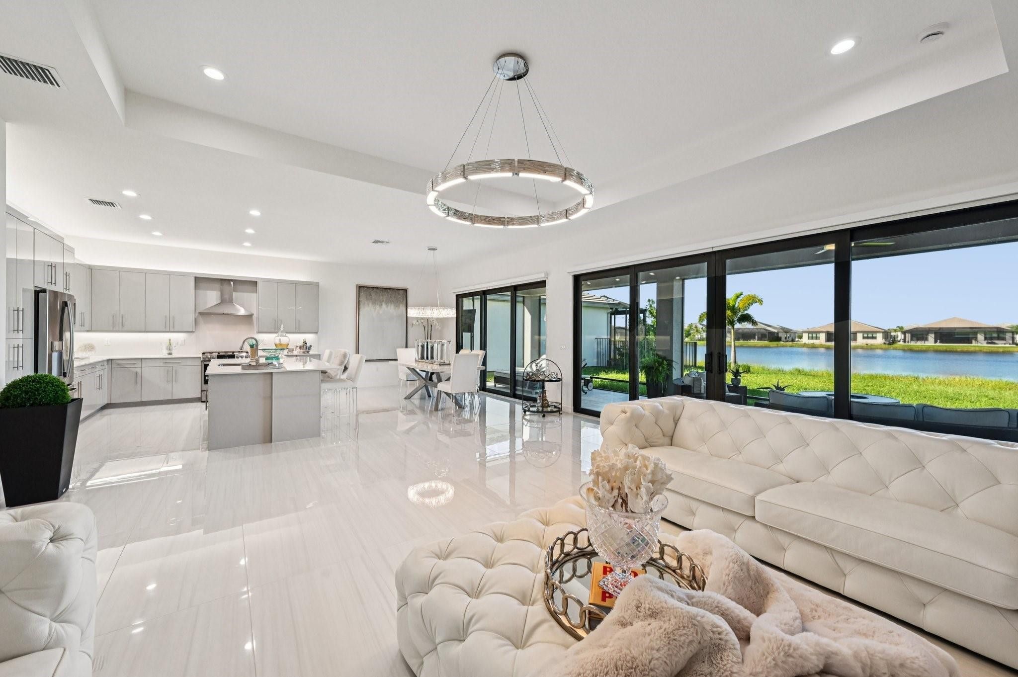 Upon entering this Prestigious Crown Collection custom water-facing Michele model there is a wide-open foyer leading to a great room surrounded by wall-to-wall sliding doors & a screened in lanai with leathered marble pavers creating an indoor-outdoor living feel. $165,000 of upgrades. Polished white with gray porcelain 48''x24'' tile flooring throughout. Designer lighting and high end finishes including premium appliances and custom window treatments. The gourmet kitchen displays the highest level glossy gray cabinetry with white quartz countertops and matching backsplash with under-and over-cabinet lighting. The primary suite offers professional custom closets. There is a fully customized laundry room. The spectacular Walk's 37,000 square foot clubhouse is within a five-minute walk.