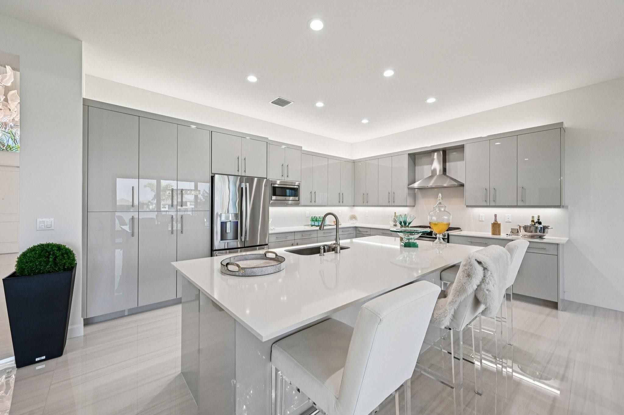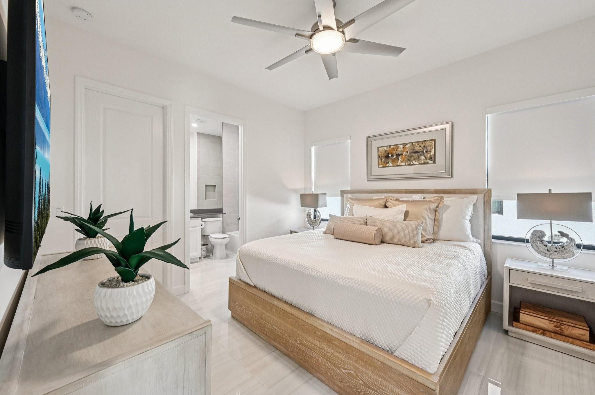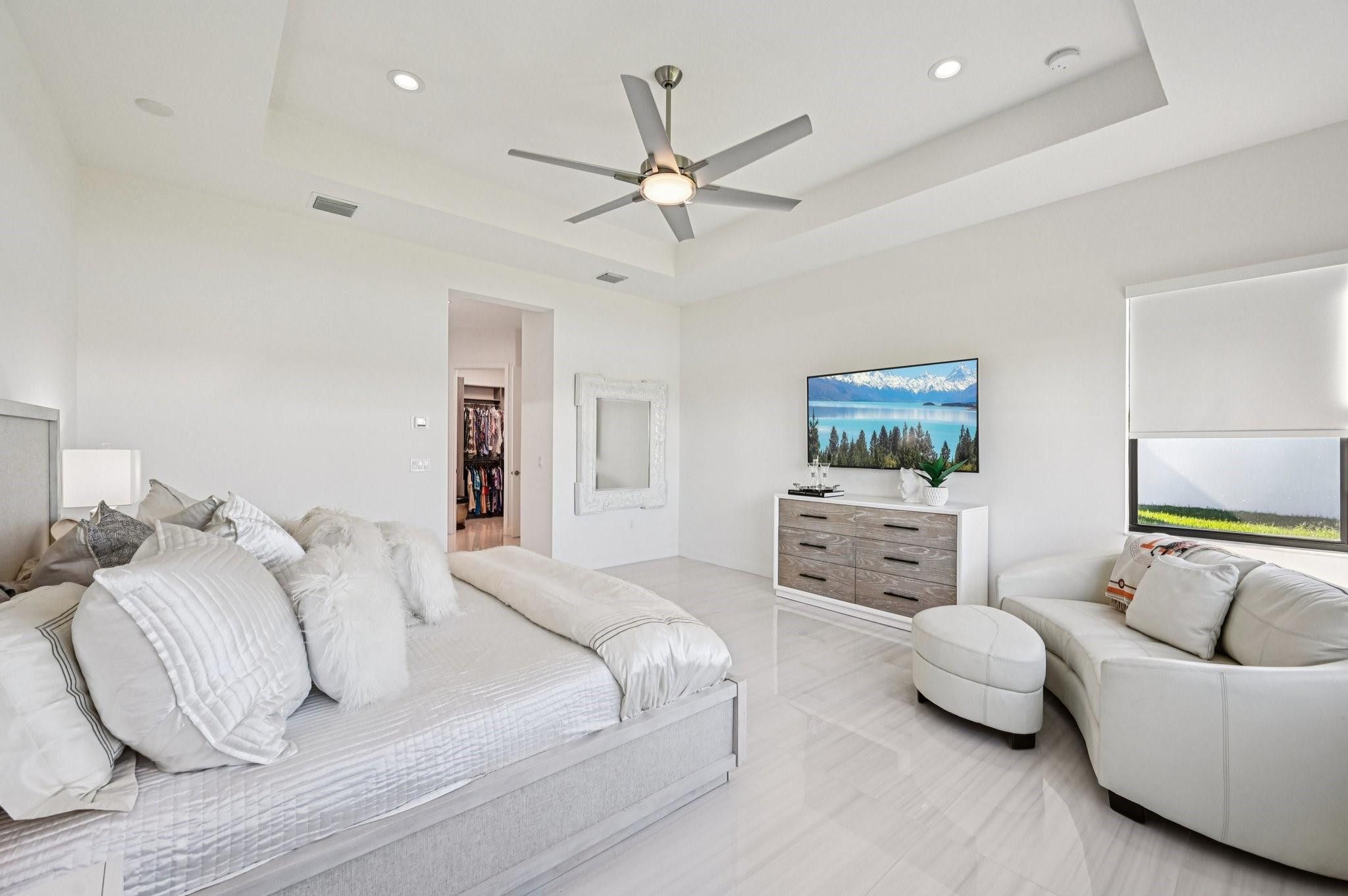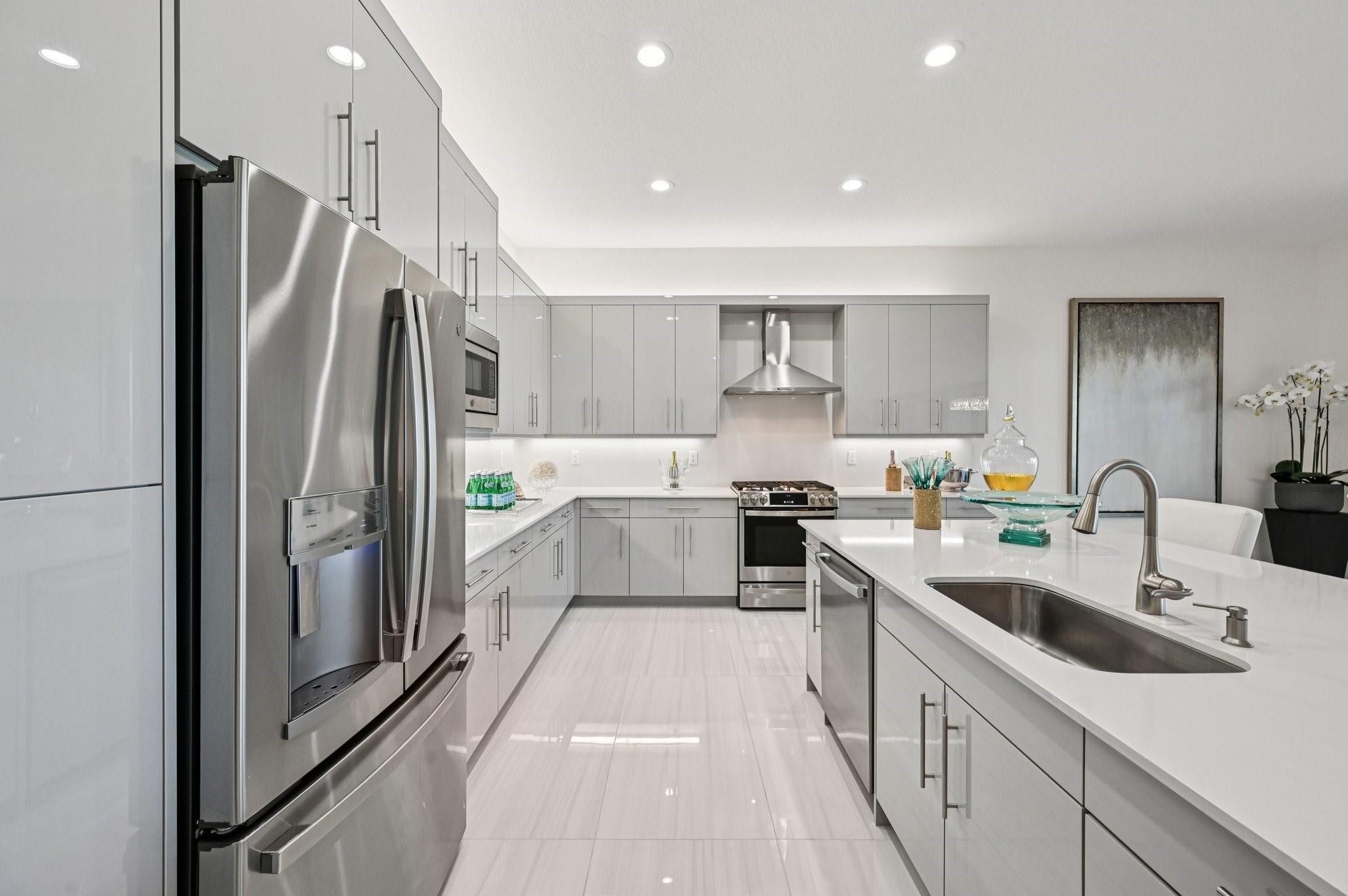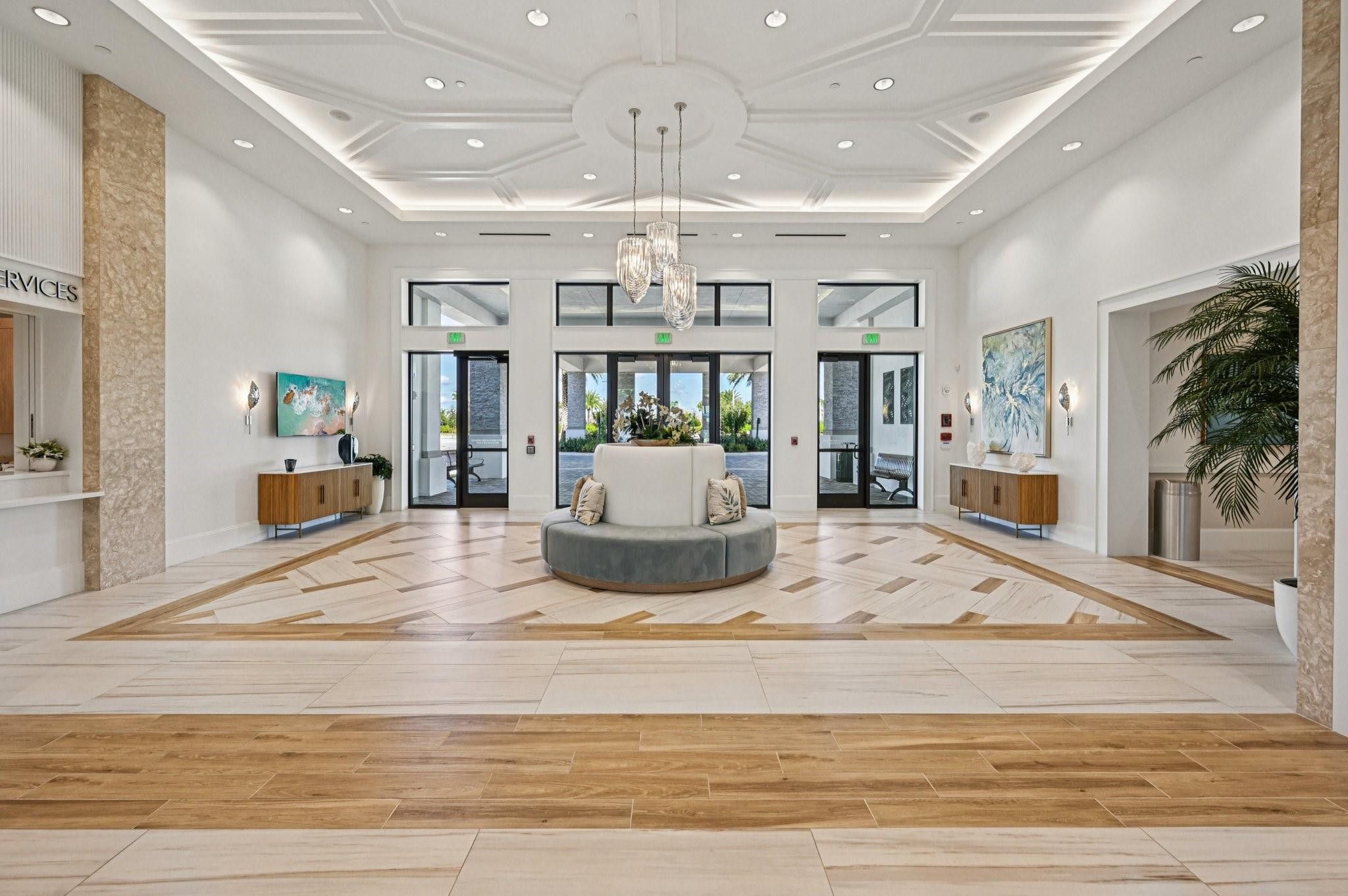 Upon entering this Prestigious Crown Collection custom water-facing Michele model there is a wide-open foyer leading to a great room surrounded by wall-to-wall sliding doors & a screened in lanai with leathered marble pavers creating an indoor-outdoor living feel. $165,000 of upgrades. Polished white with gray porcelain 48''x24'' tile flooring throughout. Designer lighting and high end finishes including premium appliances and custom window treatments. The gourmet kitchen displays the highest level glossy gray cabinetry with white quartz countertops and matching backsplash with under-and over-cabinet lighting. The primary suite offers professional custom closets. There is a fully customized laundry room. The spectacular Walk's 37,000 square foot clubhouse is within a five-minute walk.