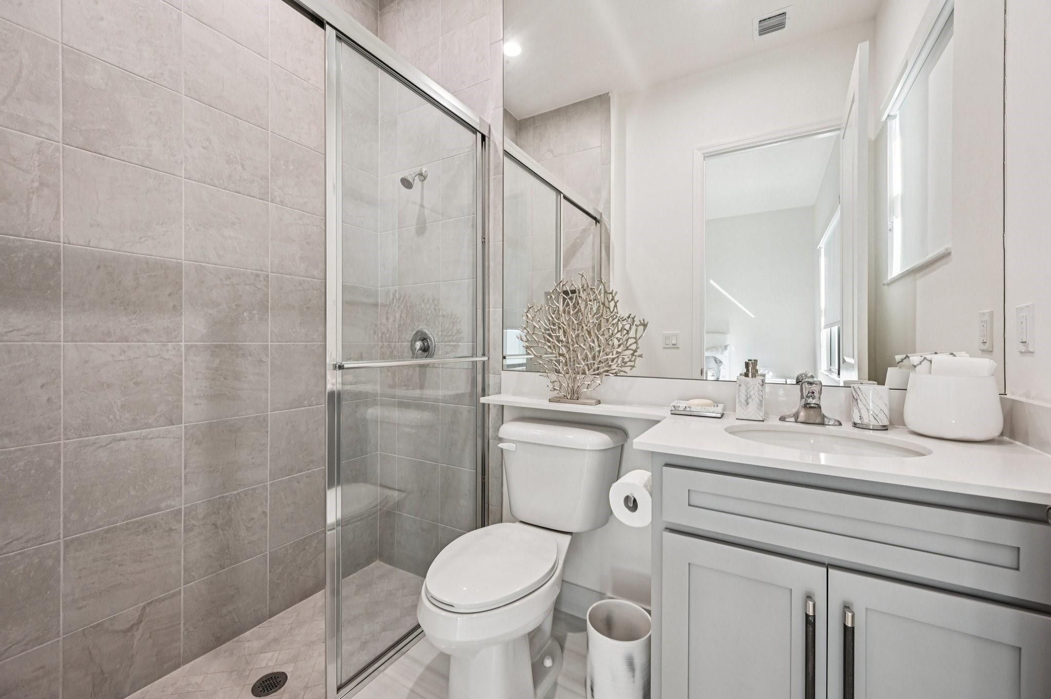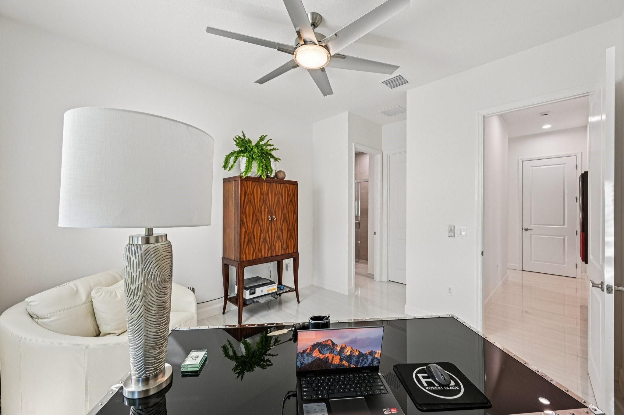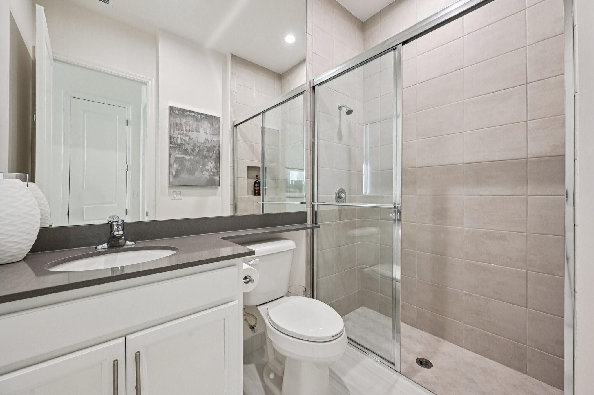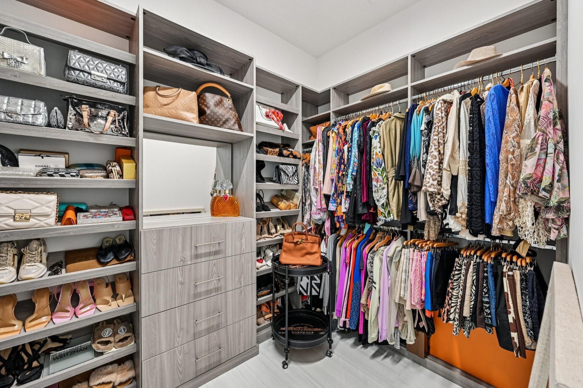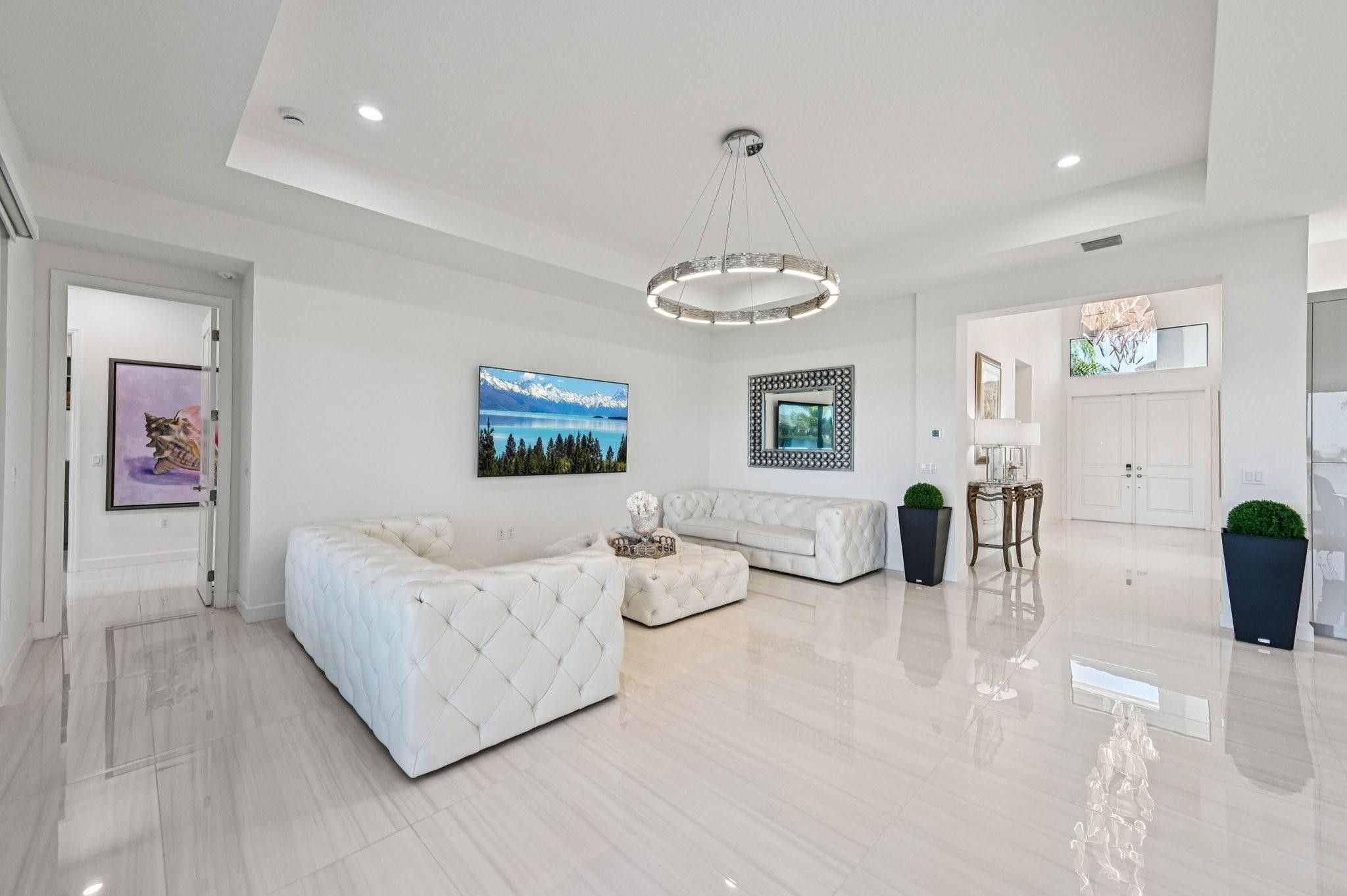 Upon entering this Prestigious Crown Collection custom water-facing Michele model there is a wide-open foyer leading to a great room surrounded by wall-to-wall sliding doors & a screened in lanai with leathered marble pavers creating an indoor-outdoor living feel. $165,000 of upgrades. Polished white with gray porcelain 48''x24'' tile flooring throughout. Designer lighting and high end finishes including premium appliances and custom window treatments. The gourmet kitchen displays the highest level glossy gray cabinetry with white quartz countertops and matching backsplash with under-and over-cabinet lighting. The primary suite offers professional custom closets. There is a fully customized laundry room. The spectacular Walk's 37,000 square foot clubhouse is within a five-minute walk.