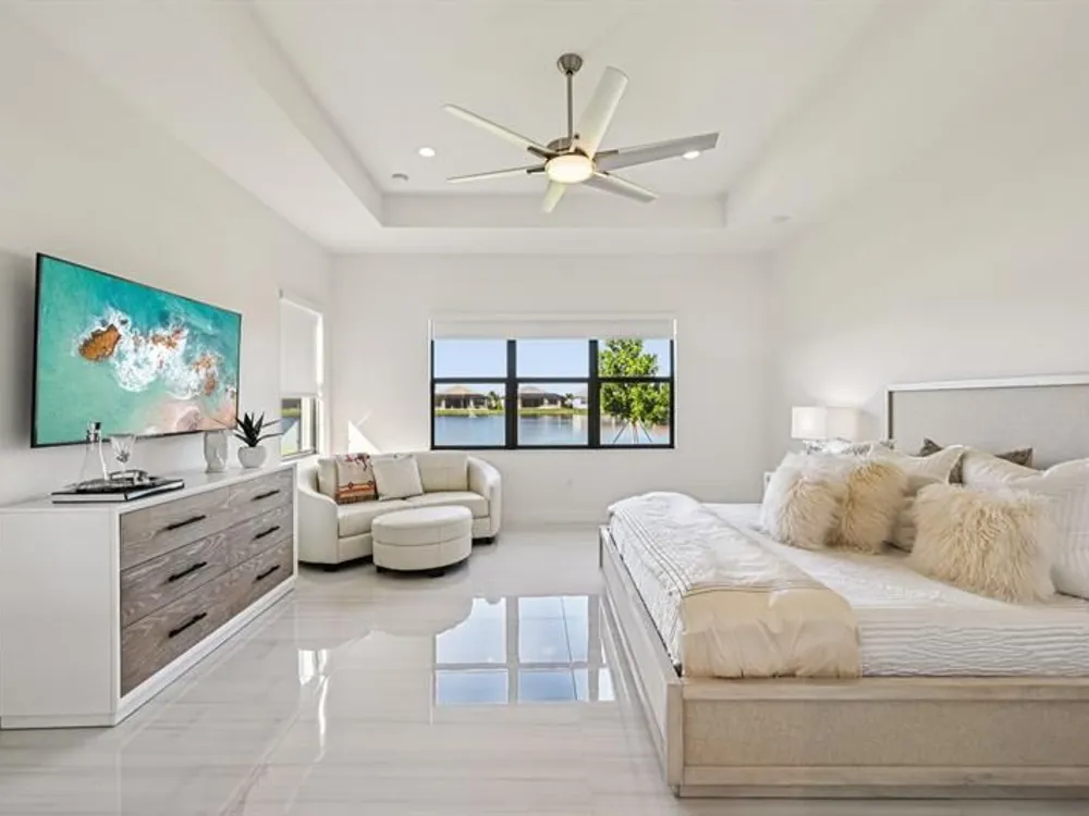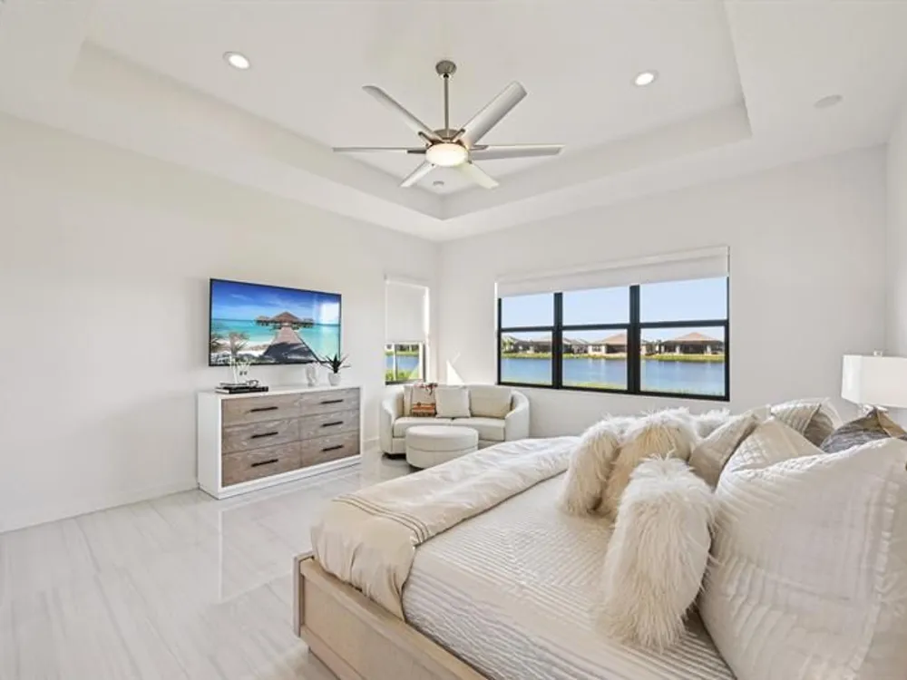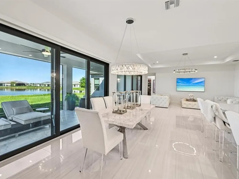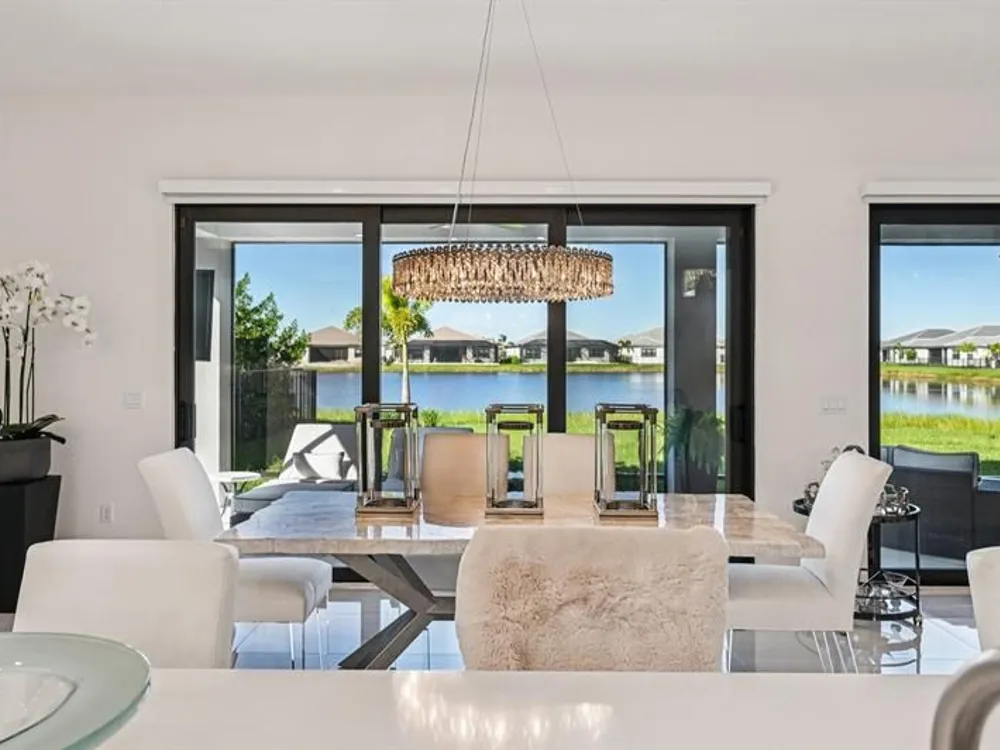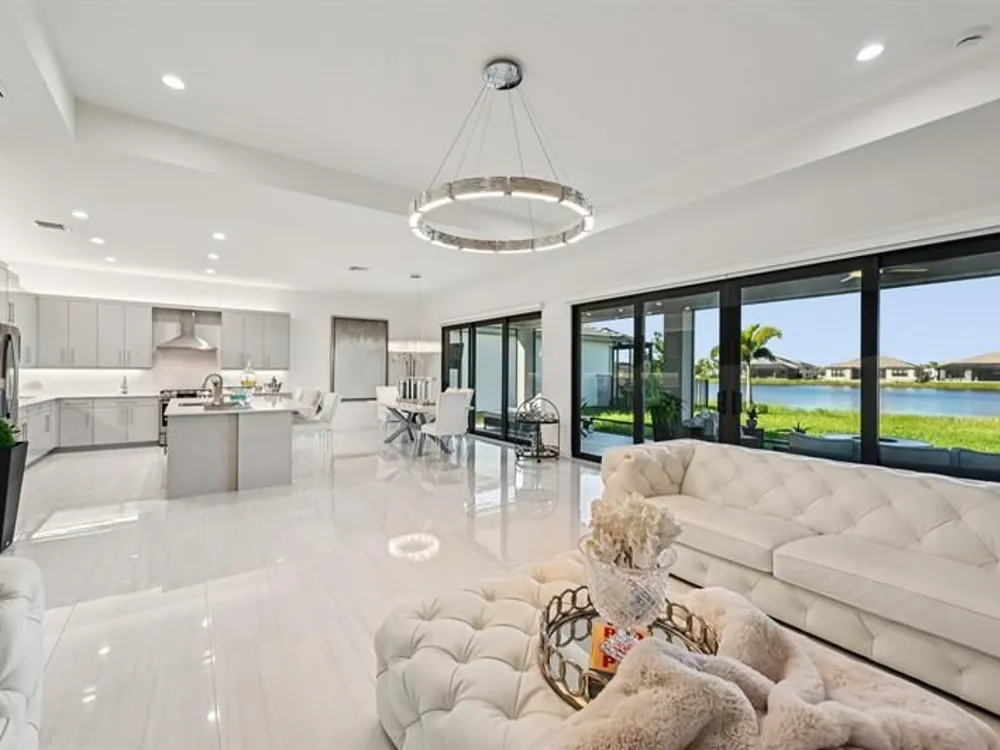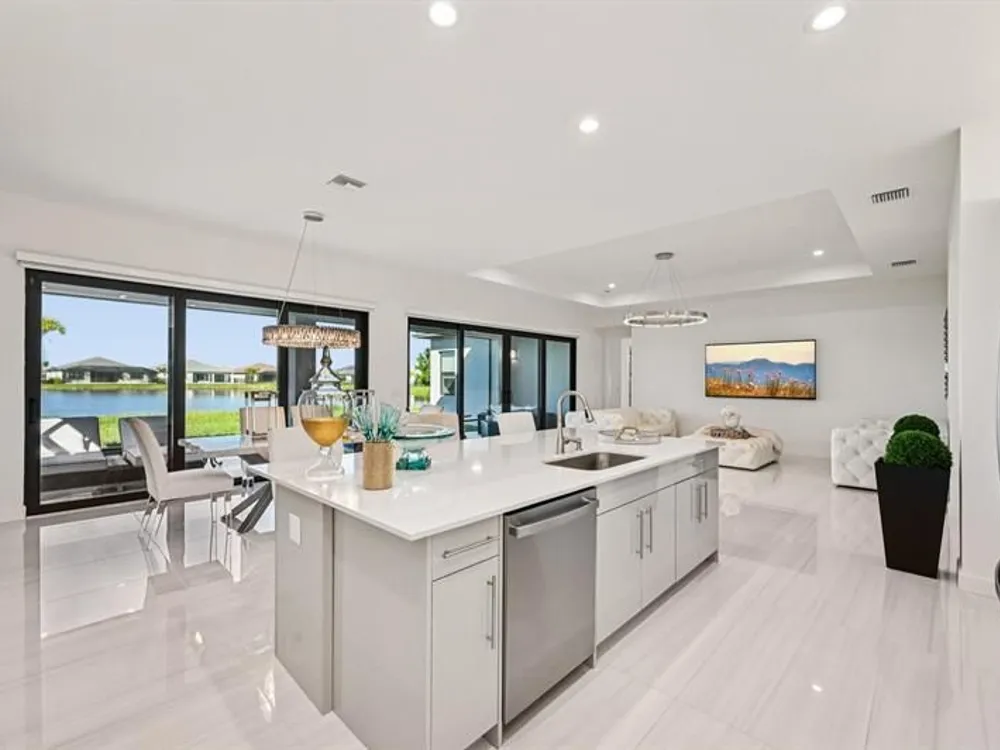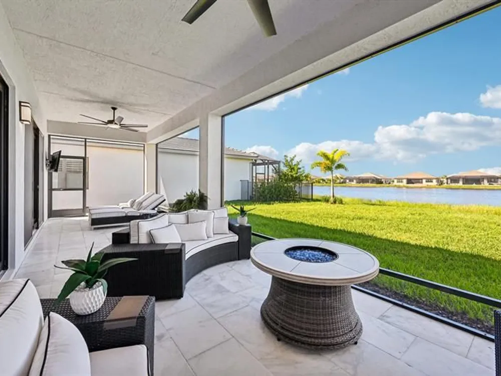 As you enter this pristine contemporary Michele model you sense the WOW factor with wide western exposure lake views and an open floor plan with luxurious polished white with gray undertones porcelain 48''x24'' tile flooring throughout. This home features luxury lighting and high end finishes including impact glass windows, GE Profile gas appliances, recessed LED lighting, state of the art window coverings and the kitchen displays the highest level glossy gray cabinetry with quartz countertops and matching backsplash, with under-and over-cabinet lighting. The primary suite offers professional custom shelving in all 3 closets. In addition there is a fully custom laundry room. The lanai floors are leathered marble. The Walk's clubhouse with restaurant & bar is within a five-minute walk.