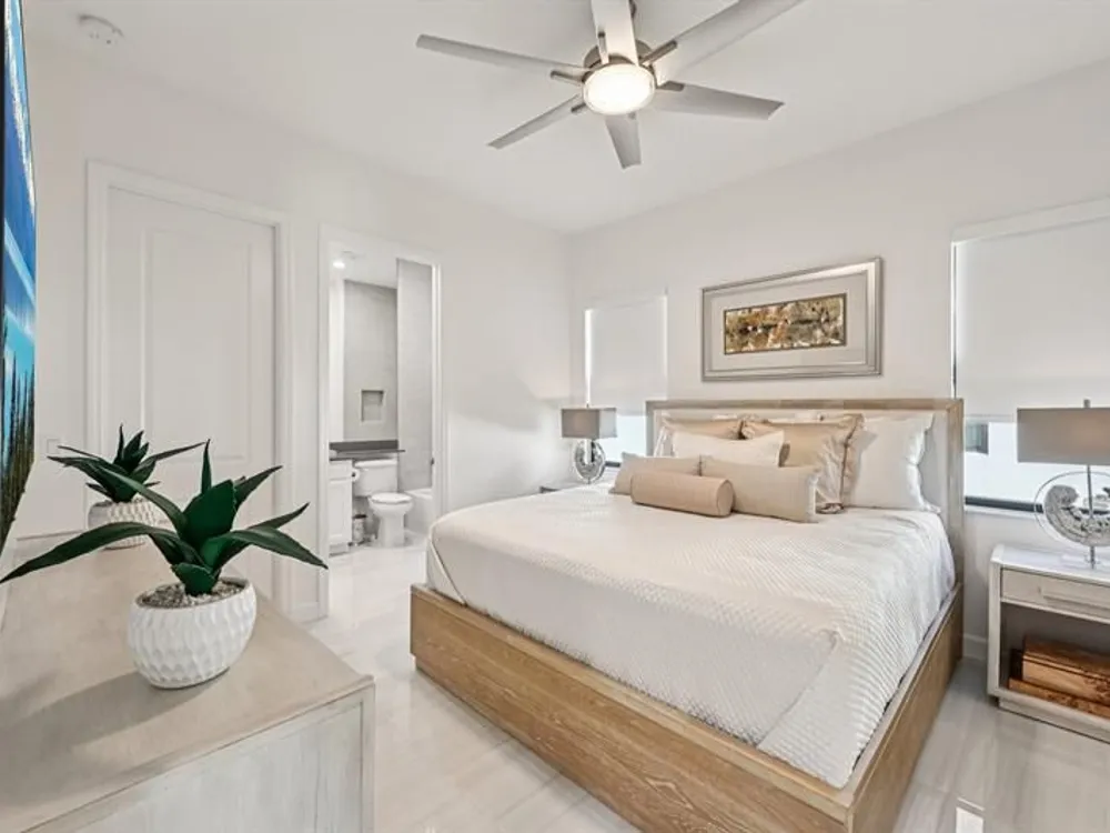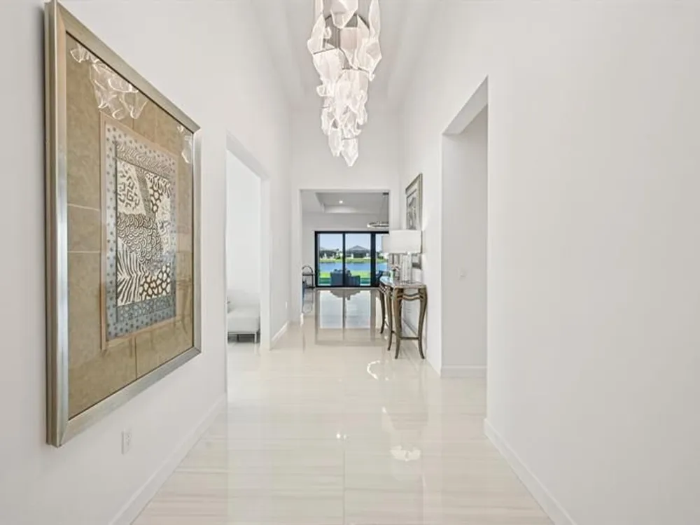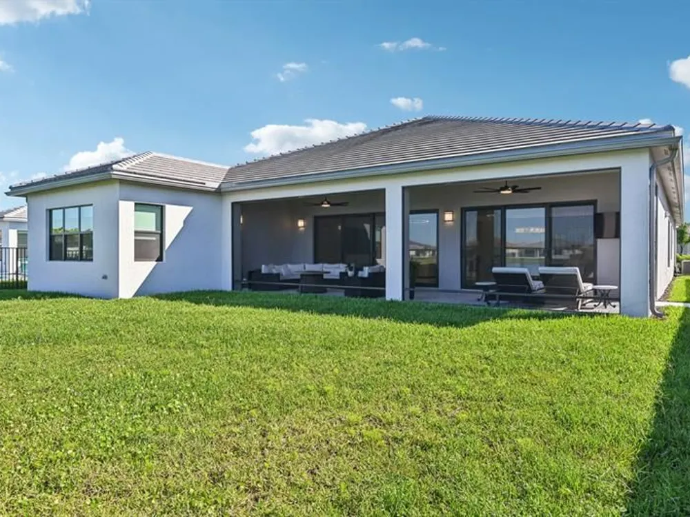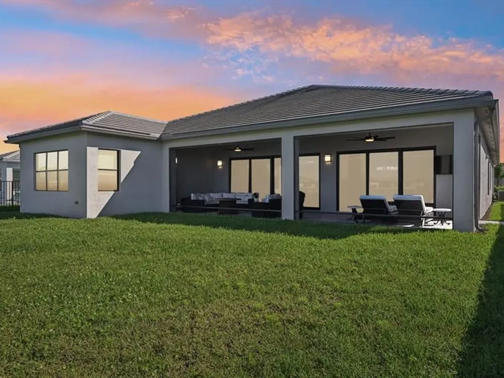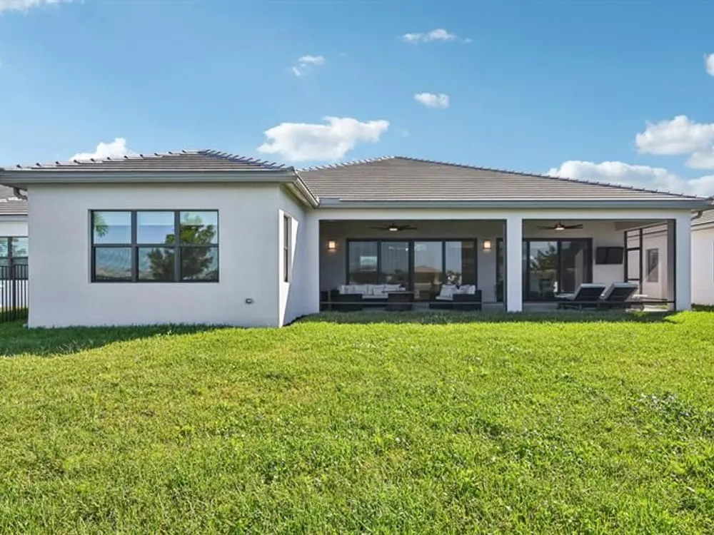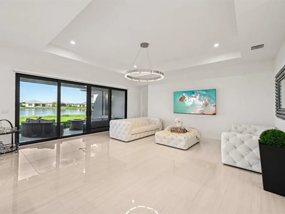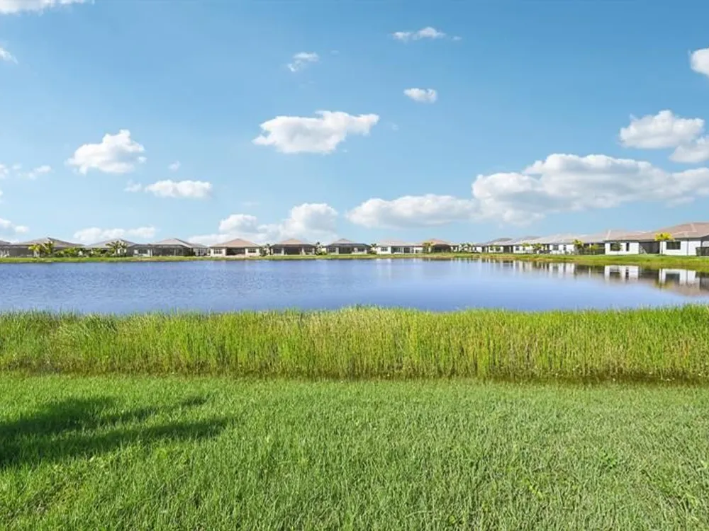 As you enter this pristine contemporary Michele model you sense the WOW factor with wide western exposure lake views and an open floor plan with luxurious polished white with gray undertones porcelain 48''x24'' tile flooring throughout. This home features luxury lighting and high end finishes including impact glass windows, GE Profile gas appliances, recessed LED lighting, state of the art window coverings and the kitchen displays the highest level glossy gray cabinetry with quartz countertops and matching backsplash, with under-and over-cabinet lighting. The primary suite offers professional custom shelving in all 3 closets. In addition there is a fully custom laundry room. The lanai floors are leathered marble. The Walk's clubhouse with restaurant & bar is within a five-minute walk.