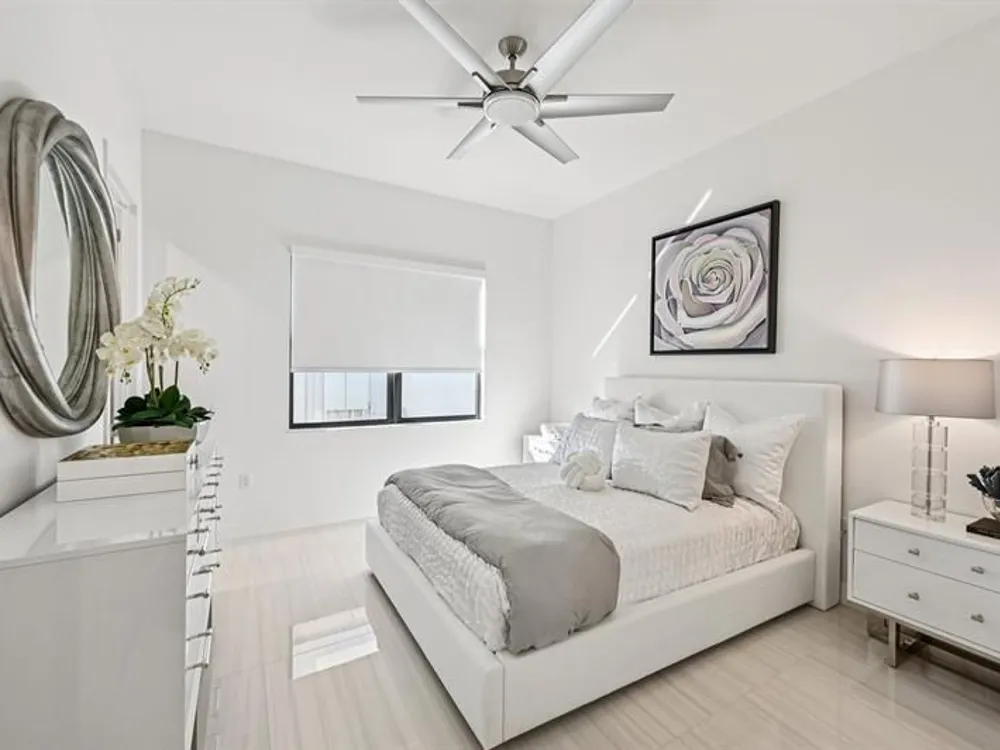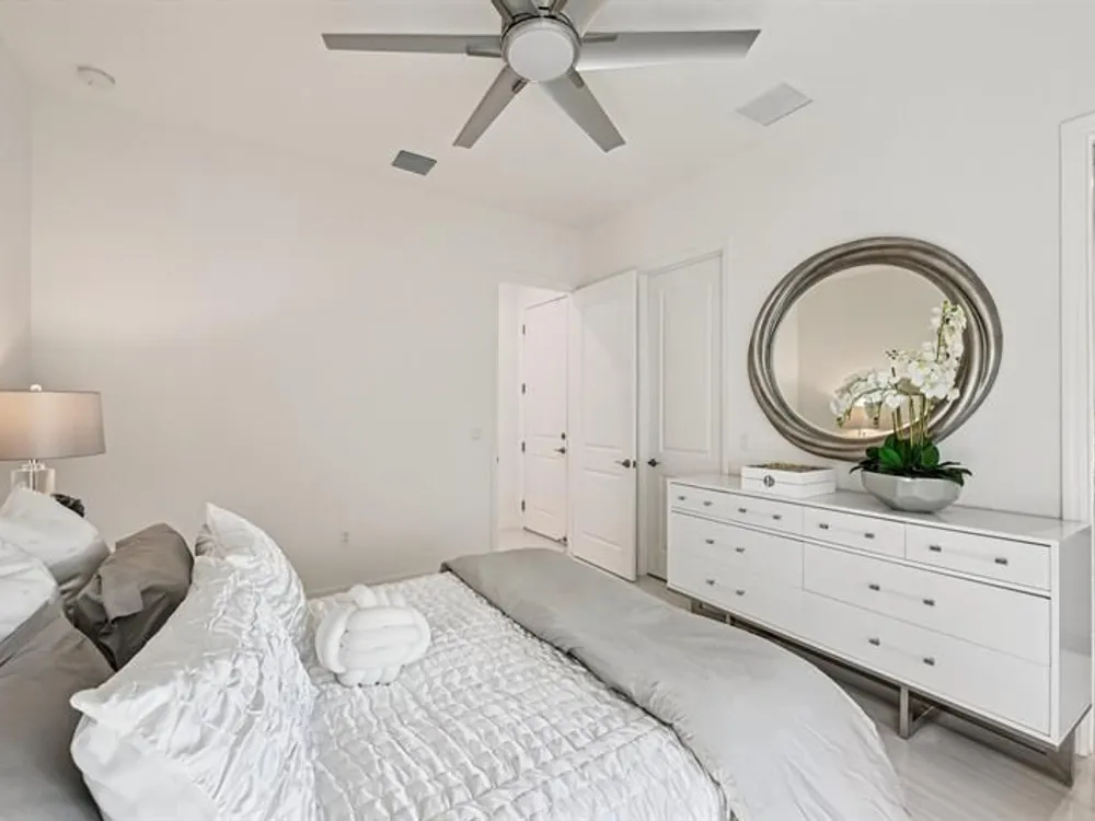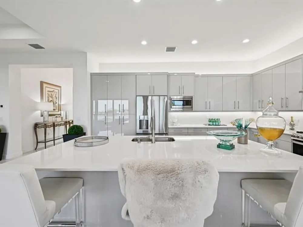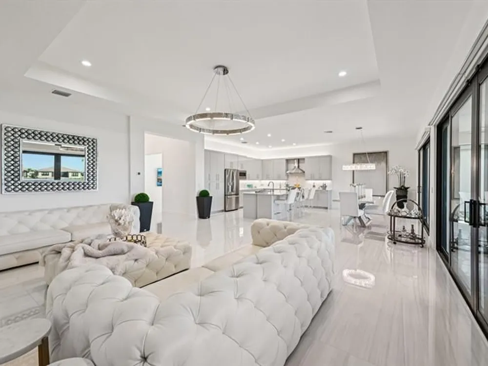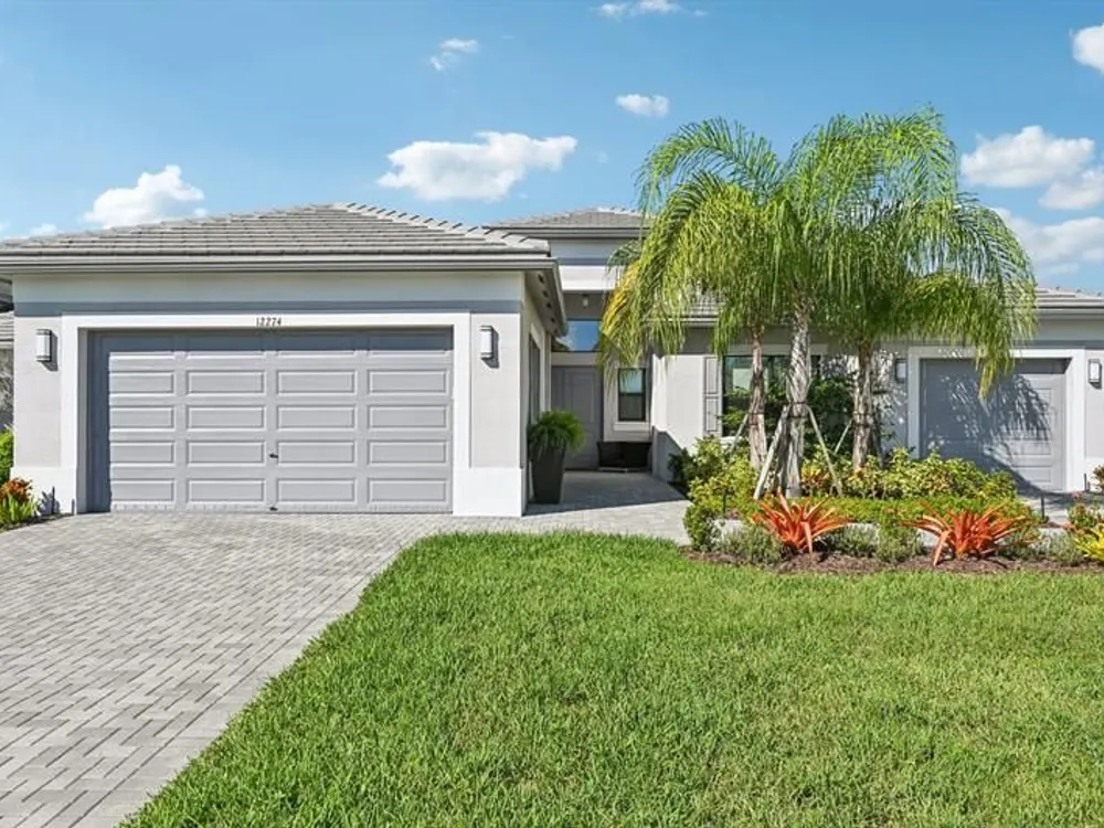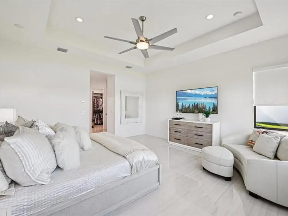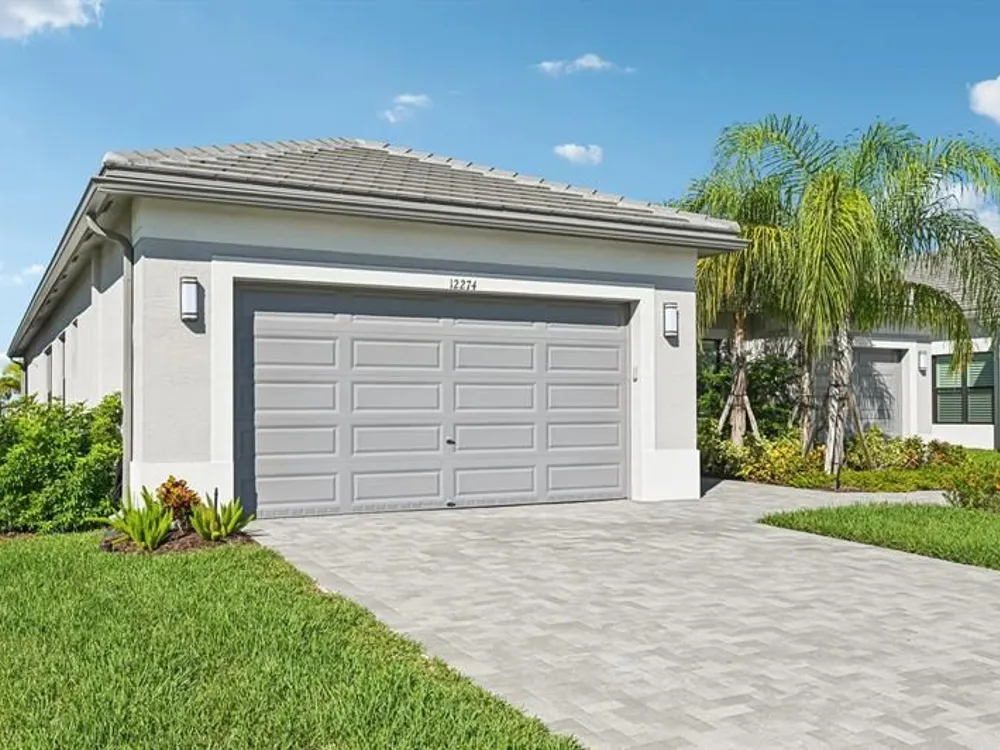 As you enter this pristine contemporary Michele model you sense the WOW factor with wide western exposure lake views and an open floor plan with luxurious polished white with gray undertones porcelain 48''x24'' tile flooring throughout. This home features luxury lighting and high end finishes including impact glass windows, GE Profile gas appliances, recessed LED lighting, state of the art window coverings and the kitchen displays the highest level glossy gray cabinetry with quartz countertops and matching backsplash, with under-and over-cabinet lighting. The primary suite offers professional custom shelving in all 3 closets. In addition there is a fully custom laundry room. The lanai floors are leathered marble. The Walk's clubhouse with restaurant & bar is within a five-minute walk.
