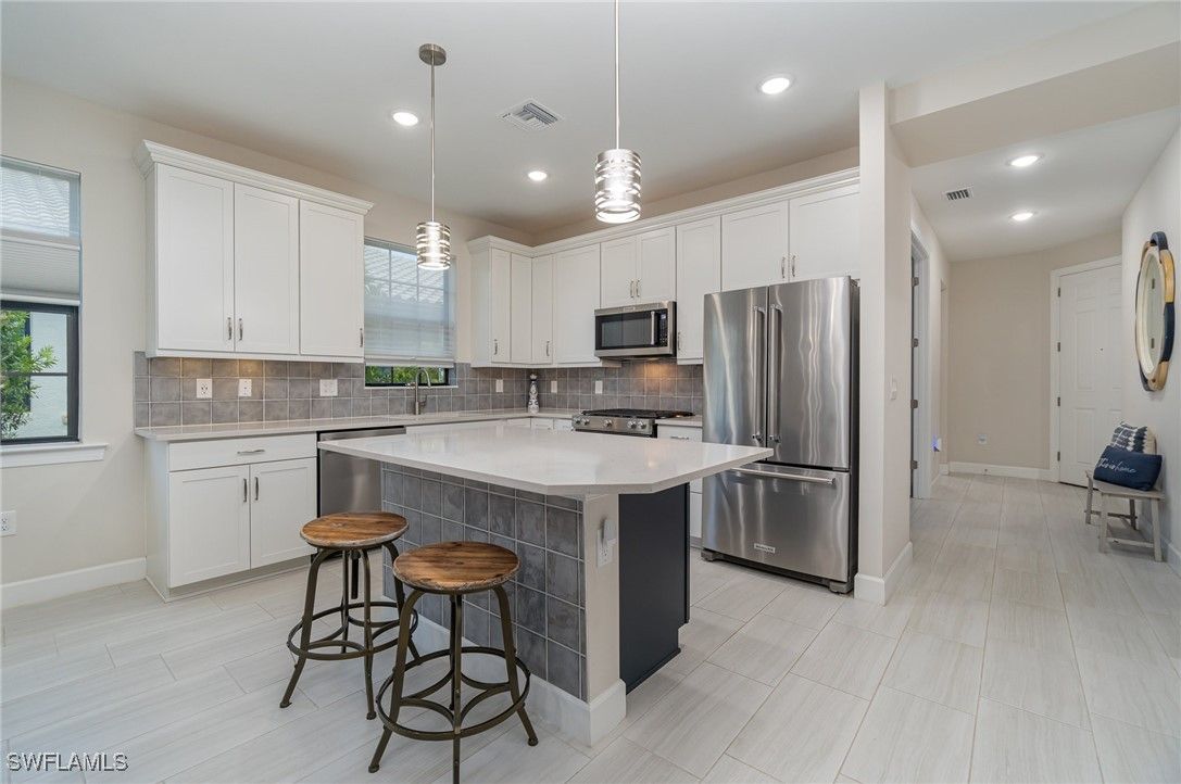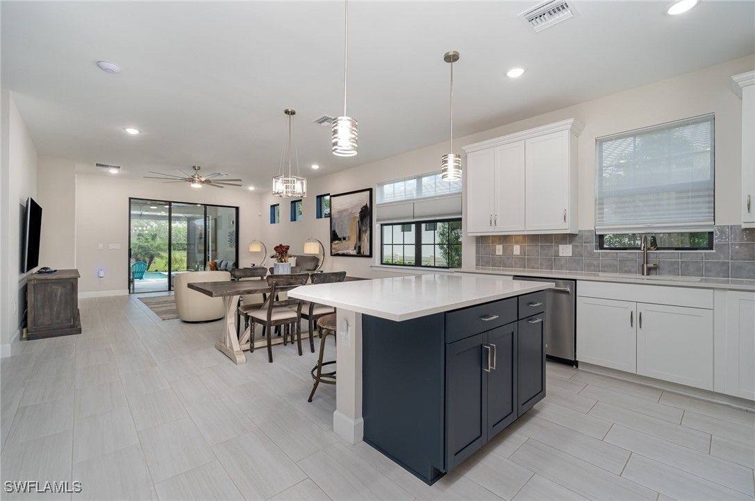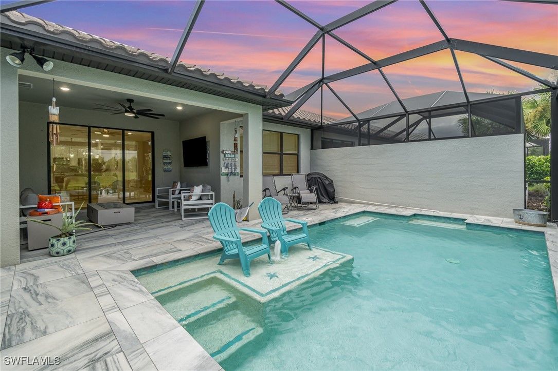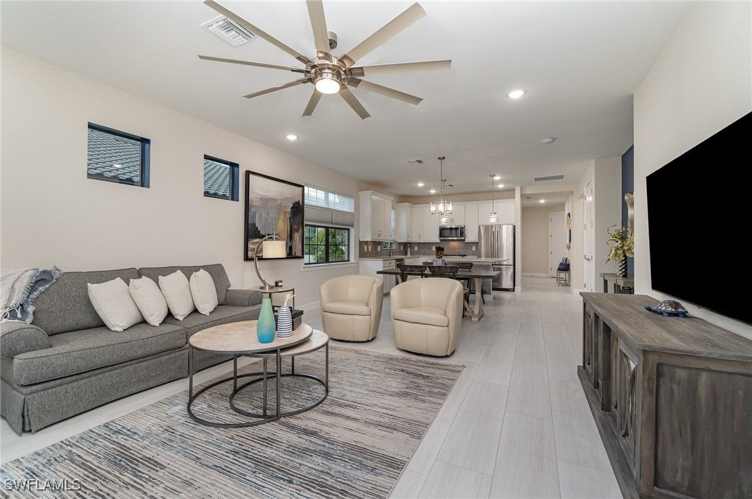 Stunning Custom Villa in Esplanade Lake Club – Luxury Living Awaits! Discover your dream home in the prestigious Esplanade Lake Club, where this pristine like-new 2-bedroom + den villa blends modern elegance with the ultimate Florida lifestyle. Unwind by your private, heated saltwater pool with a sun shelf and vibrant color-changing LED lights, surrounded by sleek porcelain pavers – perfect for soaking up the Florida Sunshine. Step inside to a brilliantly upgraded interior featuring porcelain tile flooring throughout, soaring 8-foot doorways, and recessed LED lighting that creates a warm, inviting ambiance. The gourmet kitchen boasts premium quartz countertops, high-end gas appliances, an upgraded refrigerator, and custom cabinetry. Every detail shines, from the 6-inch baseboards to the built-in bench at the garage entry. The spa-inspired bathrooms elevate luxury with floor-to-ceiling tile, upgraded faucets, and designer cabinetry. When you’re ready to explore, Esplanade Lake Club’s resort-style amenities await just a short stroll away. Savor lunch at the Cabana Bar, lounge by the sparkling lakefront pool or lake side beach. Enjoy the community’s first-class fitness center, tennis, and bocce courts, alongside extensive social offerings. This pristine villa shows like a model home, offering a seamless blend of sophistication and comfort. All this in a location second to none. Abundant high end shopping and dining are short 5-10 minute drive. SWFL international is 10-15 minutes away! Don’t miss your chance to live the Florida lifestyle – schedule a tour today!