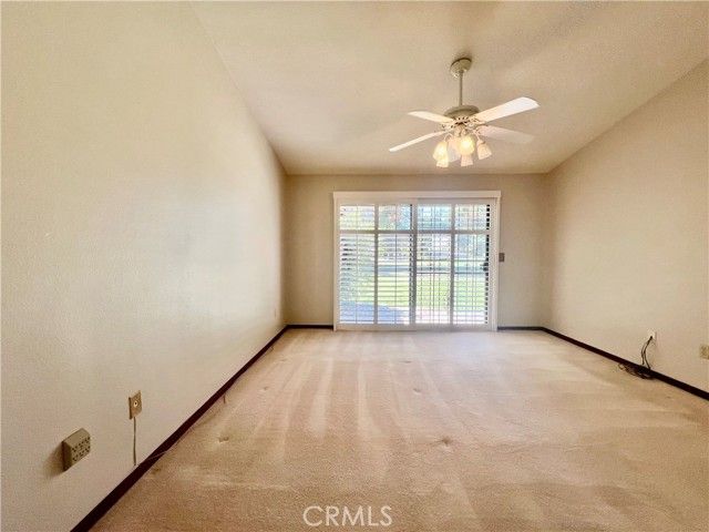 This stunning, move-in-ready home in the highly desirable 55+ Seven Hills Golf Resort showcases panoramic golf course views from nearly every room and offers easy access to the pool and spa, Diamond Valley Lake, Temecula wine country, Palm Springs, snow-covered mountains, and the Idyllwild music scene—with San Diego, Los Angeles, and the Pacific Ocean just down the freeway. Featuring approximately 1,568 sq ft of living space, the home boasts beautiful hardwood flooring in the entry, hallways, and guest bathroom, freshly painted interiors with acoustic ceilings removed, three bedrooms, two bathrooms, and an oversized two-car garage with laundry area and French doors that open to the exterior—ideal for an office setup. The concrete driveway accommodates up to four vehicles, while the spacious living room offers cathedral ceilings and a gas log-burning fireplace. The kitchen is equipped with ample cabinetry, upgraded quartz countertops, gas cooktop, built-in oven and microwave, dishwasher, garbage disposal, and refrigerator, with corner windows above the sink framing serene golf course views. A formal dining room with lighted ceiling fan, sliding glass doors, and custom wood shutters opens to a covered back patio perfect for entertaining. The master suite includes a lighted ceiling fan, sliding glass doors with custom wood shutters, mirrored wardrobe closet doors, and a master bath with tile countertops, dual vanity sinks, and a step-in shower stall with handicap grab bar. Additional bedrooms include a guest room with wardrobe closet and ceiling fan, and a third bedroom with lighted ceiling fan and golf course views ideal as a den or office. The guest bathroom features a shower/tub combo, tile vanity, and hardwood flooring. With LOW TAXES and HOA FEES of approximately $330/month covering water, trash, exterior landscaping, pool, and spa, and close proximity to shopping, dining, medical facilities, and hospitals, this entertainer’s dream home offers the perfect opportunity to retire in style.