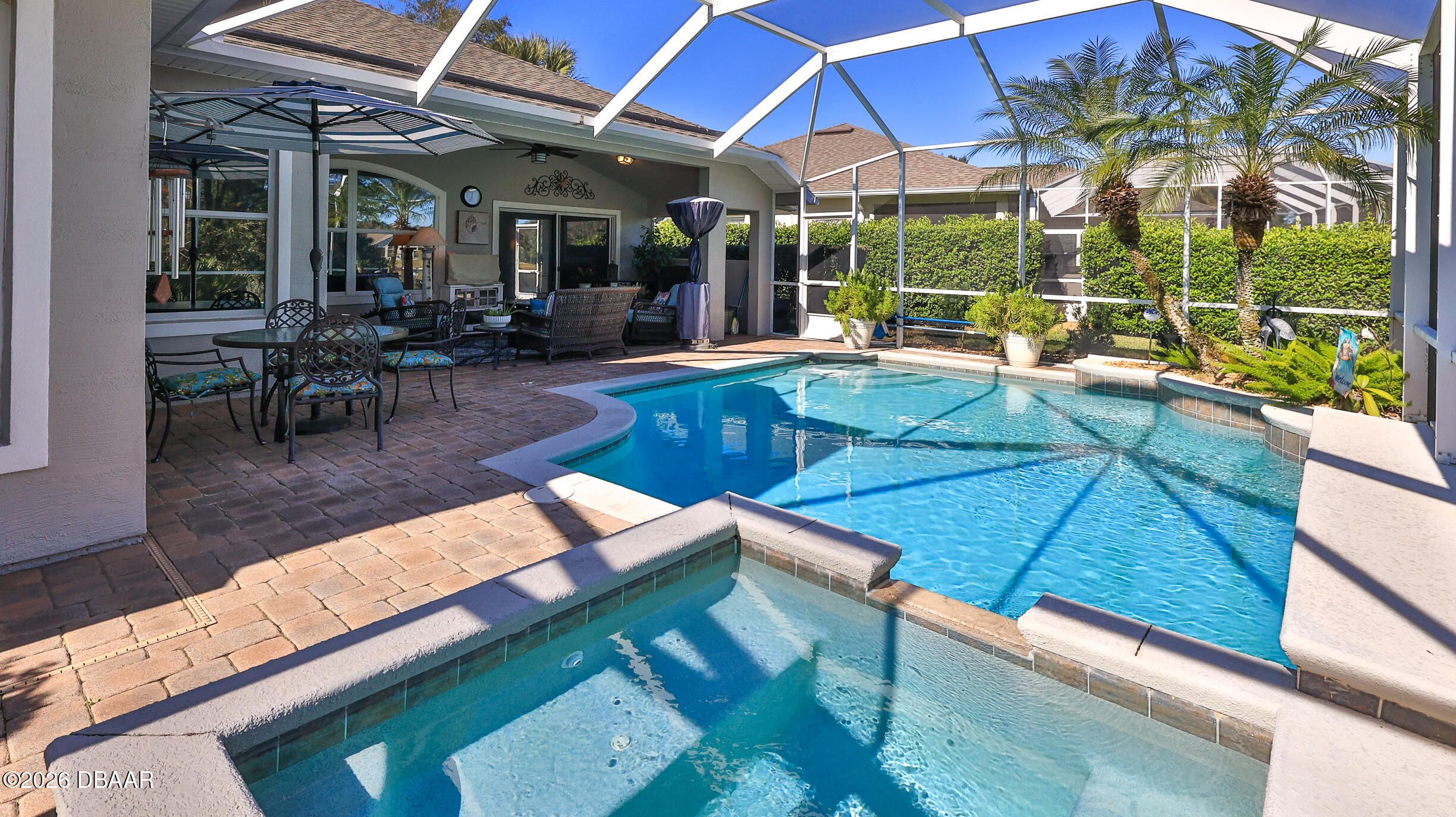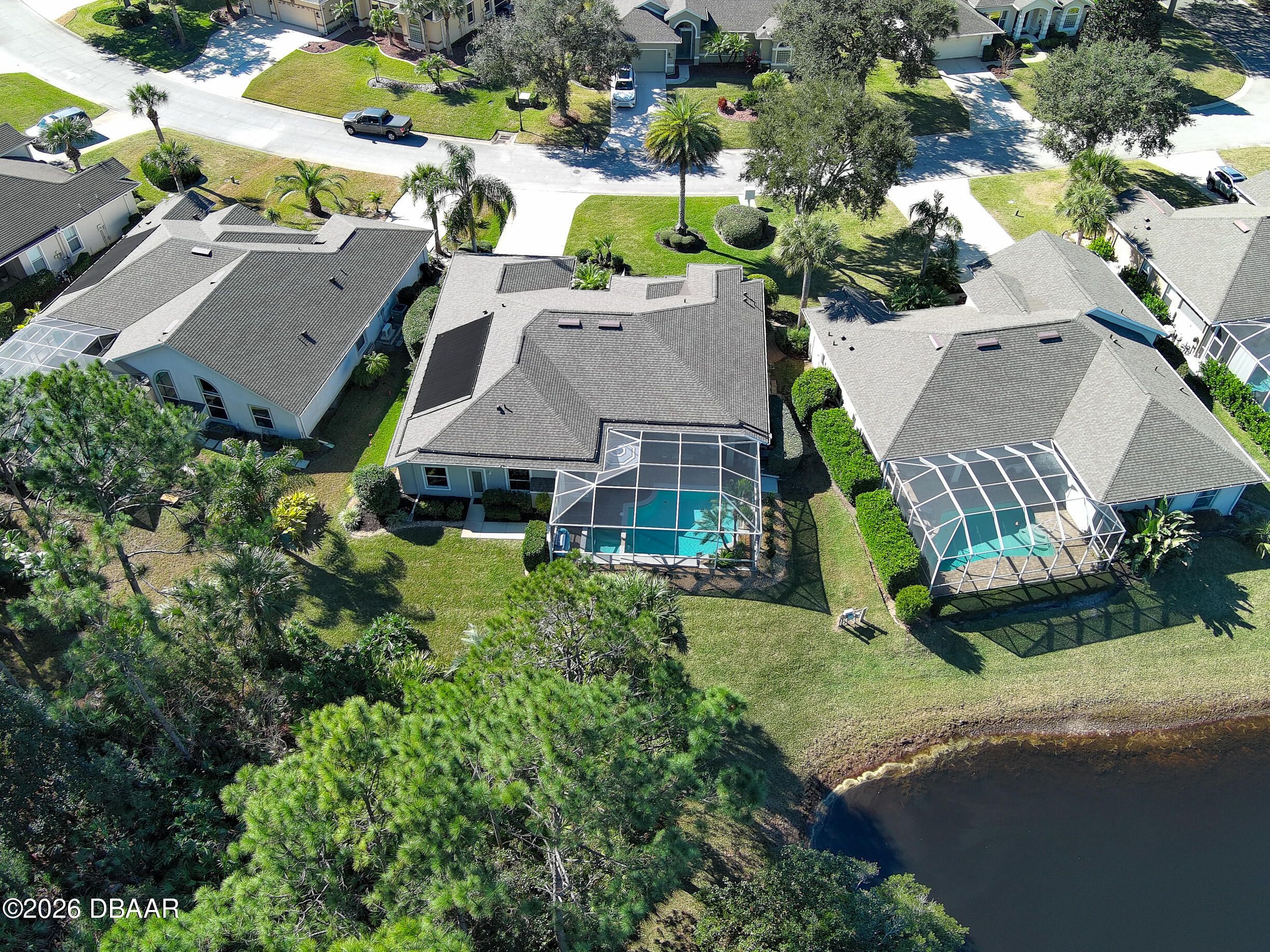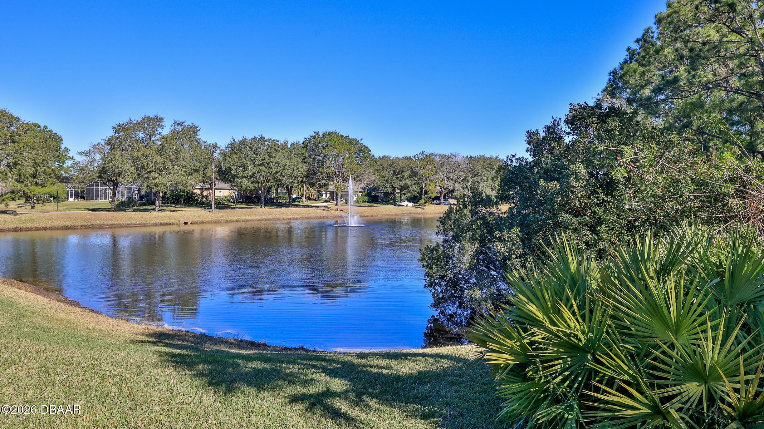 Warm and inviting 4 BR pool home with lake and fountain view. The minute you step in, you feel at home. The main living areas feature tile floors, 10-ft ceilings, and large windows with views of the pool/lake. The DR is open to the LR, creating an excellent space for entertaining. The kitchen boasts new appliances, a breakfast bar, and granite counters. Windows surround a breakfast nook for a bright, sunny space, and an etched door leads to the lanai and pool area. The FR features a lovely gas fireplace and large etched windows for tons of natural light. Upgrades include professional window treatments and shutters, new ceiling fans and light fixtures.The paver lanai features an under-roofline area, ideal for relaxing and enjoying the views, rain or shine. The MBR features cathedral ceiling, laminated floors and sliders to lanai. The MBA has dbl vanities, tub and separate updated shower, and 2 walk-in closets. Split floor plan features 3 additional BRs off kitchen area. See More.. The 4th bedroom is used as an office with built-in wood desk and cabinetry and laminate flooring. A full bathroom with access to lanai/pool area is located next to guest rooms. Two guest bedrooms feature new carpet flooring. The laundry room leads to the two-car garage. Professionally landscaped including attractive outdoor lighting. Paver walkways lead to front entryway with cozy pavered porch and multi-paneled front door. New roof in 2022. Exterior painted in 2021. Pool and spa resurfaced in 2021. All pavers sealed in 2024. While membership is optional, Plantation Bay features 45 holes of championship golf, a fabulous new clubhouse opened late 2023 with pro shop, restaurants, indoor and outdoor seating. The Wellness Center features fitness facility with two pools, lighted tennis and pickleball courts, bocce ball, fire pit, and cabana grill. Club has a number of membership options available.