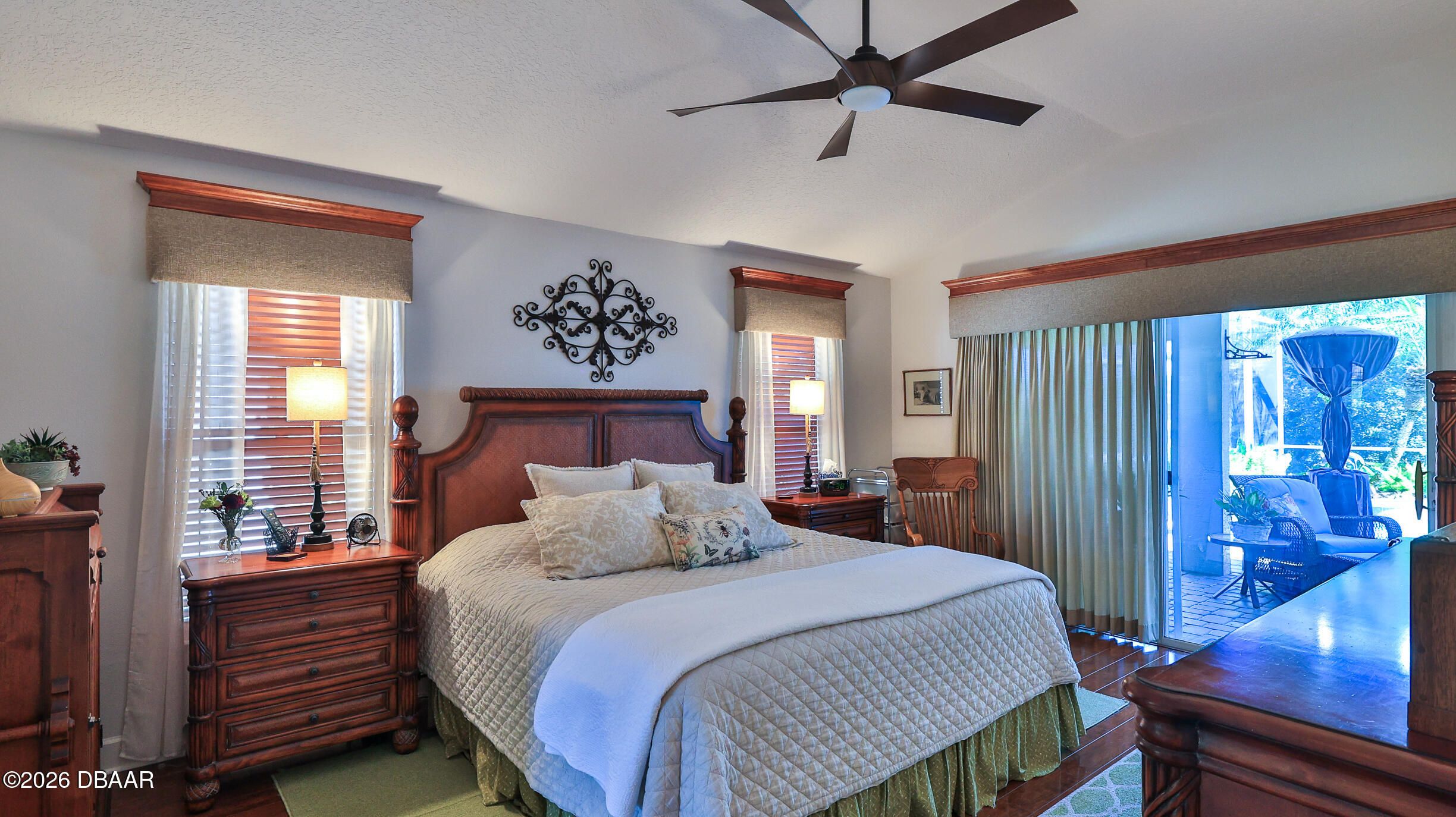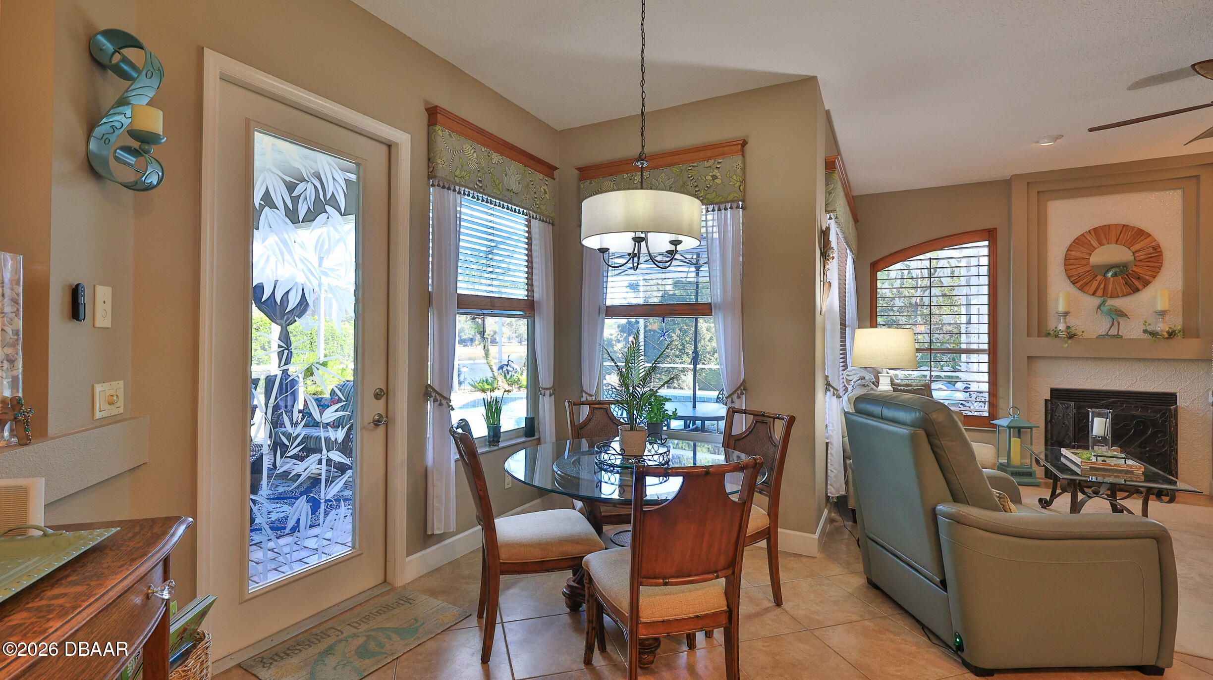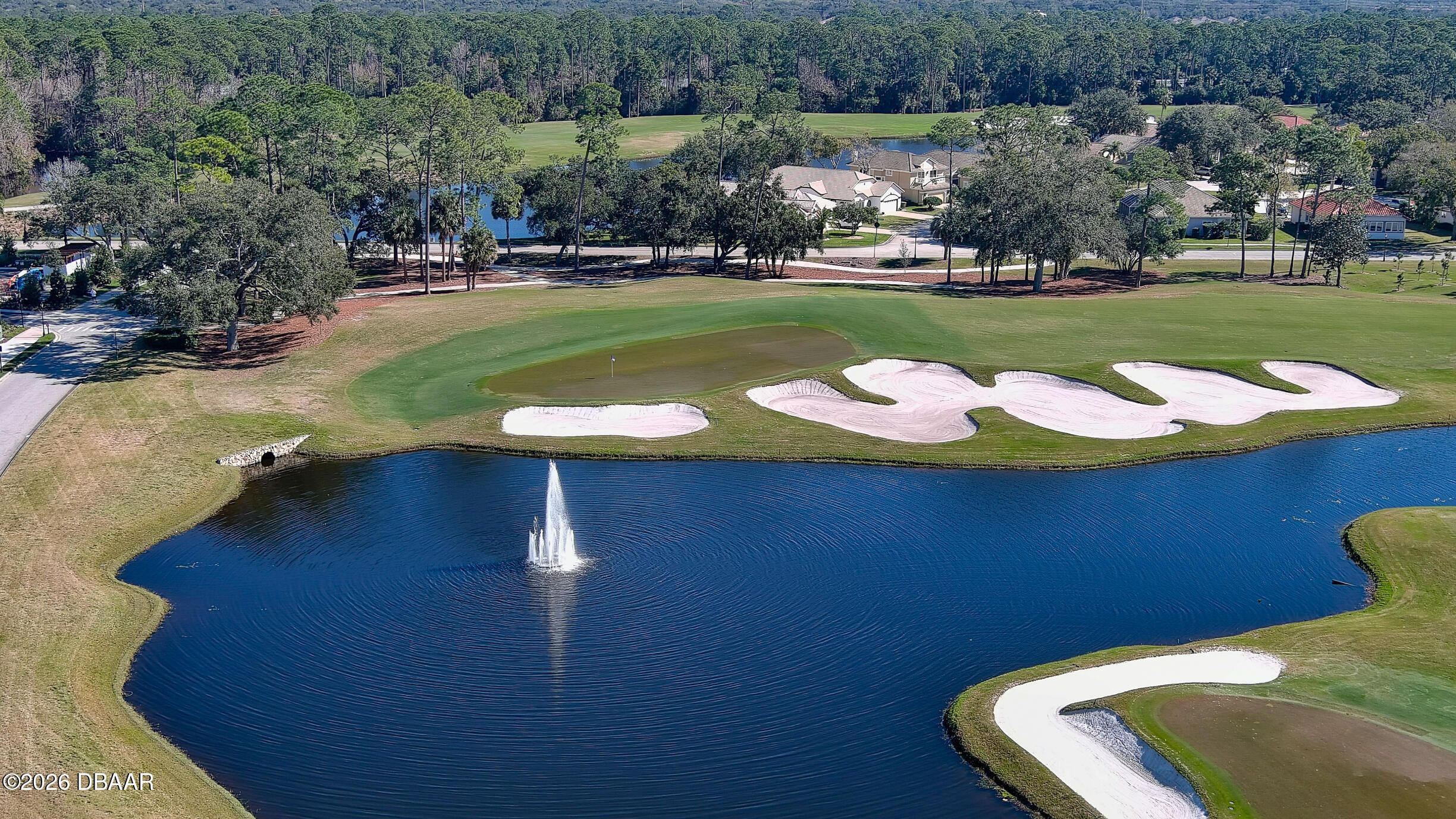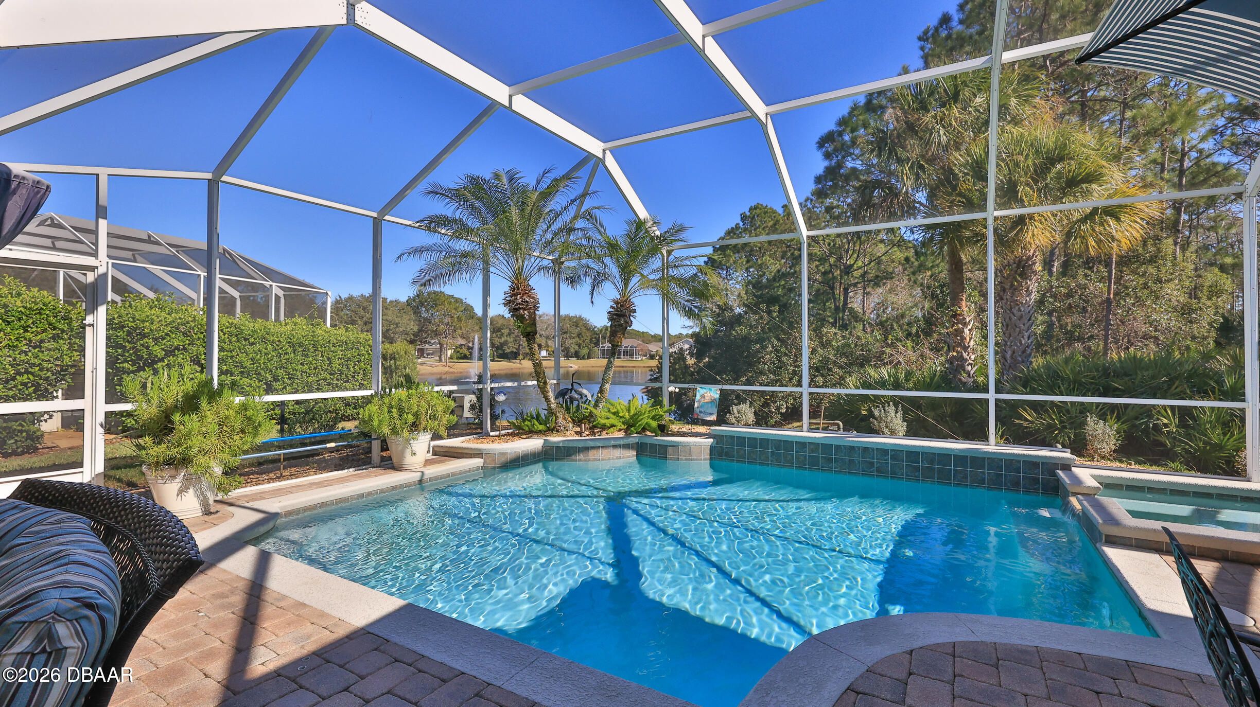 Warm and inviting 4 BR pool home with lake and fountain view. The minute you step in, you feel at home. The main living areas feature tile floors, 10-ft ceilings, and large windows with views of the pool/lake. The DR is open to the LR, creating an excellent space for entertaining. The kitchen boasts new appliances, a breakfast bar, and granite counters. Windows surround a breakfast nook for a bright, sunny space, and an etched door leads to the lanai and pool area. The FR features a lovely gas fireplace and large etched windows for tons of natural light. Upgrades include professional window treatments and shutters, new ceiling fans and light fixtures.The paver lanai features an under-roofline area, ideal for relaxing and enjoying the views, rain or shine. The MBR features cathedral ceiling, laminated floors and sliders to lanai. The MBA has dbl vanities, tub and separate updated shower, and 2 walk-in closets. Split floor plan features 3 additional BRs off kitchen area. See More.. The 4th bedroom is used as an office with built-in wood desk and cabinetry and laminate flooring. A full bathroom with access to lanai/pool area is located next to guest rooms. Two guest bedrooms feature new carpet flooring. The laundry room leads to the two-car garage. Professionally landscaped including attractive outdoor lighting. Paver walkways lead to front entryway with cozy pavered porch and multi-paneled front door. New roof in 2022. Exterior painted in 2021. Pool and spa resurfaced in 2021. All pavers sealed in 2024. While membership is optional, Plantation Bay features 45 holes of championship golf, a fabulous new clubhouse opened late 2023 with pro shop, restaurants, indoor and outdoor seating. The Wellness Center features fitness facility with two pools, lighted tennis and pickleball courts, bocce ball, fire pit, and cabana grill. Club has a number of membership options available.