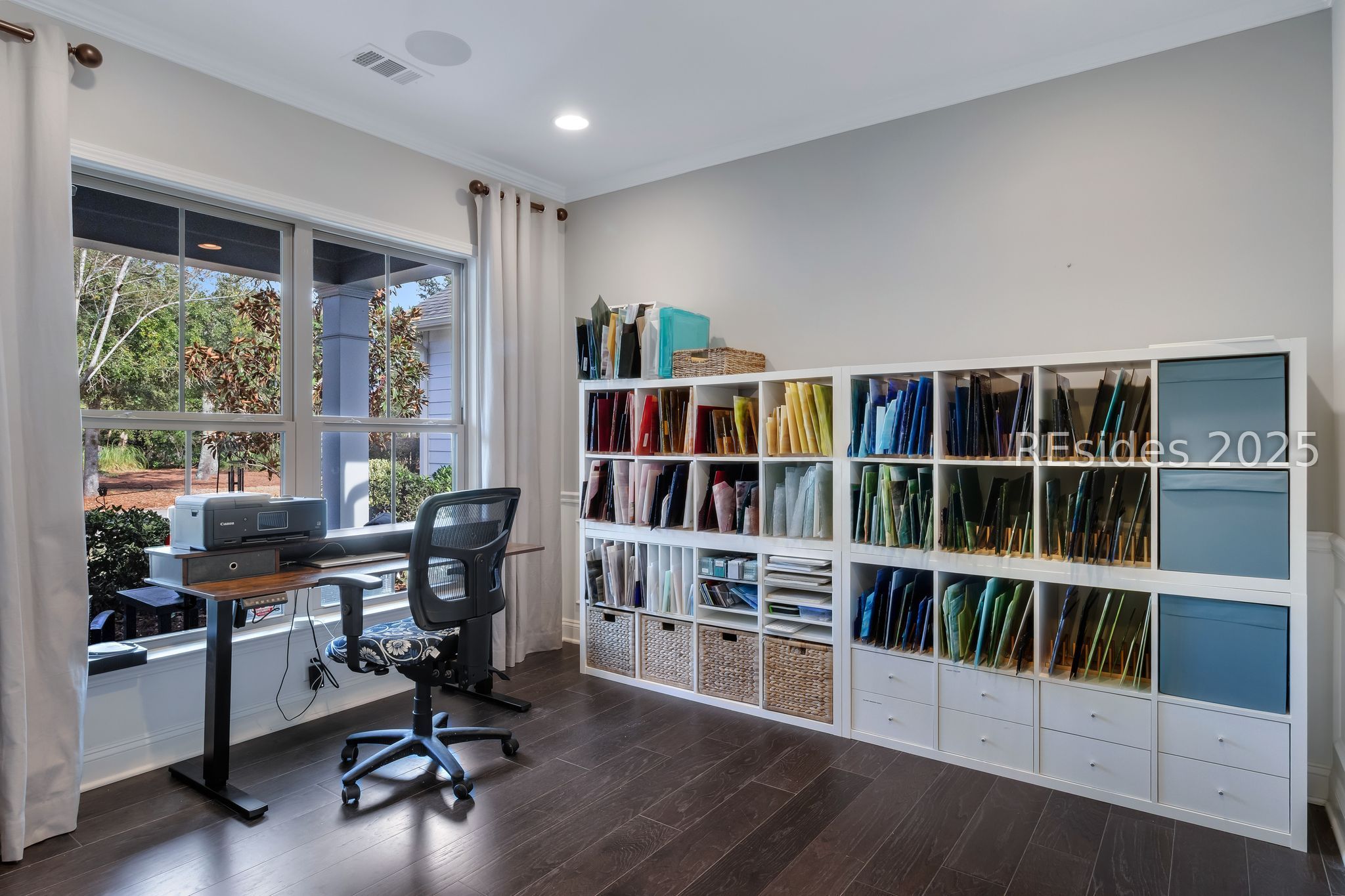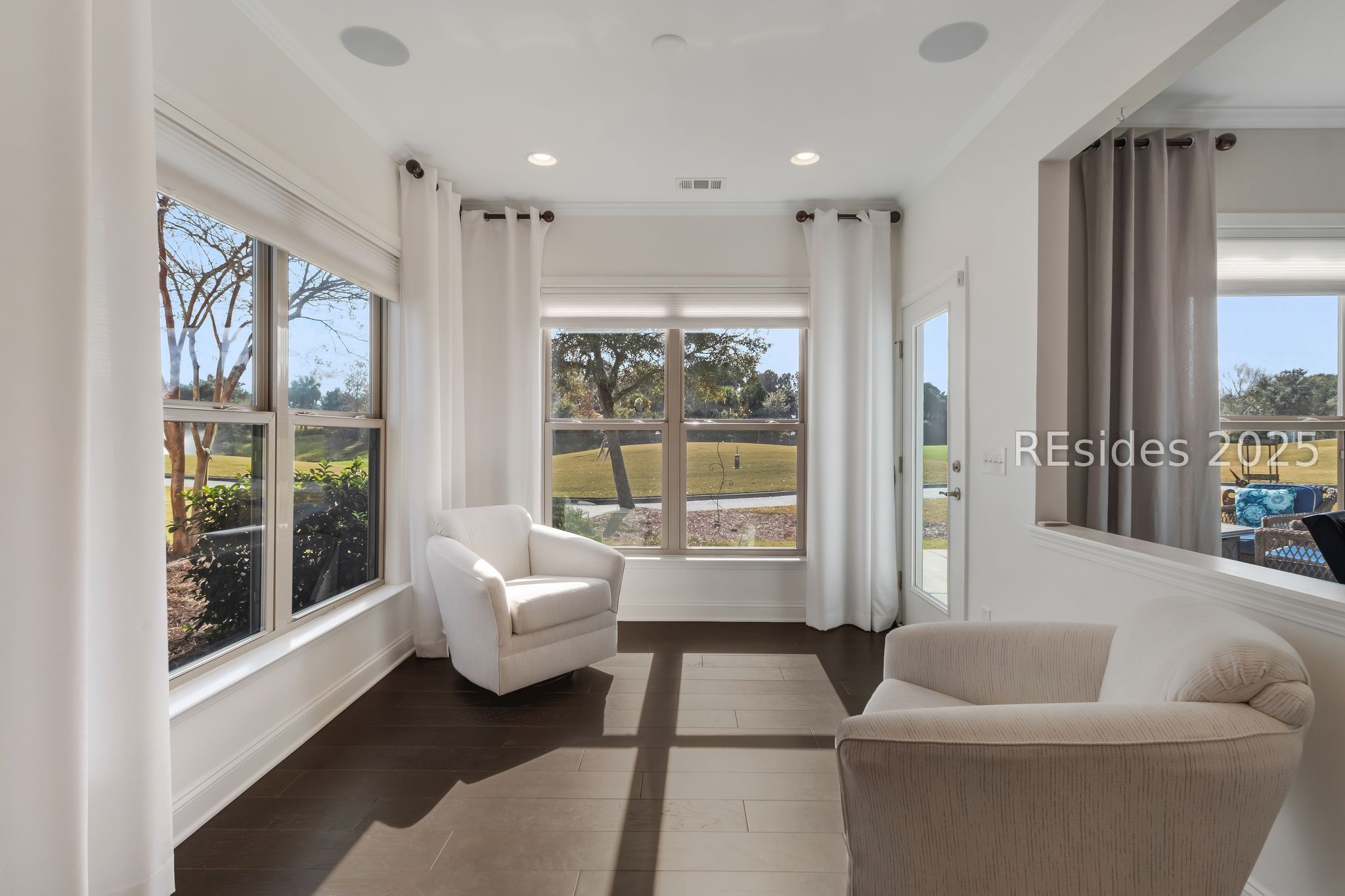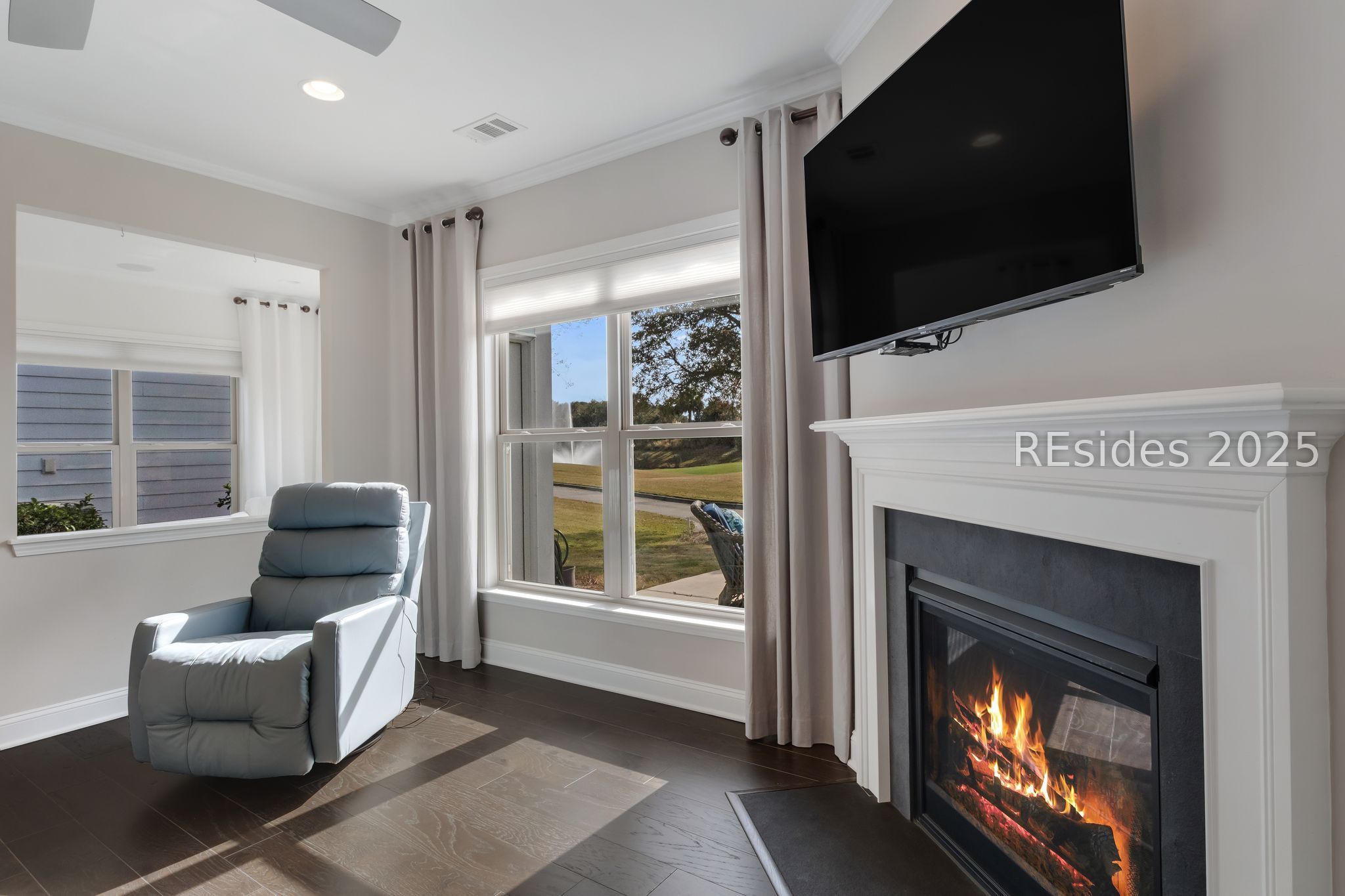 Welcome to this bright & beautiful Castle Rock model home with a spacious loft in Sun City! Situated on the 11th hole of the Argent Golf Course, it offers pristine fairway and lagoon views right from your backyard or carolina room. The interior is very bright & airy, featuring tons of natural light throughout, complementing the wood floors and crown molding found in the main areas. The home also boasts a true gourmet kitchen, featuring a full beverage station with wine cooler and sink as well as top-tier stainless steel appliances including gas range and double ovens. Relaxing is easy with a warm gas fireplace in the living room and built in surround sound speakers wired throughout the entire home. Practicality is also covered with an oversized 2-car garage with extra storage, extra large closets, and a tankless water heater. A significant bonus is the location in Beaufort County, offering lower property taxes. This move in ready home combines great features with an excellent setting.