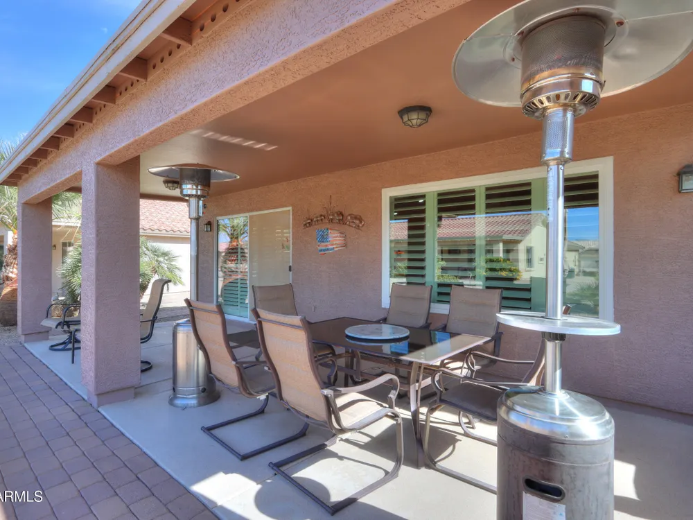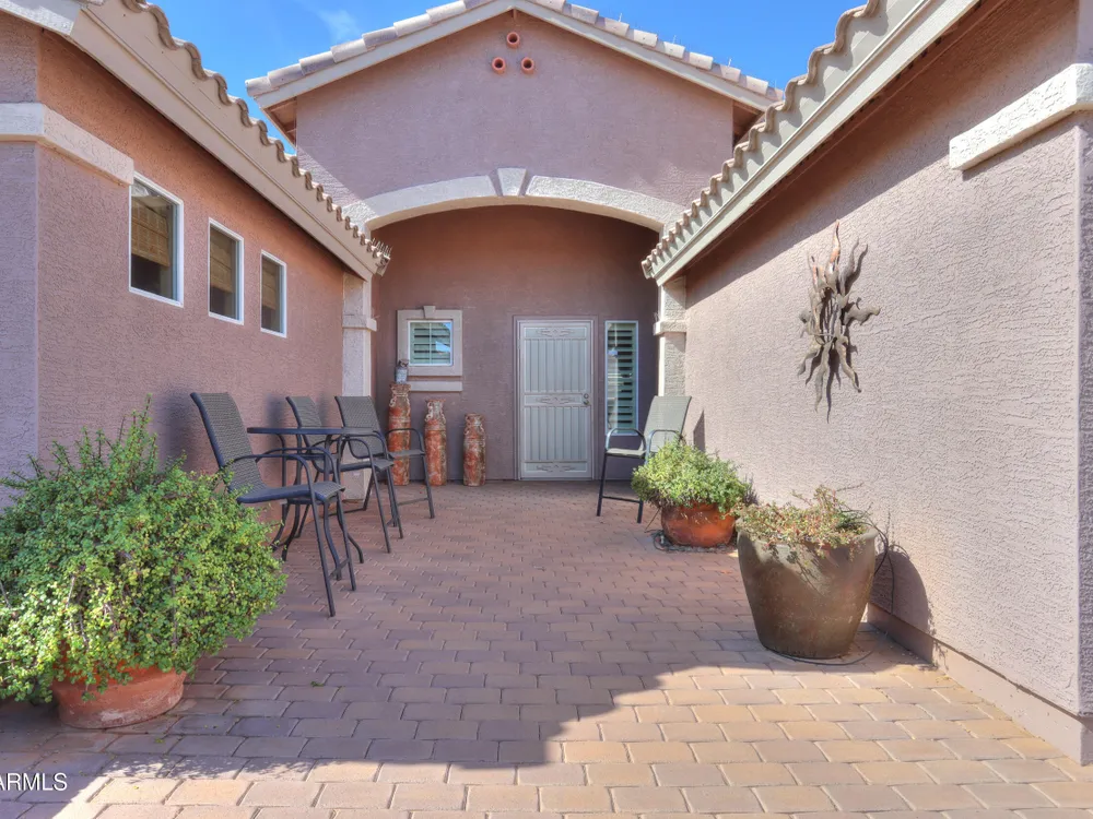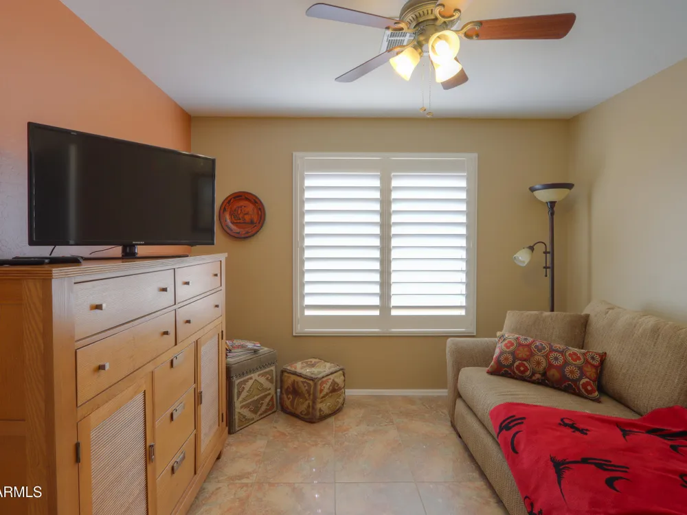 This gorgeous 2 bed, 2 bath + den home in the highly desirable Mission Royale Active Adult community is packed with upgrades! Enjoy the ceiling fans, plantation shutters and stunning diagonal tile throughout. The recently replaced windows, water heater, and HVAC will give you the peace of mind you are looking for in a new home. The spacious kitchen features stainless steel appliances, lots of cabinet space and an eat in bar, plus reverse osmosis! The primary suite offers elevated countertops and toilet, and a dual-sink vanity. Outdoor spaces shine with an extended front patio with pavers and an extended back patio with epoxy flooring and pavers. The extended garage includes epoxy flooring and a utility sink. Even pigeon netting and a re-coated patio roof are done—move in and relax!