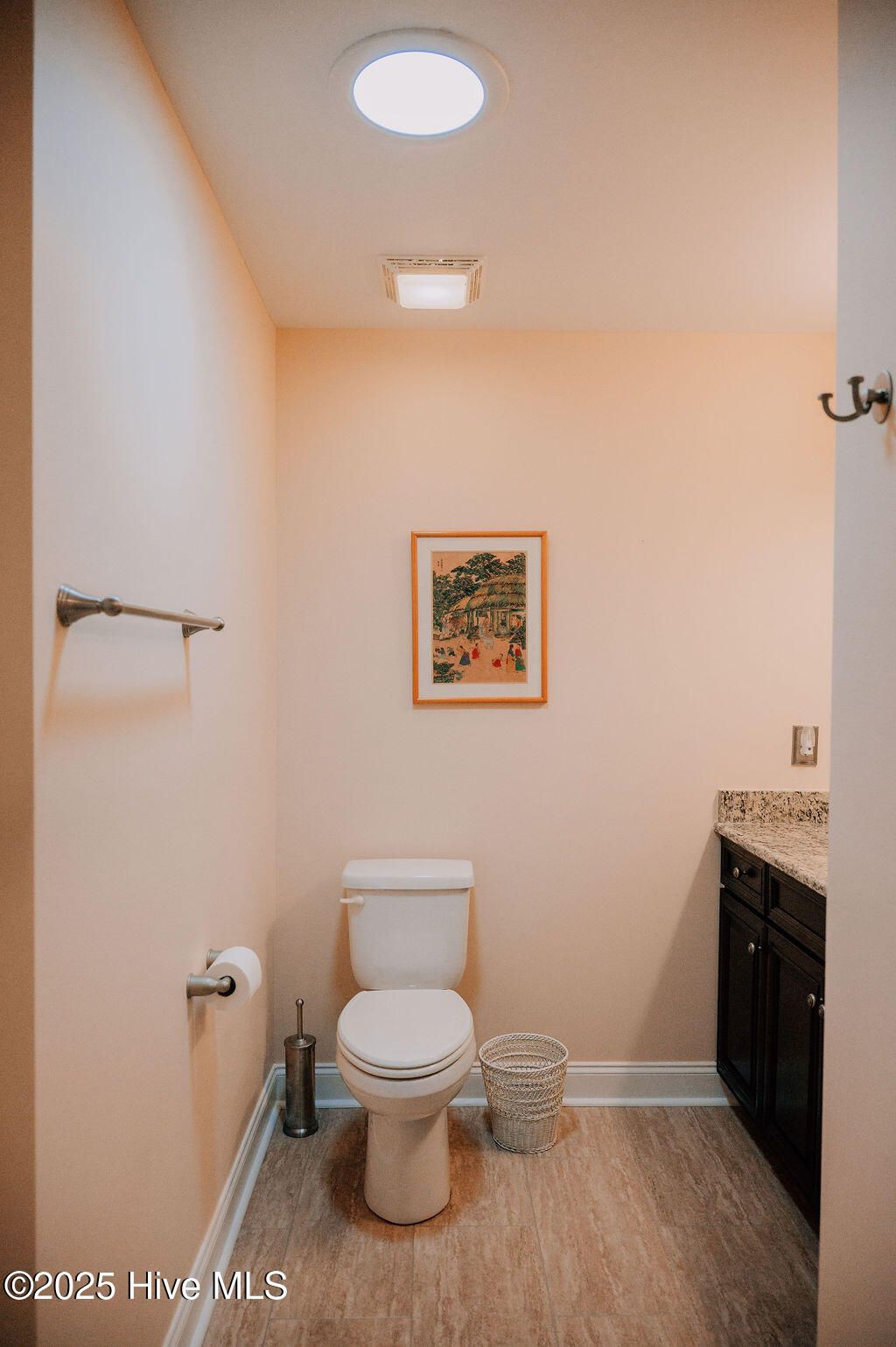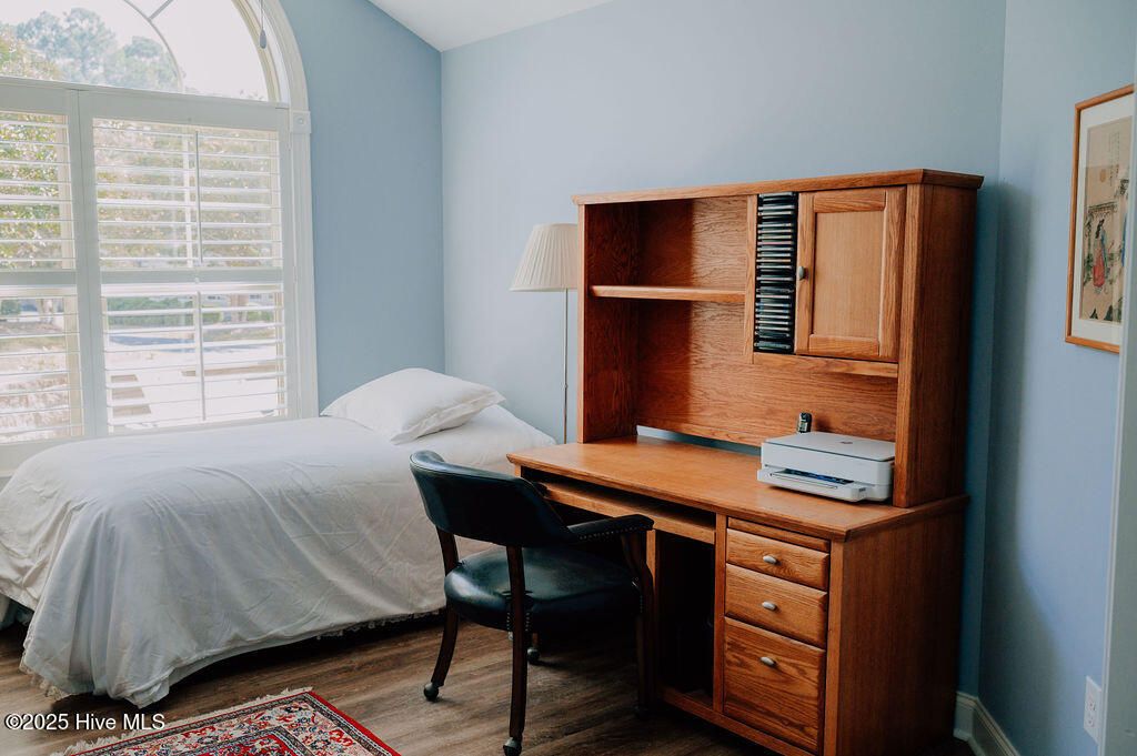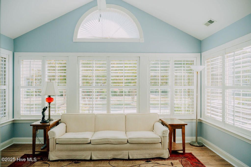 A bright cathedral sunroom with palladium window serves as a versatile space for hobbies, reading, or relaxing. A flex space in use as an office is just off the dining area, facing the front patio. The living room has a gas fireplace with granite surround visible from several rooms, adding warmth and ambiance to the main living areas. Laminate flooring extends through the main level living spaces and bedrooms. Upstairs, a third bedroom and full bath provide a quiet retreat for guests.