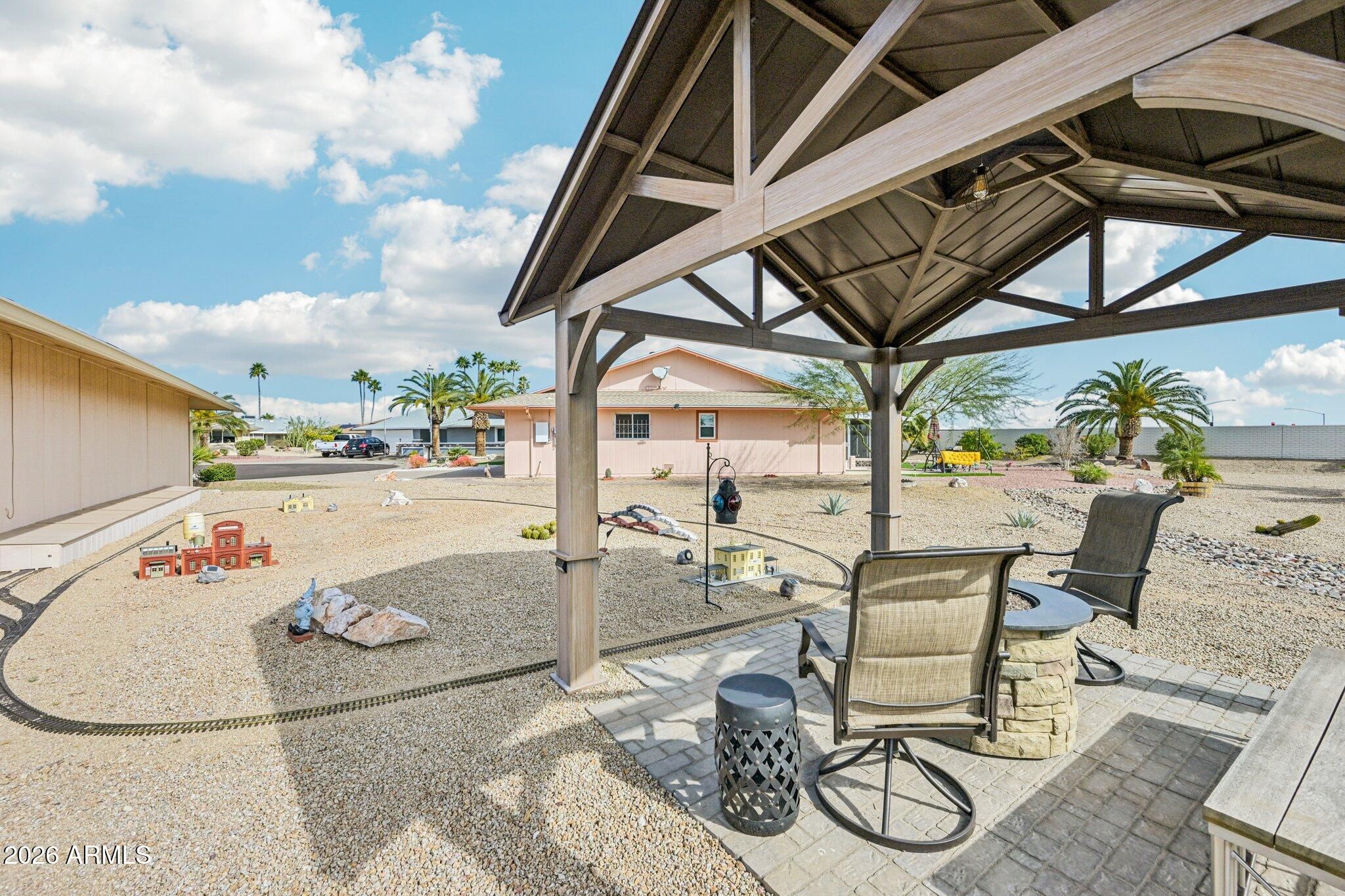 This home is located on a quiet cul-de-sac. The home features neutral tile and carpet throughout, along with an updated kitchen showcasing stone inspired countertops, a tile backsplash, and a dinette area perfect for casual dining. There is an oversized laundry room, which is ideal for use as a home office or hobby room. Enjoy outdoor living with a covered back patio, a distinctive free-standing gazebo, plus a rooftop deck offering 360-degree mountain views—all exceptional spaces for relaxing, entertaining, or watching the stunning Arizona sunsets. The gazebo overlooks a model railroad that loops around the side of the home - a must see.