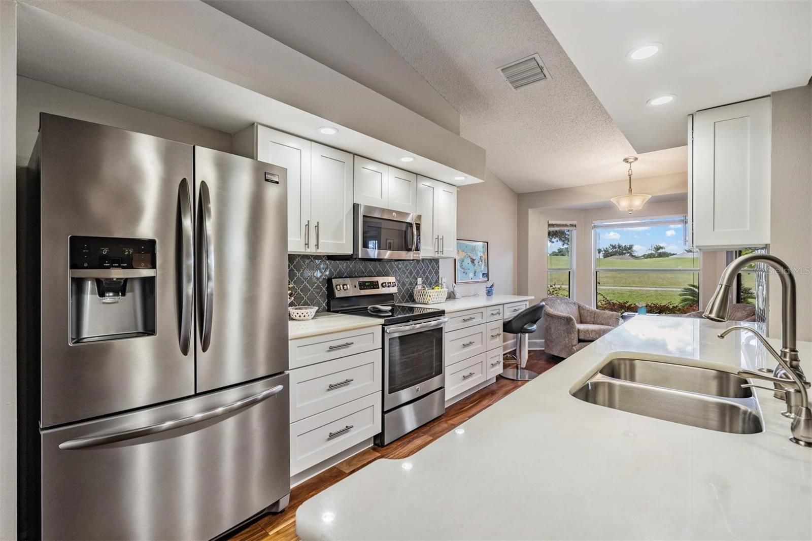 Enjoy stunning golf course views from your very own covered and screened lanai—a perfect place to relax and unwind. NEW ROOF 2016; NEW WASHER 2019; NEW WATER SOFTENER 2022; NEW CARPET 2022; NEW GARAGE DOOR OPENER 2022; NEW A/C 2025. Inside, the oversized great room offers an open, airy feel with engineered hardwood floors and a large picture window that fills the space with natural light while showcasing the lanai and golf course beyond. The remodeled kitchen is a true showpiece, featuring sleek stainless-steel appliances, a breakfast bar for casual dining, crisp white cabinetry, elegant Italian Carrara Marble countertops, and a cozy breakfast nook with views that make every morning special. Designer touches, including Travertine tile, add sophistication throughout the home. The thoughtful floorplan offers a large bonus space that could be a dining area or anything else you would like it to be. This area adjoins the great room, making entertaining seamless. A neutral color palette throughout provides the perfect backdrop for your personal style. Retreat to the expansive master suite, large enough for a sitting area, with a beautifully remodeled bath that boasts an oversized step-in shower. The secondary bedrooms are generously sized and designed to impress. Step outside and experience the comfort of the covered, screened lanai with peaceful golf course views—it’s the lifestyle you’ve been waiting for! 55 & FUN - LIVE THE HERITAGE SPRINGS LIFESTYLE - Resort style living at its absolute finest! Clubhouse with restaurant and bar, fitness, tennis, golf, cards, billiards, dancing and more! SUPERB TRINITY LOCATION, CLOSE TO BEACHES, DINING, SHOPPING, MEDICAL AND AIRPORT! Caution - Adults at Play!
