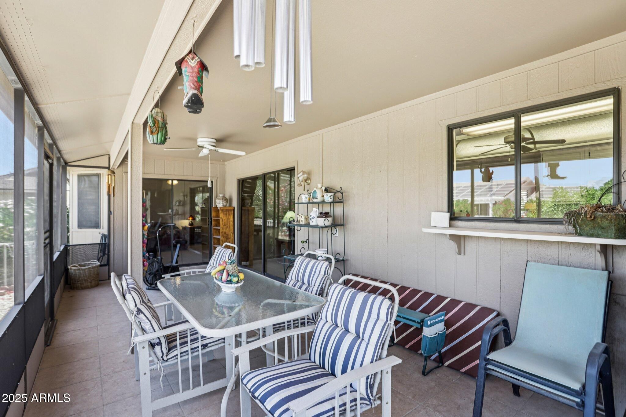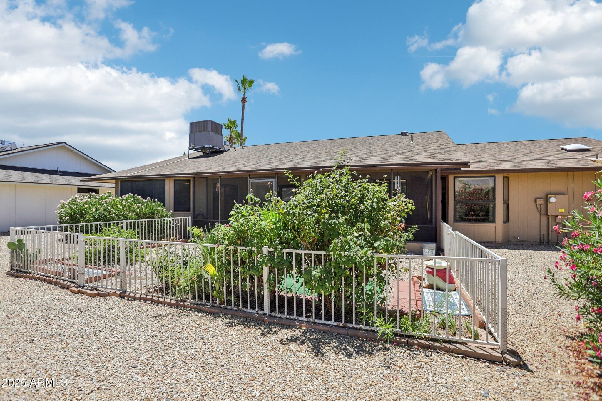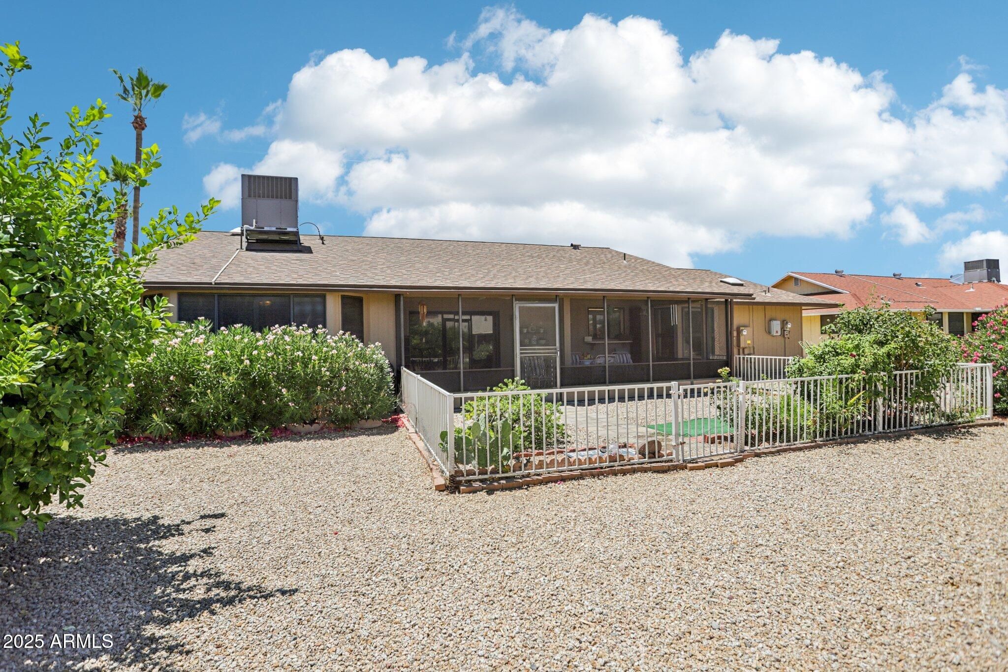 The Solar System is paid by seller at closing!!! This Sun City West home in the 55 plus adult community has an updated HVAC system (2021) and the roof (2018). Inside, you'll find plantation shutters throughout most of the home, vaulted ceilings, and bay windows that flood the home with natural light. The kitchen has granite countertops, a breakfast bar, and a cozy dinette area, and a built-in desk. Enjoy indoor-outdoor living with a fully screened-in patio, ideal for entertaining or relaxing in comfort. Just beyond is a fenced-in garden space with rose bushes and a pet-friendly artificial grass area. Enjoy lemons and tangelos right from your own backyard. Out front, a covered patio adds charm and curb appeal. The garage has a separate AC unit.