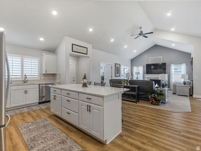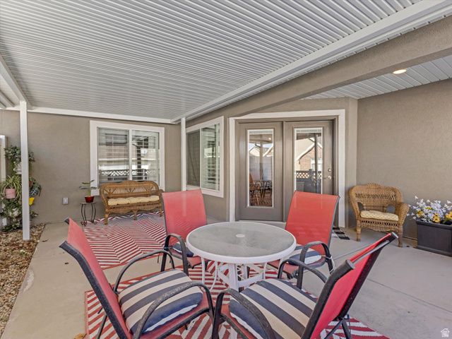 Rare opportunity to own a beautiful home in Midas Creek Villas, Herriman's premier 55+ community. Ideally located near The District for convenient shopping and dining, University of Utah Health Jordan Valley, and with easy access to Mountain View Corridor, this home offers both comfort, convenience and connectivity throughout the valley. This clean, spacious, move in ready Grandview floor plan features an inviting open layout designed for effortless everyday living and entertaining. Step inside to a bright, open-concept kitchen, dining, and great room area highlighted by luxury vinyl flooring, soaring ceilings, and plantation shutters that add elegance and privacy throughout.The beautifully appointed kitchen includes white cabinetry, quartz countertops, stainless steel appliances, and a large pantry. The adjoining living room offers a cozy gas fireplace, creating the perfect space to relax or gather with friends and family. An additional bedroom and dedicated office space are conveniently located just off the main living area. The generous dining area opens to a private, fully fenced and covered patio-ideal for outdoor dining, entertaining, or enjoying a peaceful morning retreat. The oversized owner's suite is a true sanctuary, featuring a spa-like ensuite bath with dual sinks, a soaking tub, a separate walk-in shower, and a spacious walk-in closet. A third bedroom is tucked at the end of the hall next to a second full bathroom, providing easy access and privacy for guests. Additional highlights include a large laundry room with built-in shelving and cabinetry, and an extra-deep two-car garage offering ample space for vehicles, storage, or a workshop. The community itself is beautifully maintained with lush landscaping and stunning mountain views. Residents enjoy exceptional amenities including a large recreation center, fitness room, theater room, and pool, along with regular social gatherings and events that foster a warm, welcoming atmosphere. Don't miss your opportunity to experience peaceful, low-maintenance living in a vibrant community where neighbors become friends. This is more than just a home-it's a lifestyle waiting for you.
